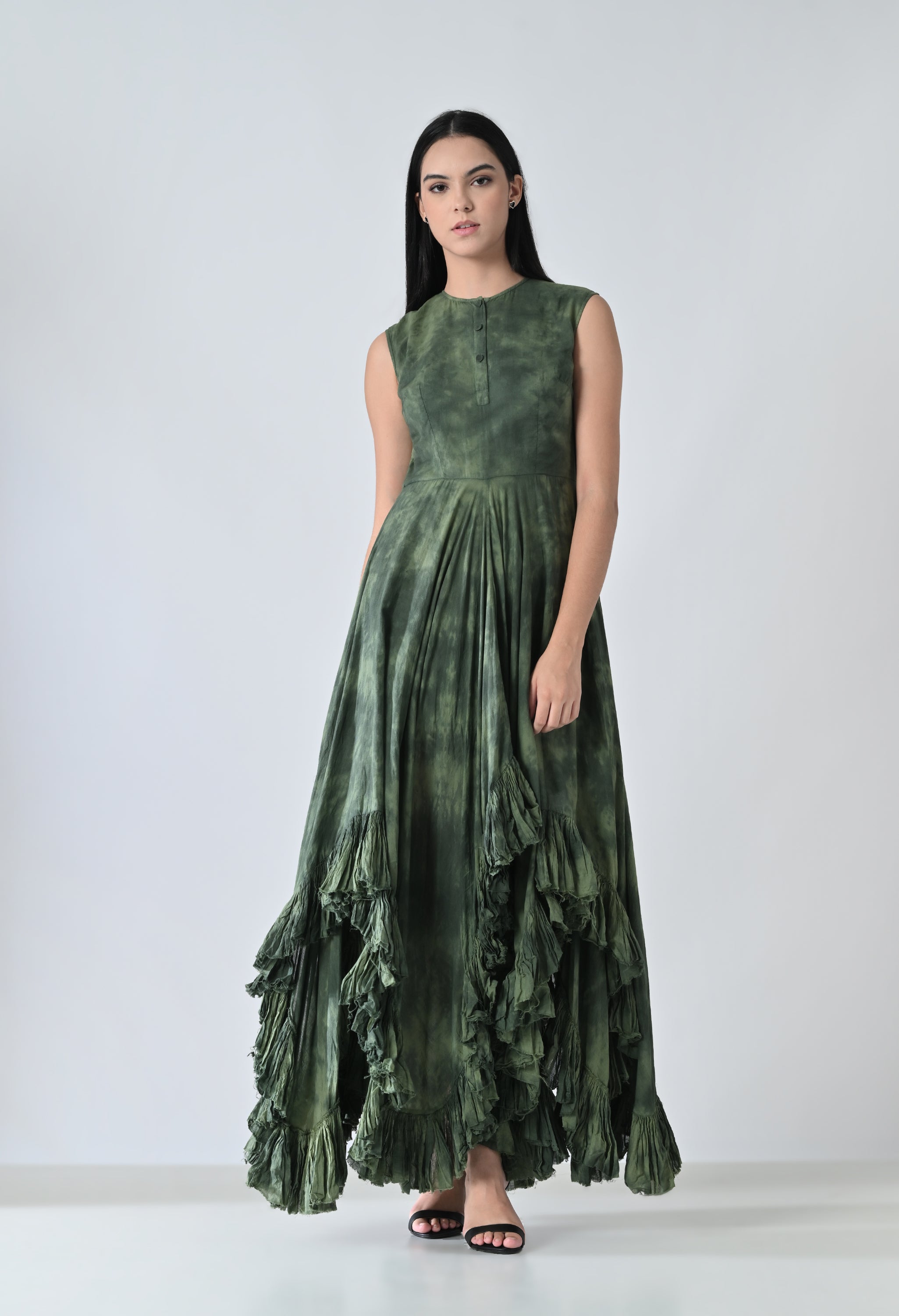 Green Forest Cascade Ruffled High Low Printed Dress