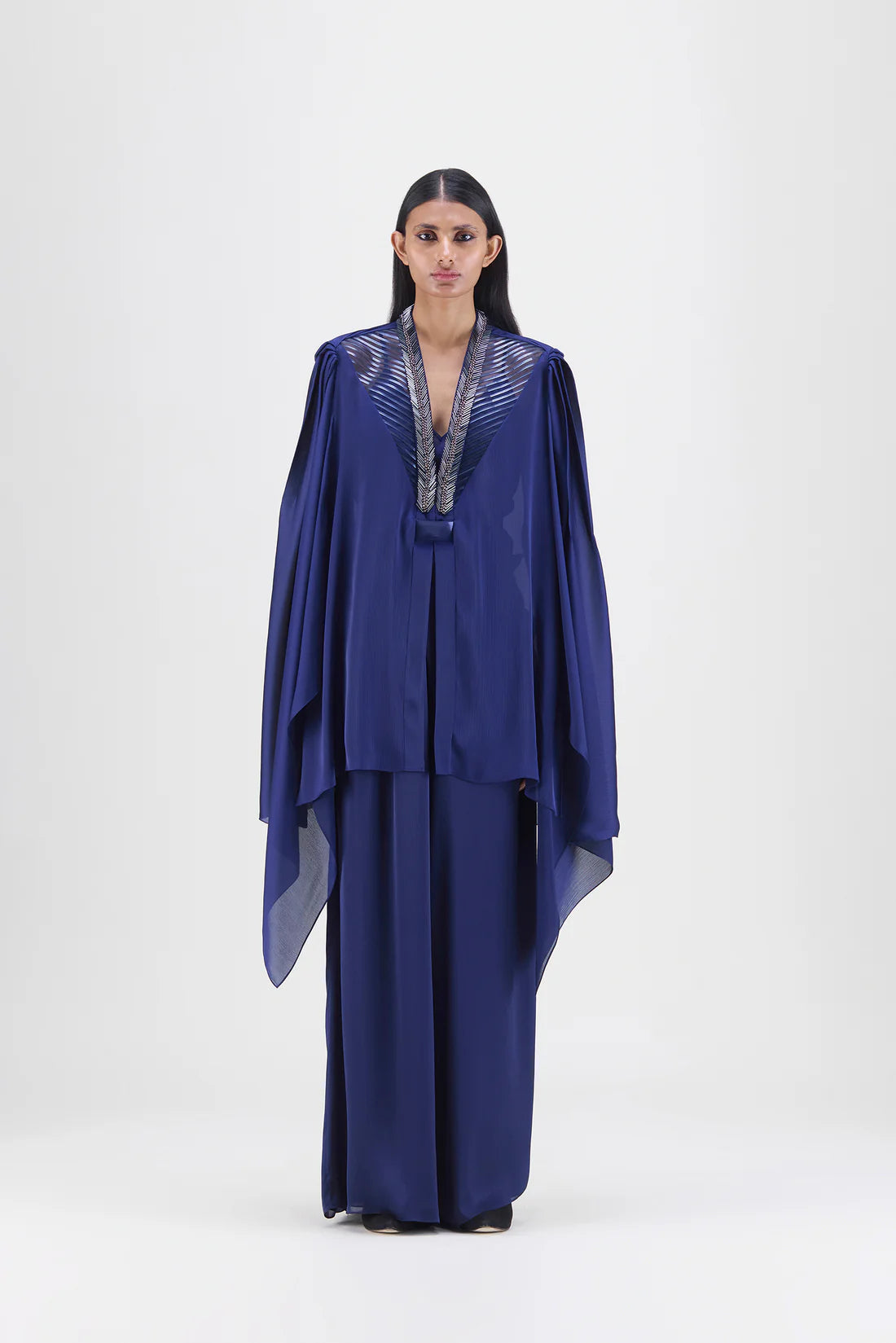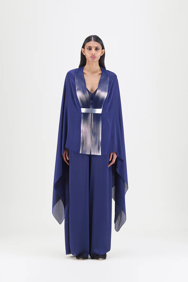 Cosmos Blue Satin Chiffon Pleated Layered Dress