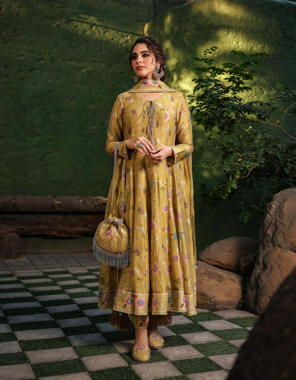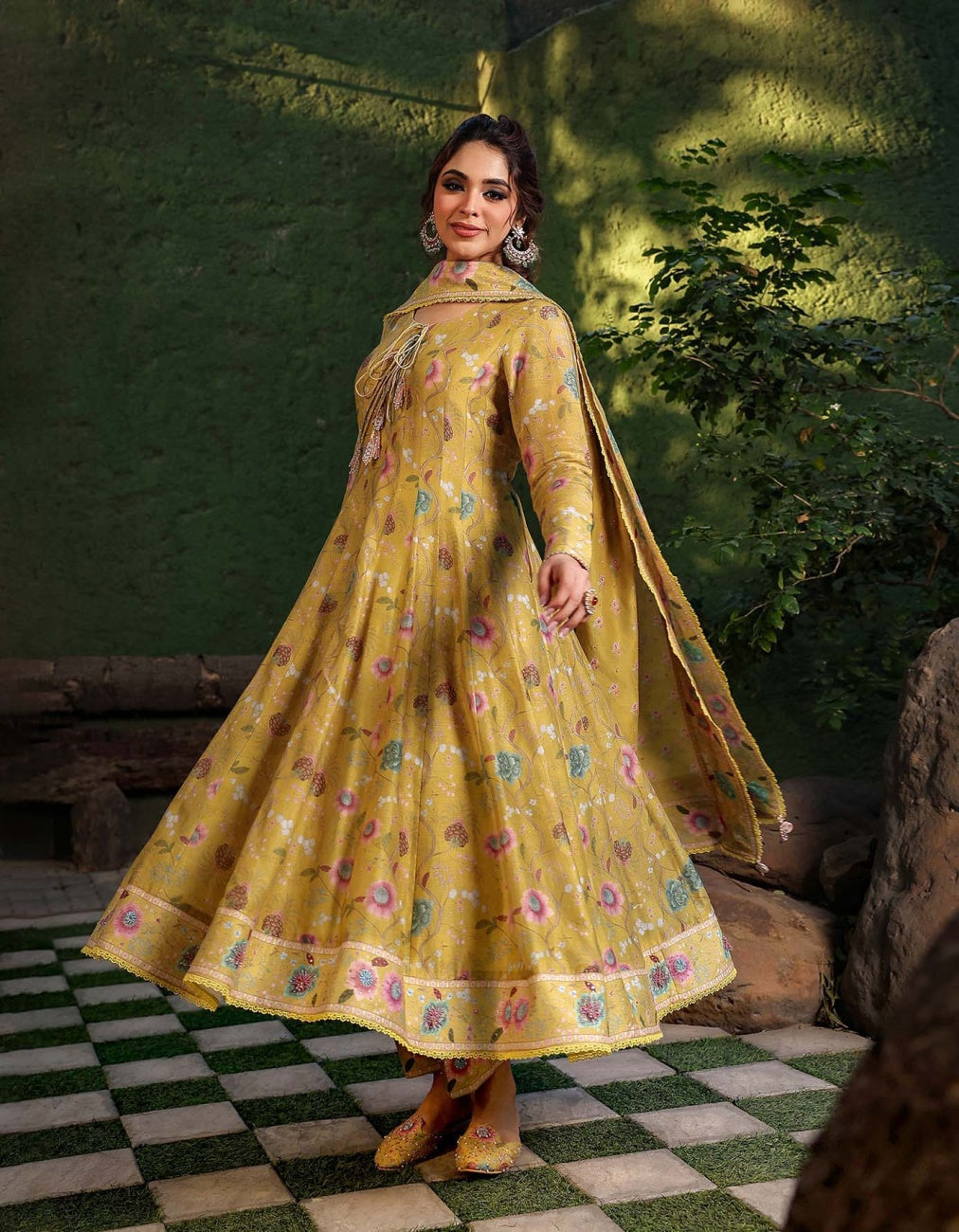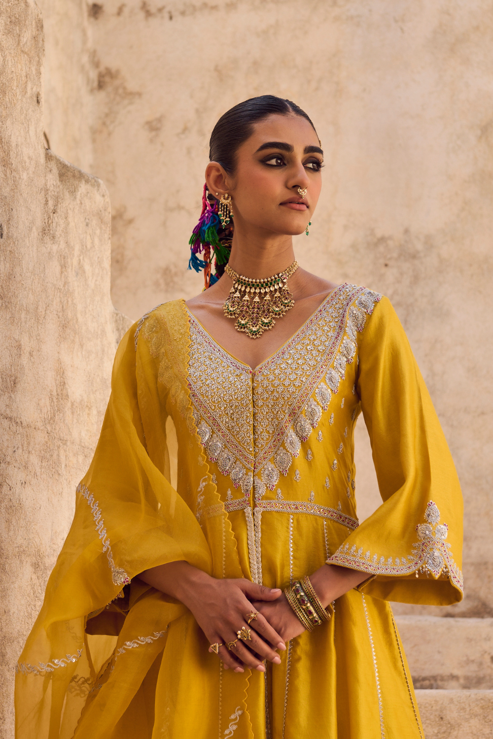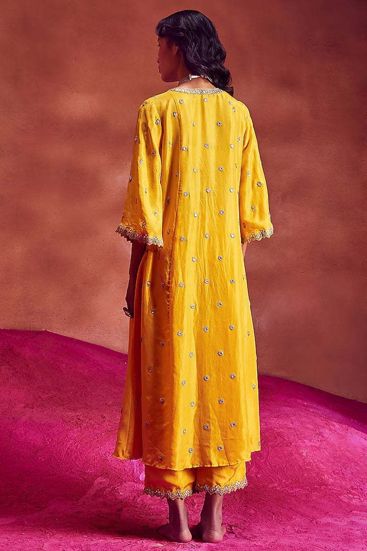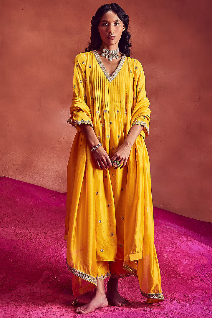 Yellow Silk & Organza Embroidered Anarkali Set