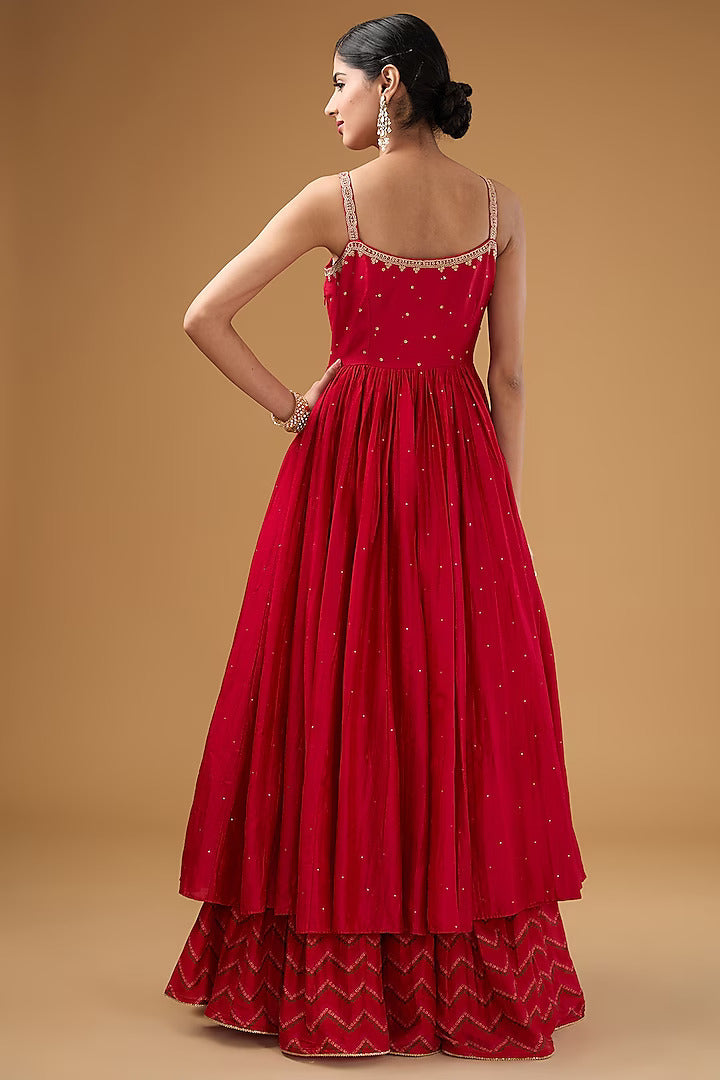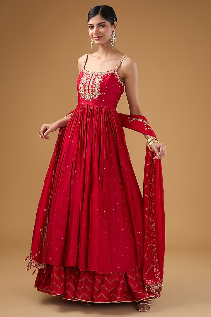 Red Chanderi Silk & Organza Silk Anarkali Set