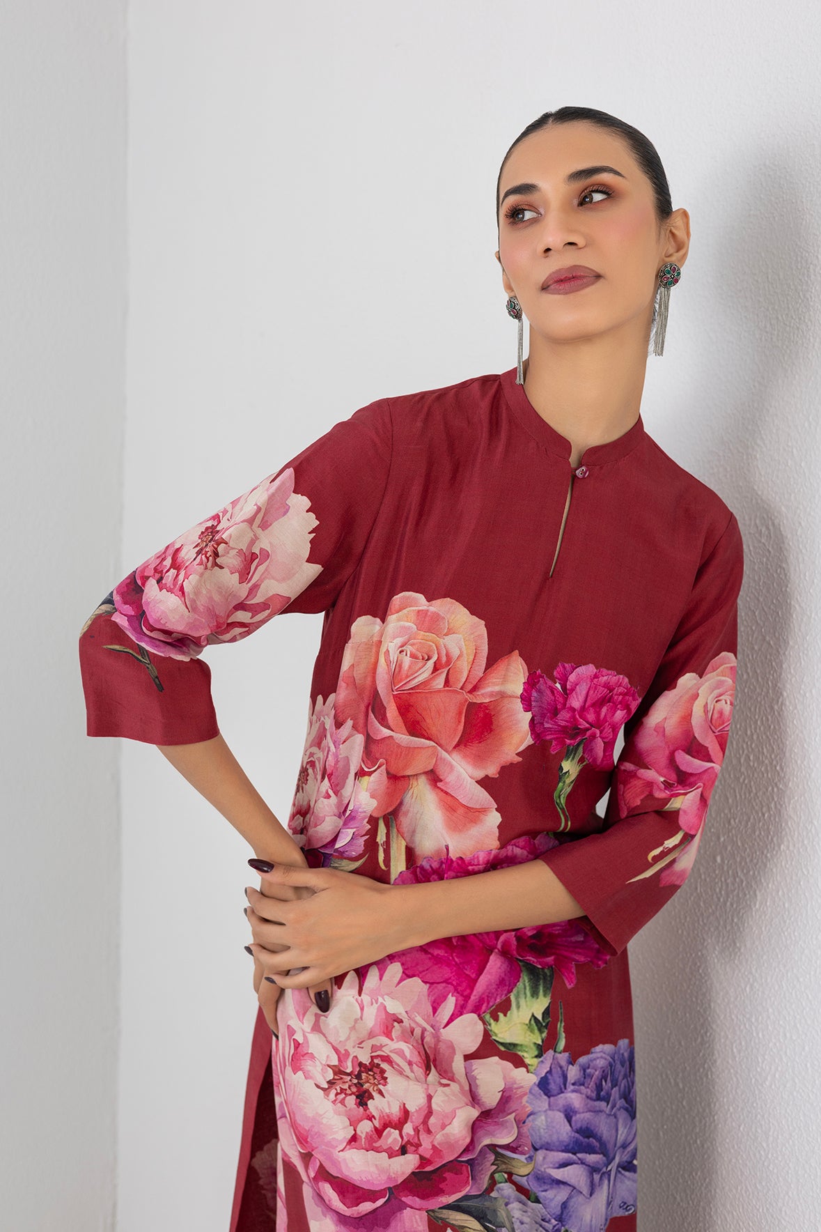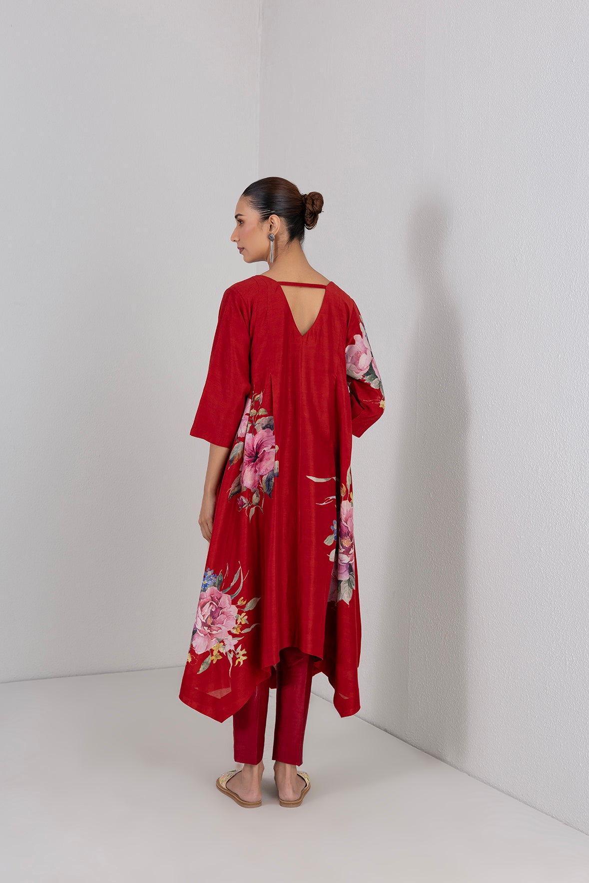 Poppy Blaze Red Dupion China Rose Printed Tunic