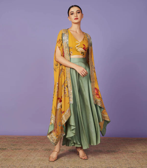 Yellow Organza Pearl Embroidered One-Shoulder Cape Set
