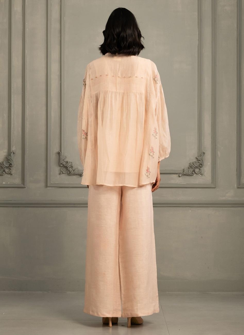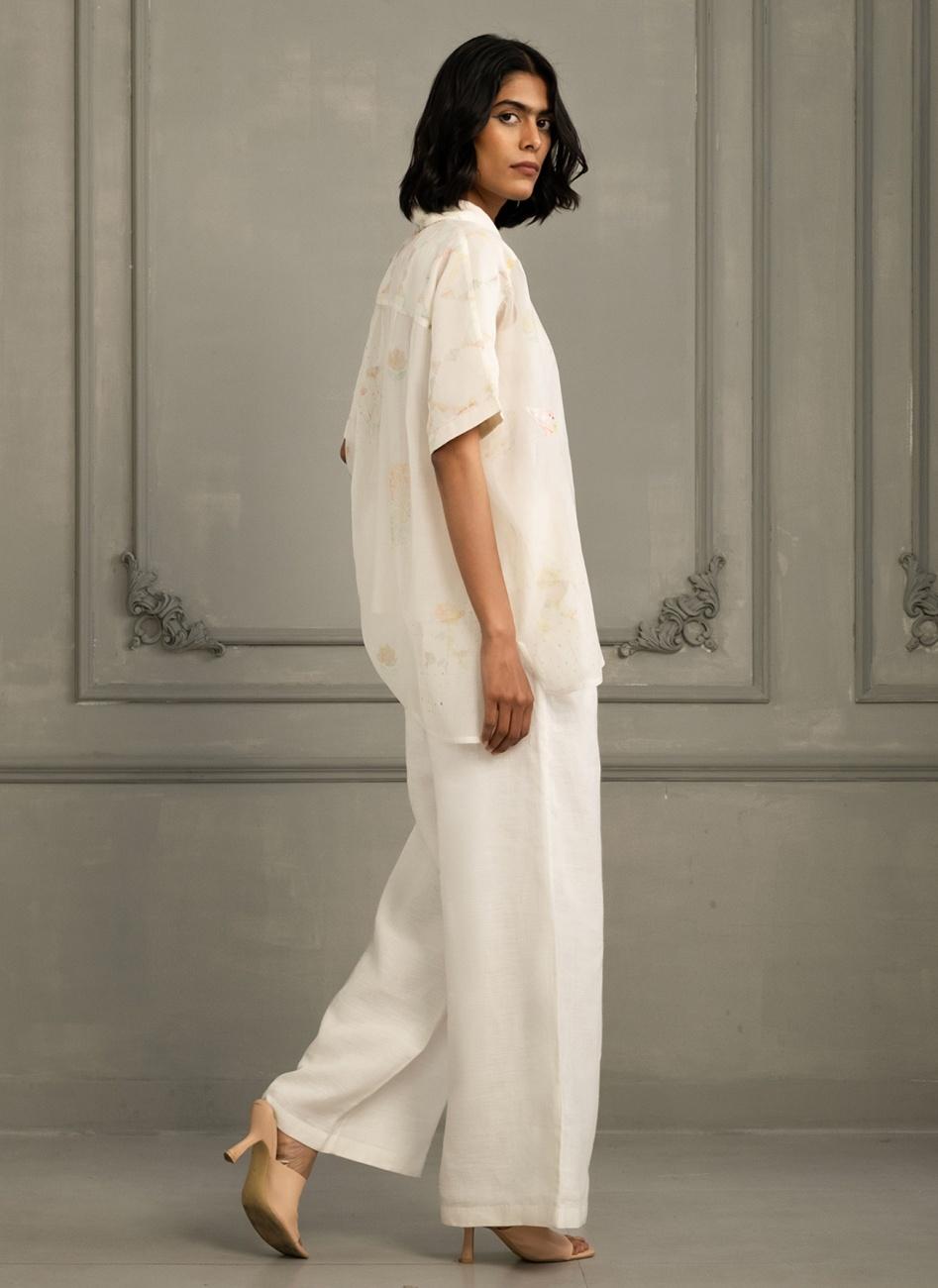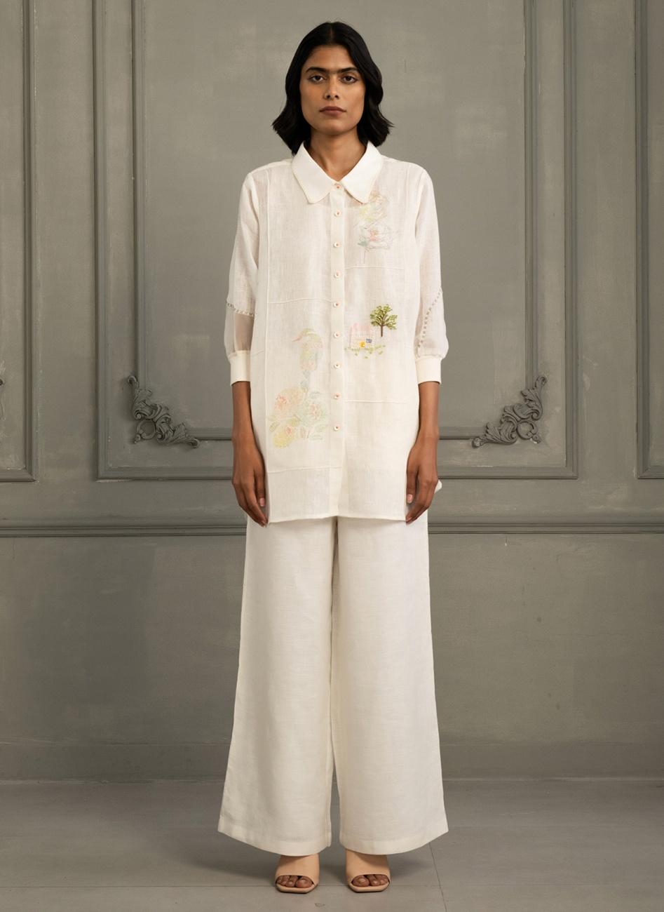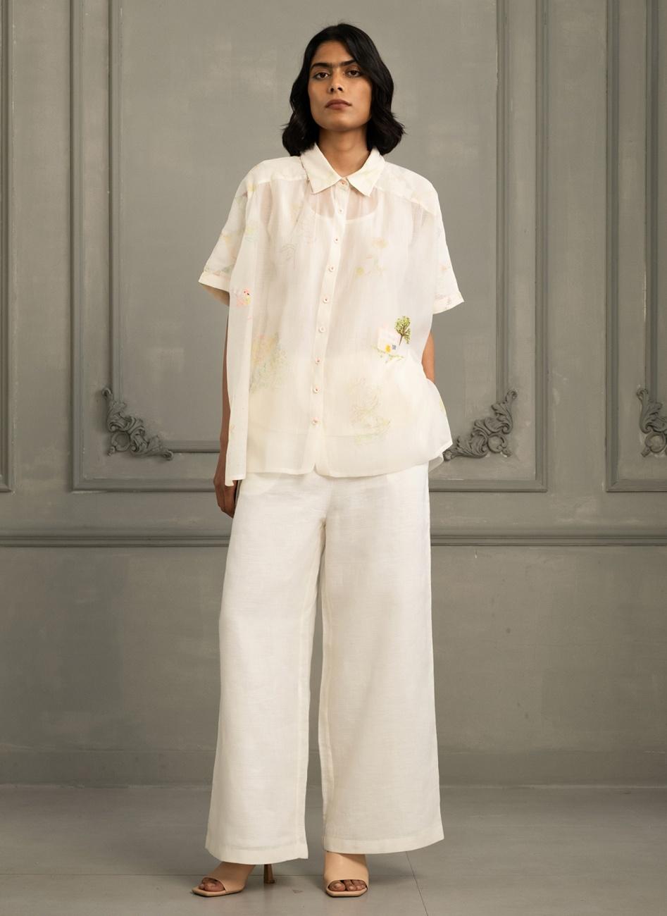 Ivory Shirt In Gauze Linen with Embroidery & Flared Pants In Linen