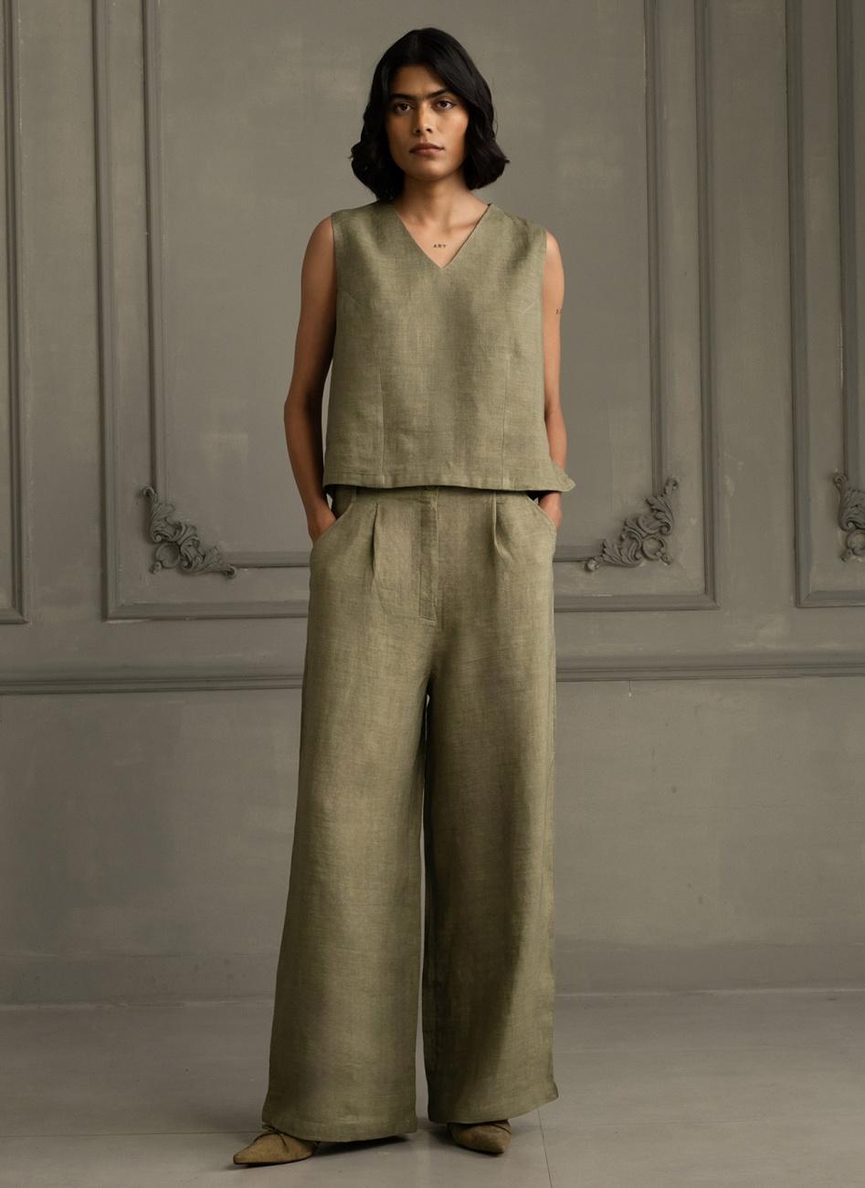 Luxurious Moss Green Linen Tunic Set: Double Layer, Embroidered Sleeves, Unique Discharge Print