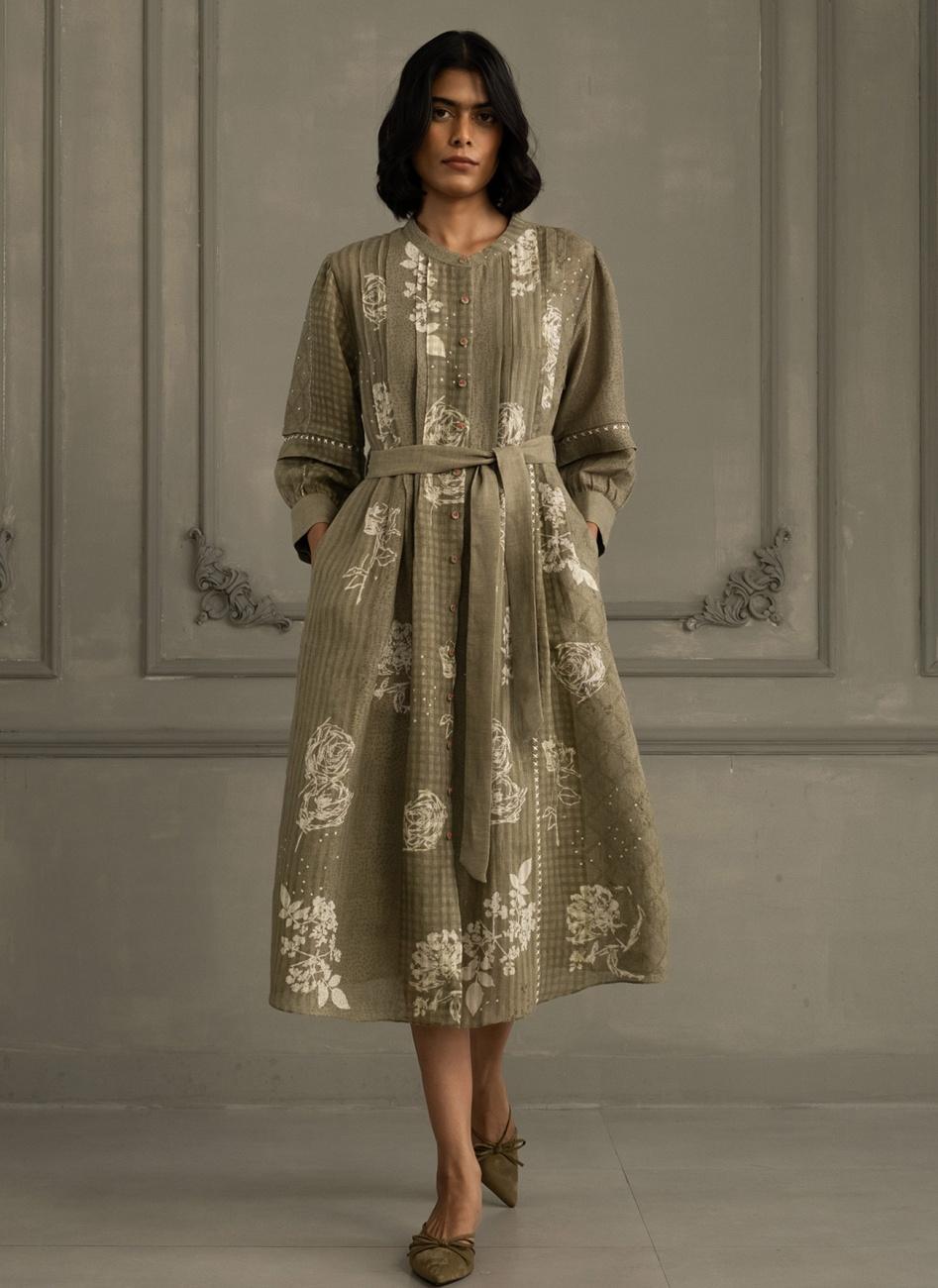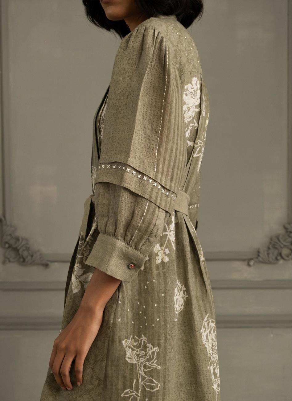 Sage Green Applique Work Jacket with Discharge Print Dress