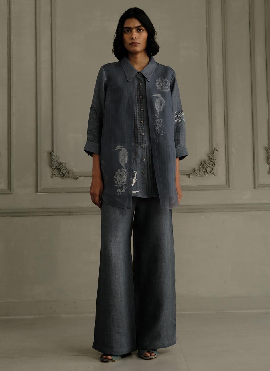 Luxurious Indigo Silk Chanderi Embroidered Jacket with Linen Flared Pants Set