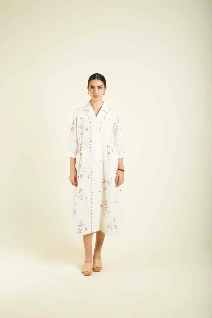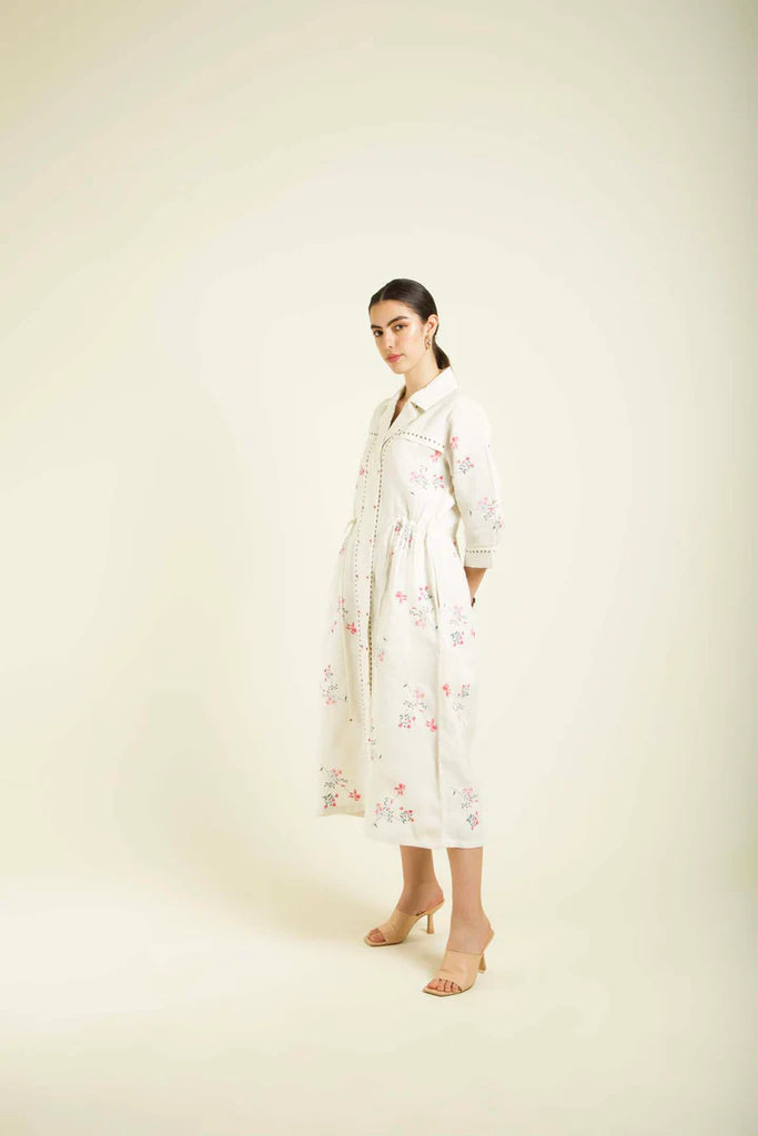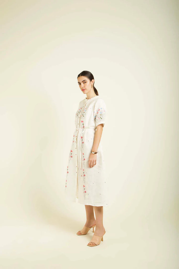 Elegant Indigo Rose Print Linen Dress with Hand Embroidery and Slip
