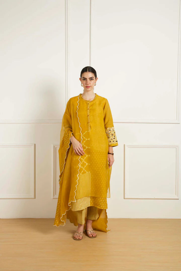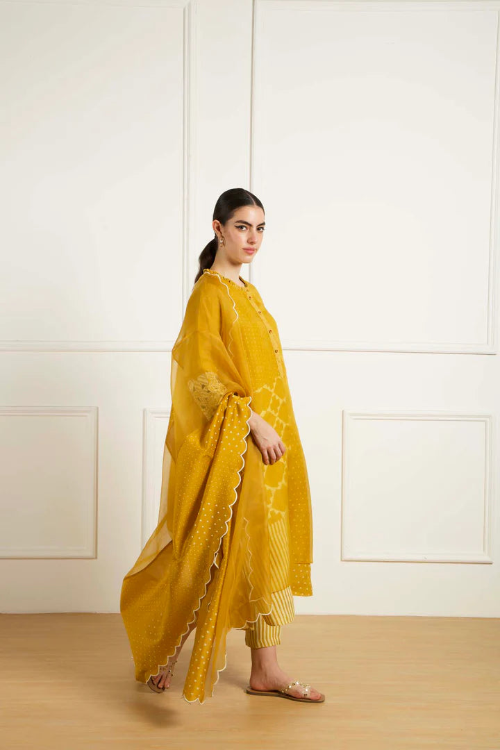 Ochre Discharge Print Tunic In Silk Chanderi With Dori Embroidery And Pants In Silk Chanderi