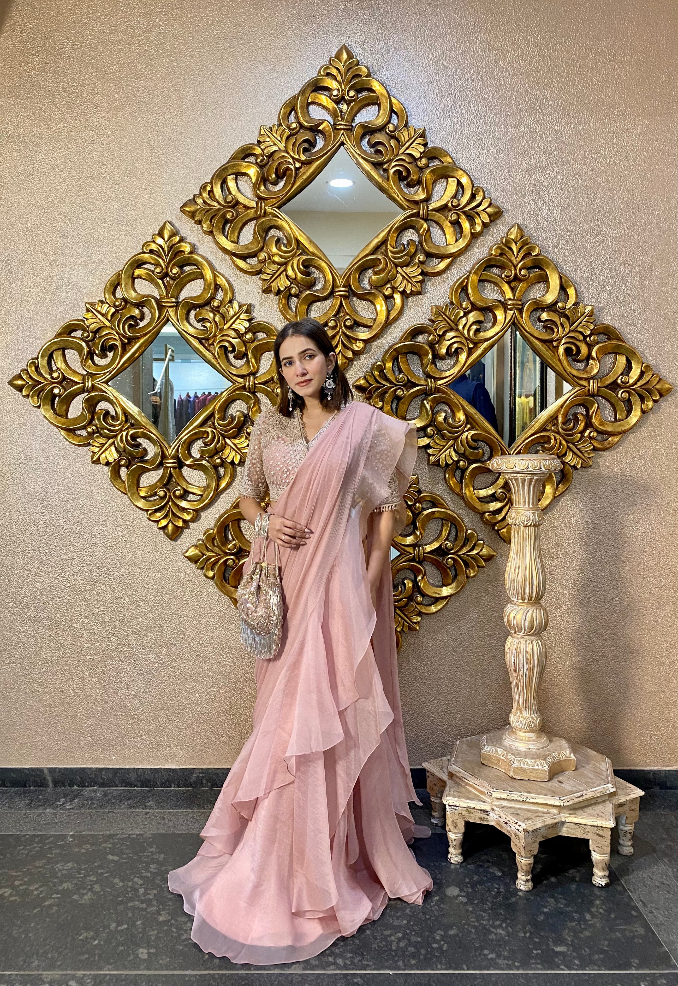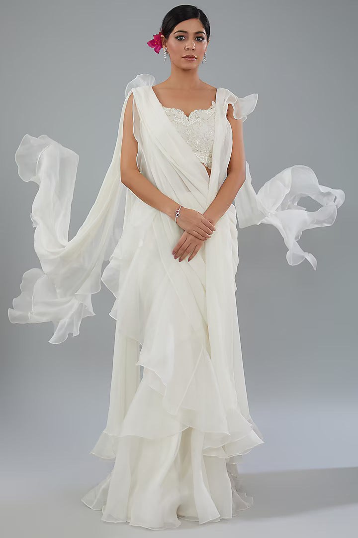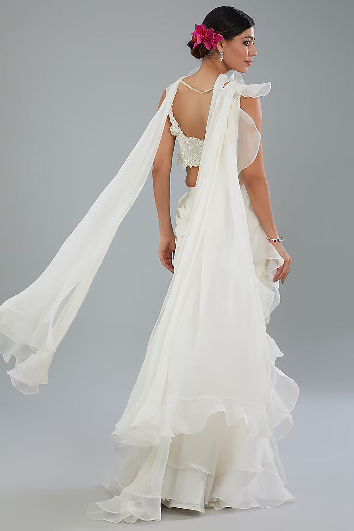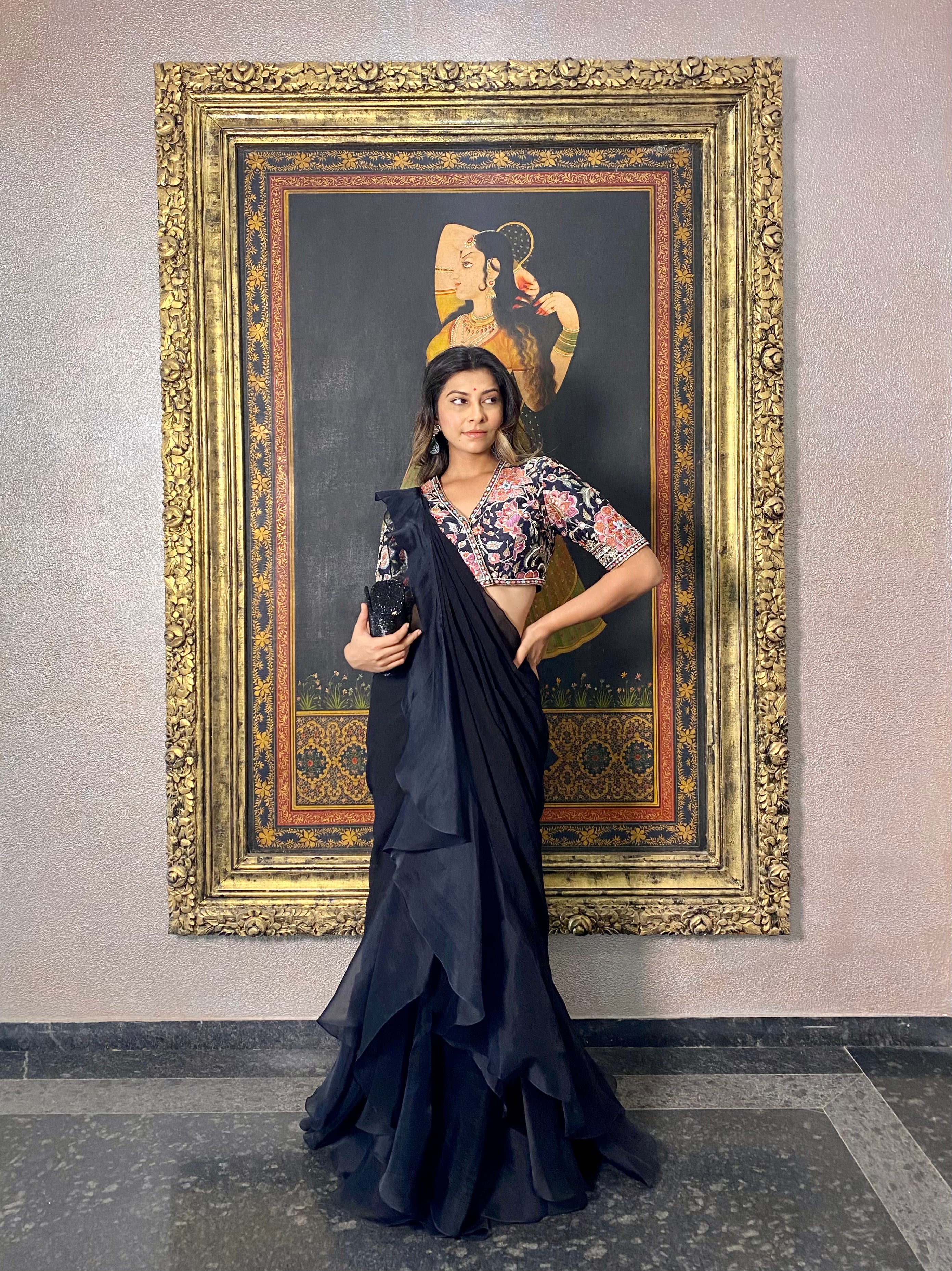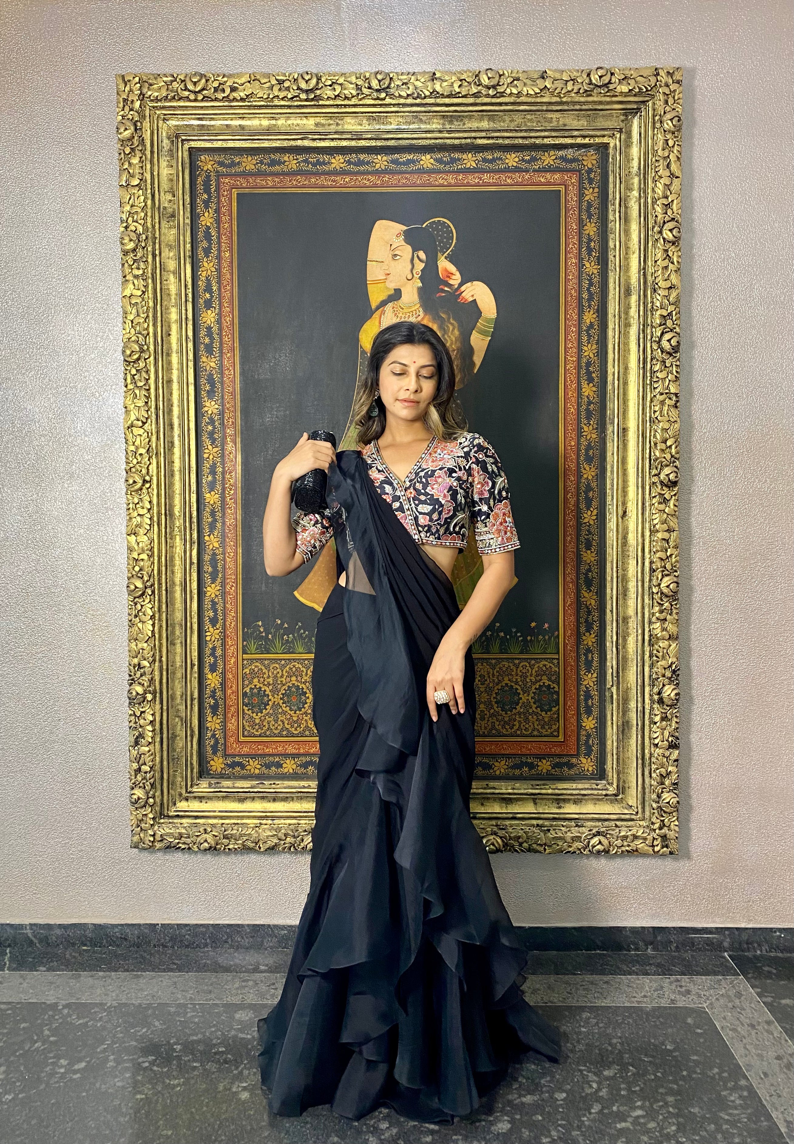 Black Chiffon & Organza Draped Ruffle Saree Set