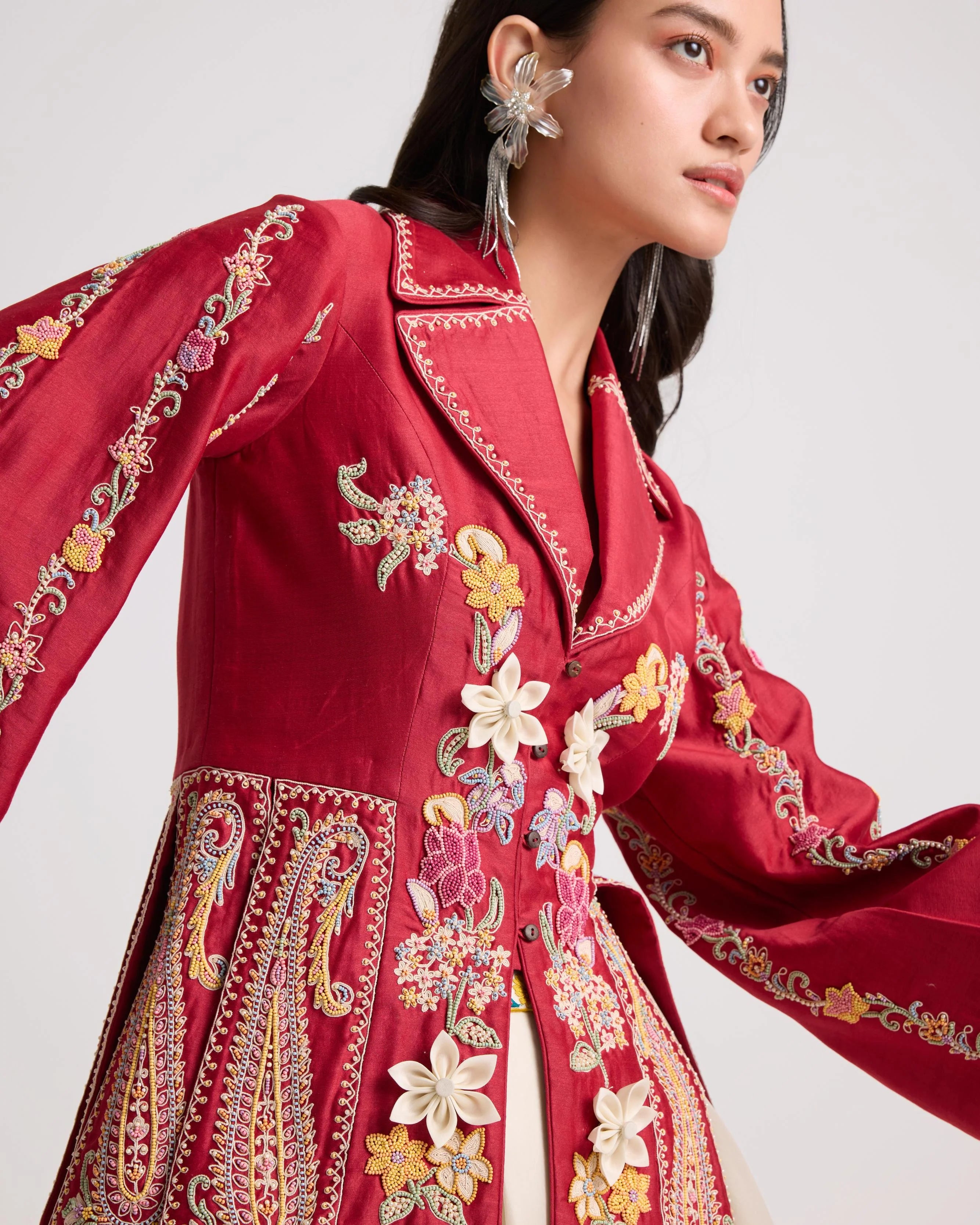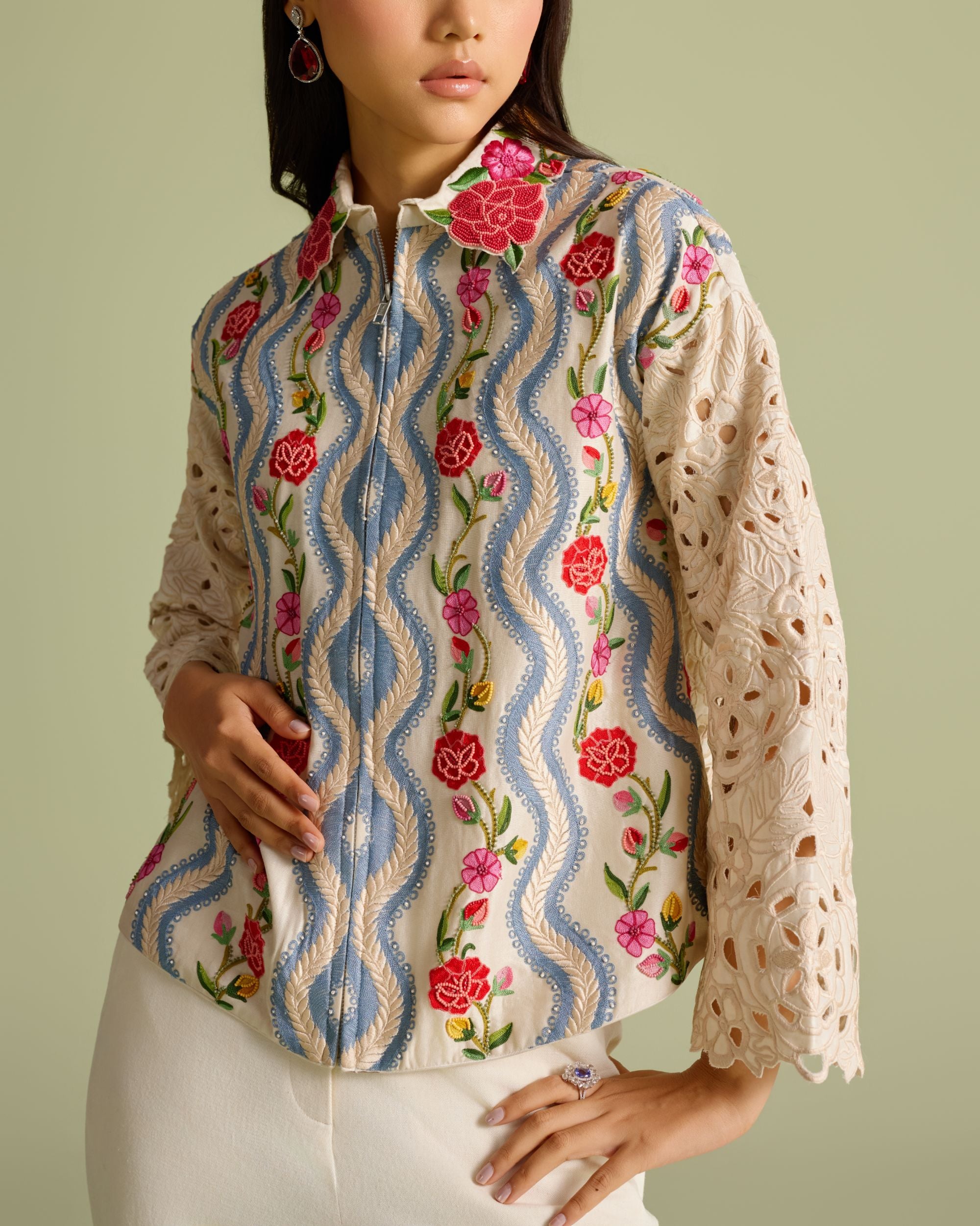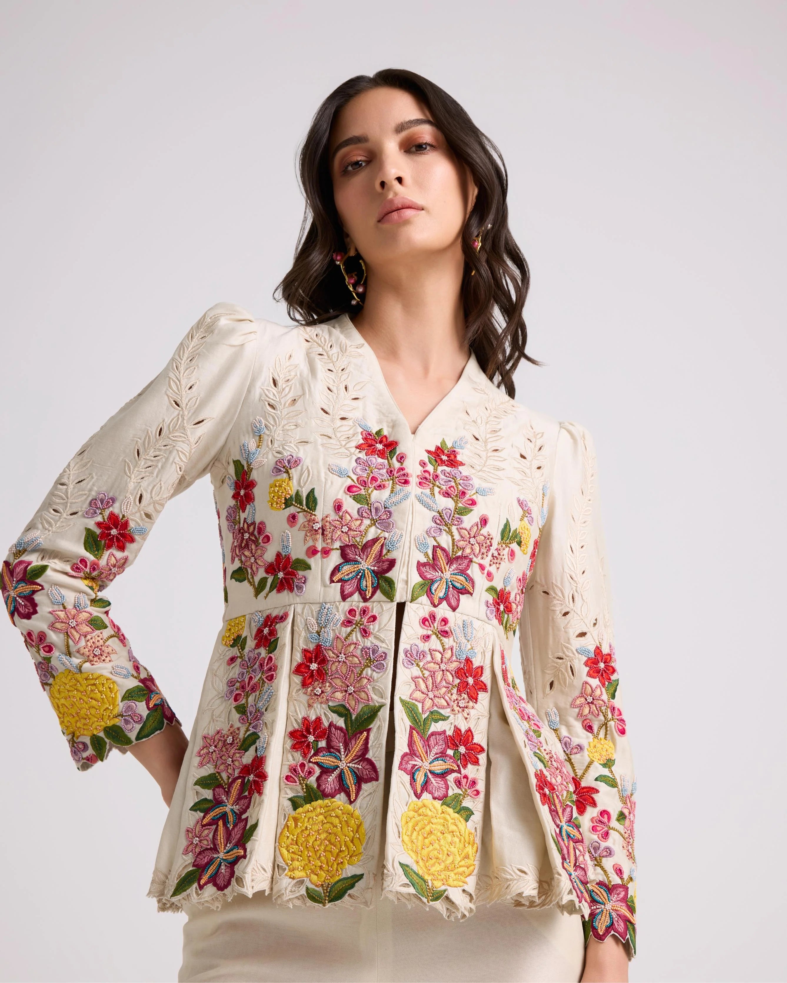 Ivory Floral Threadwork Pleated Jacket