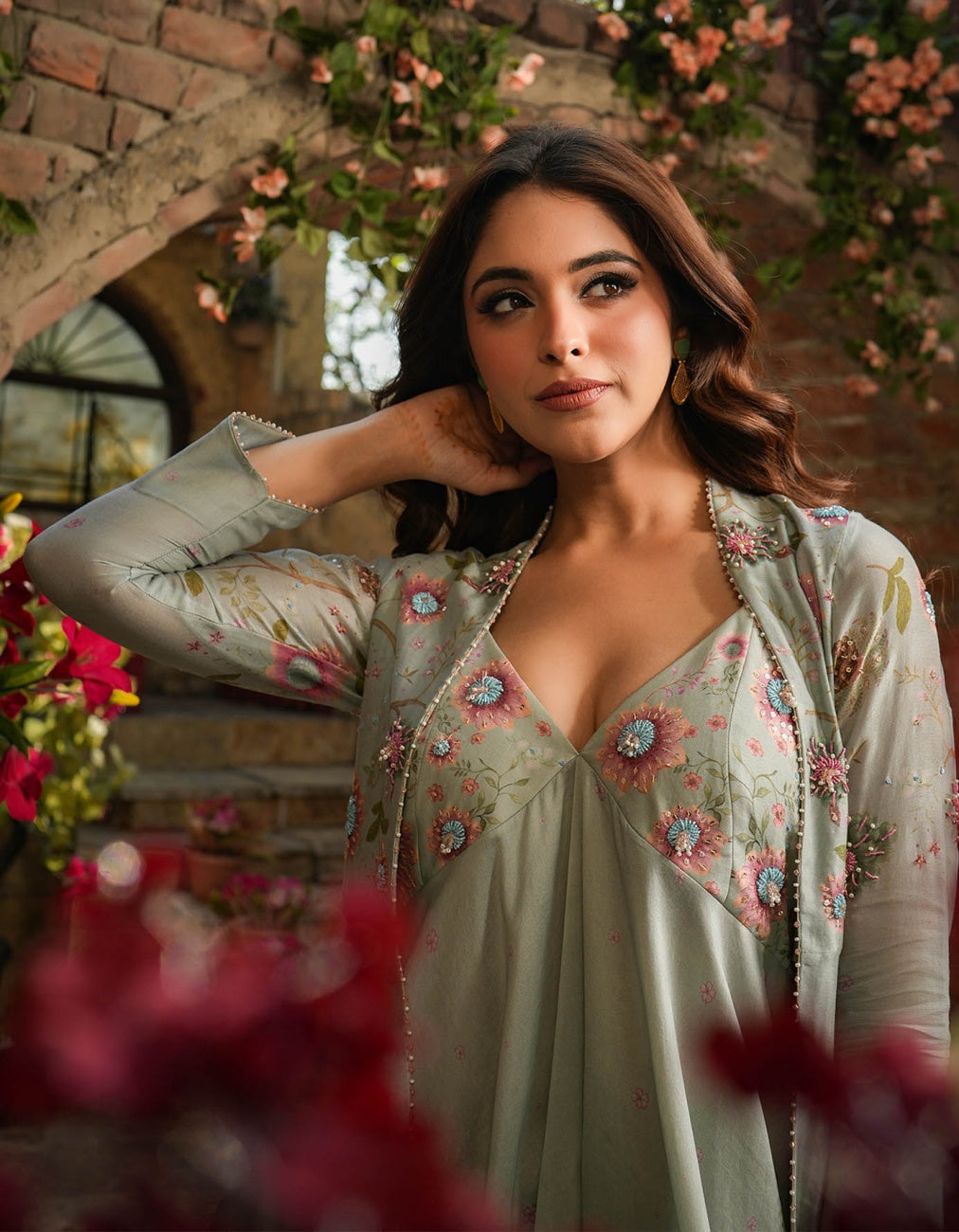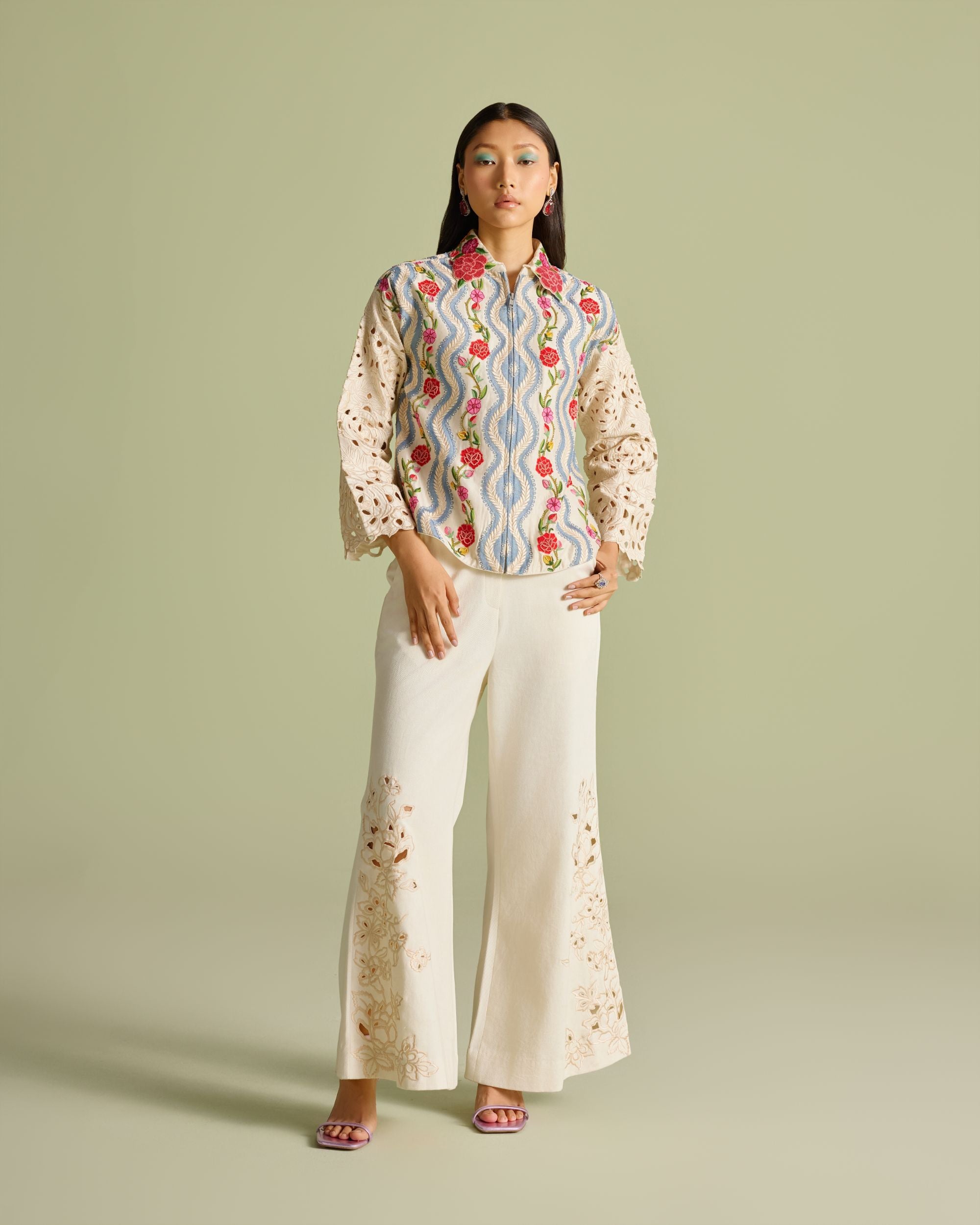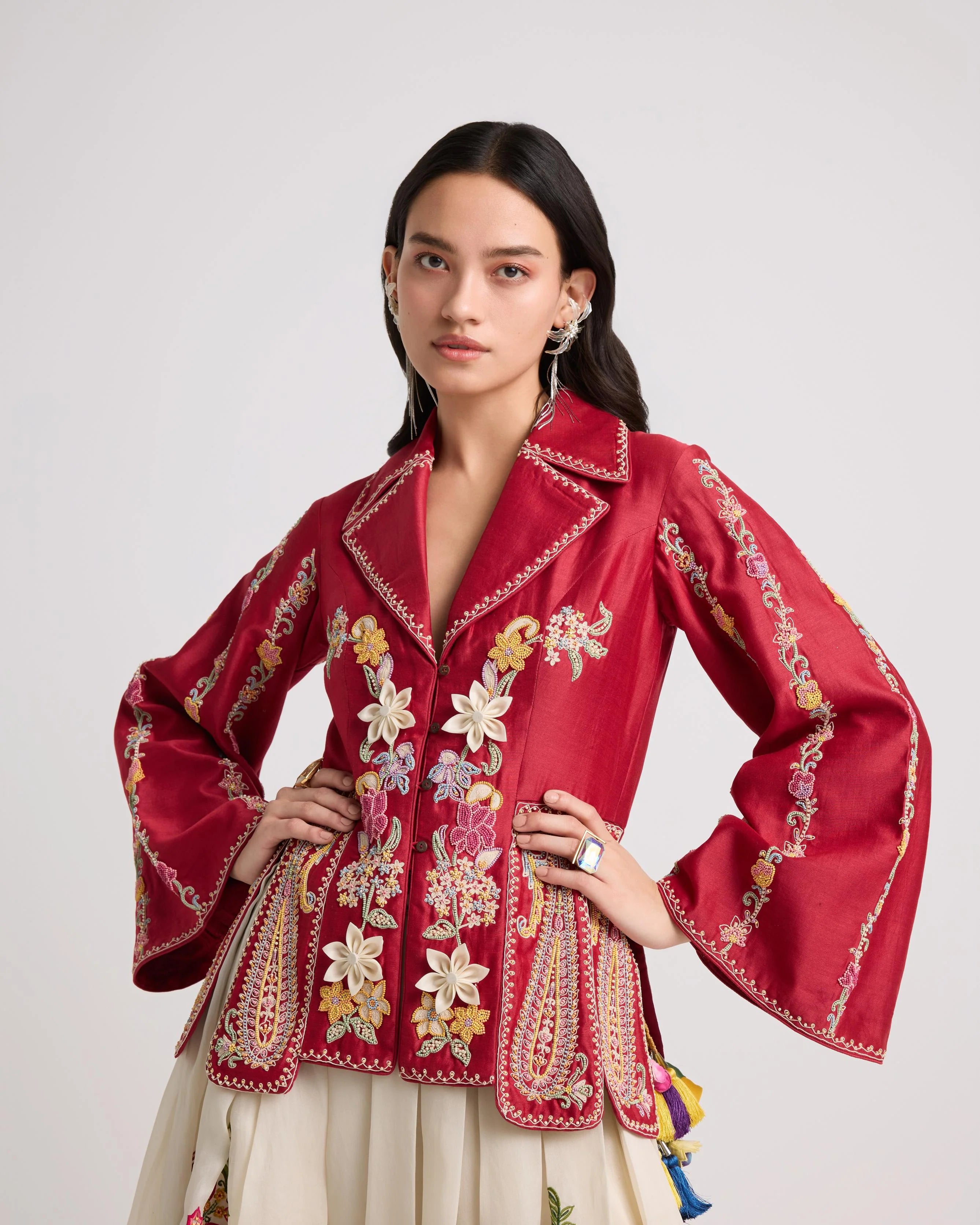 Ivory Floral Threadwork Pleated Jacket
