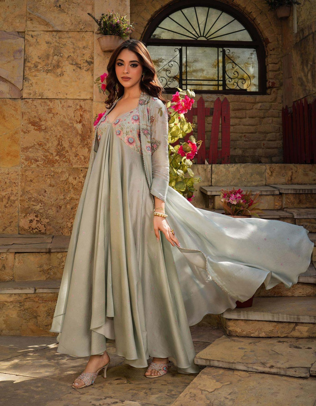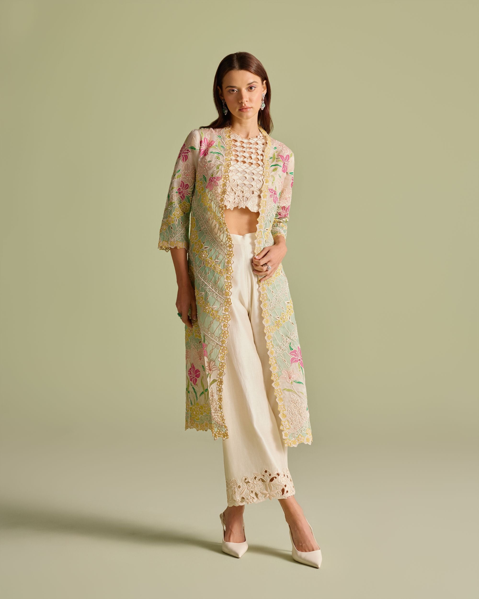Ivory & Aqua Applique Long Jacket