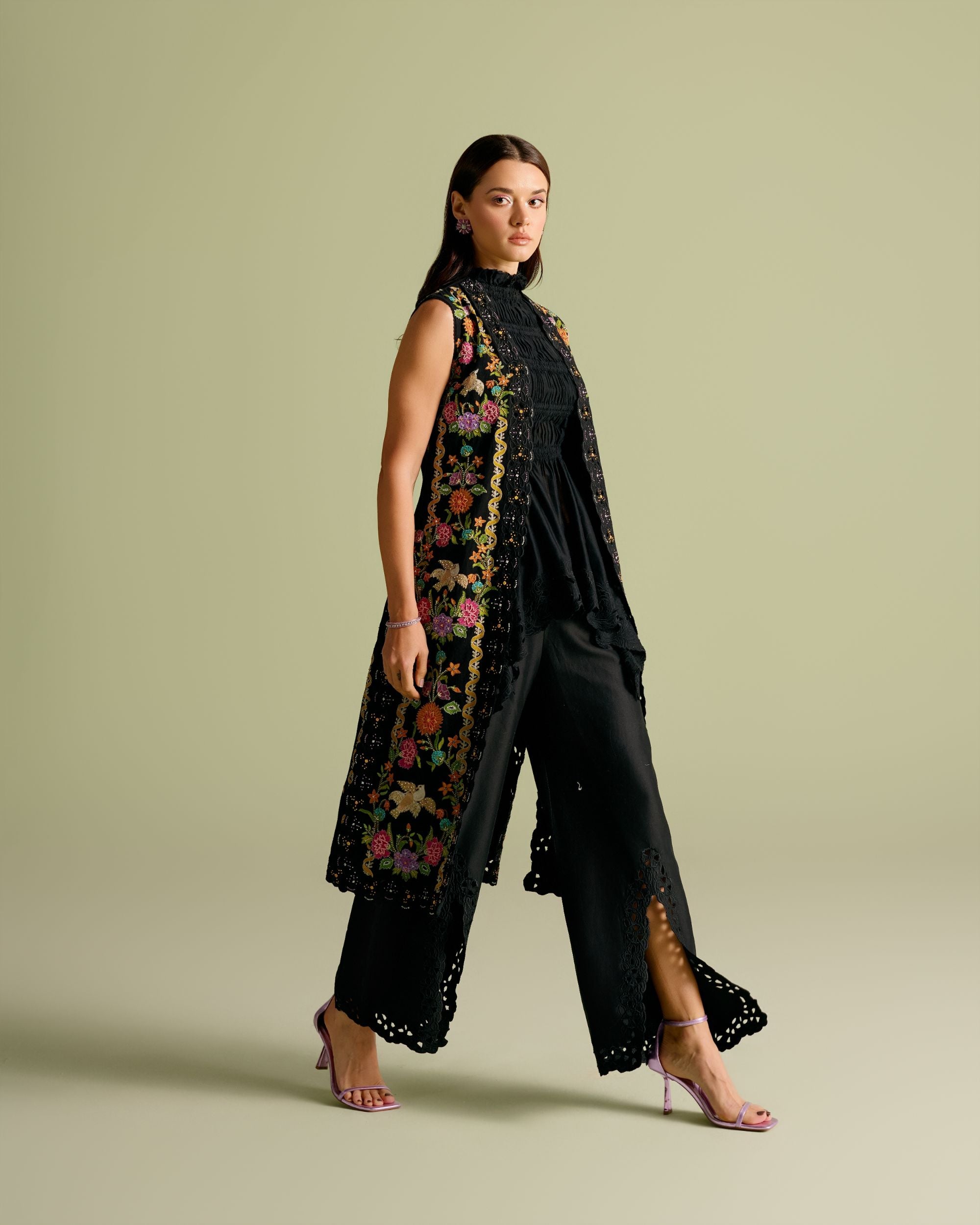 Black Floral Embroidered Long Jacket