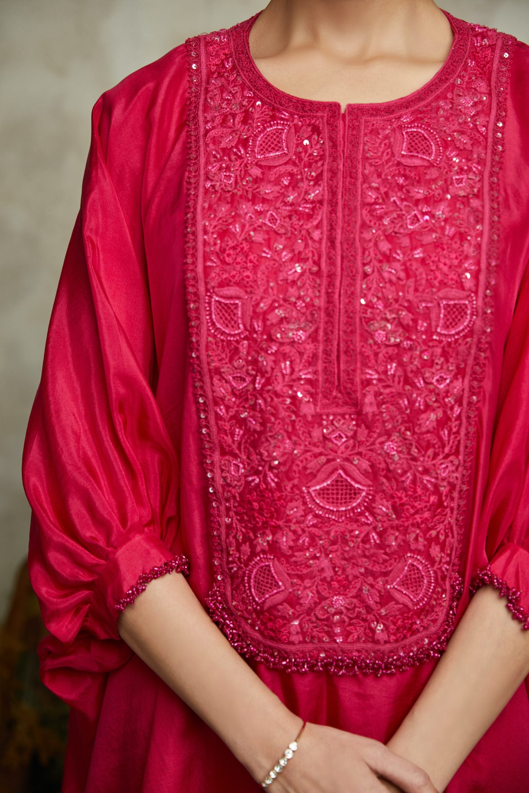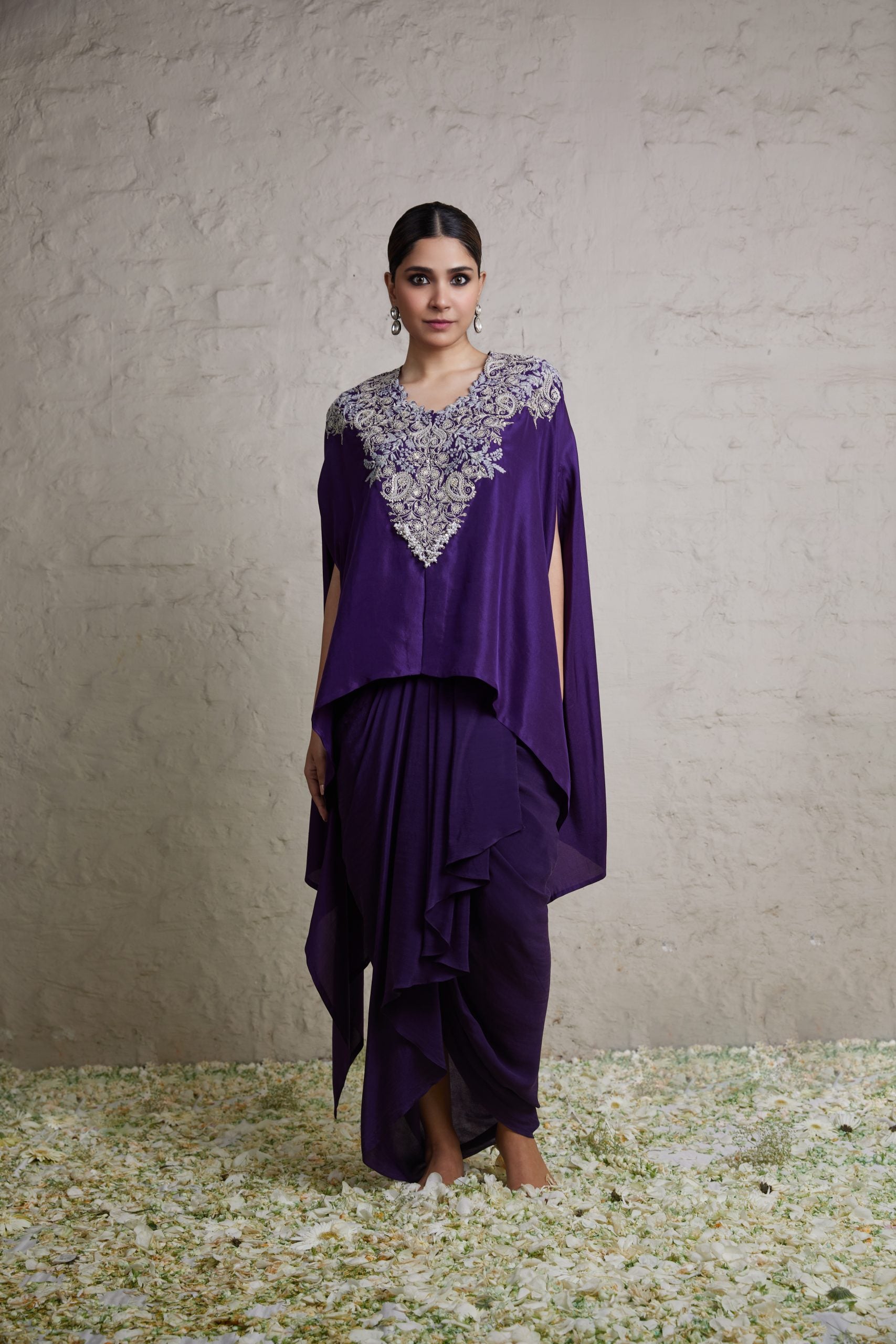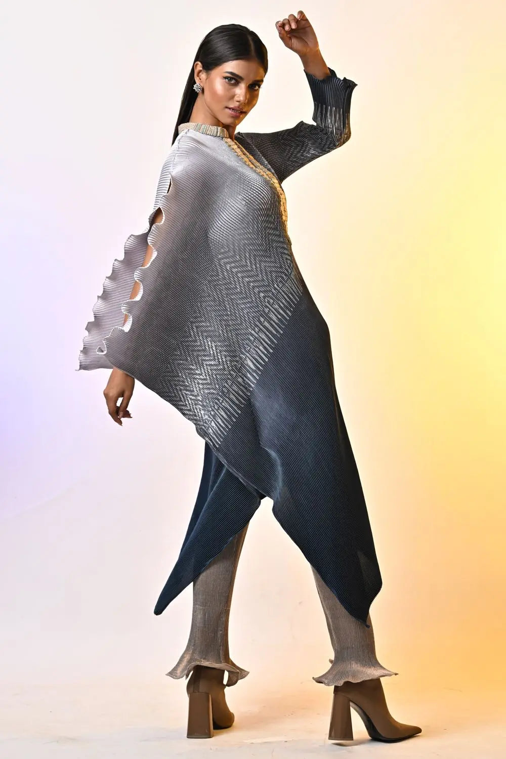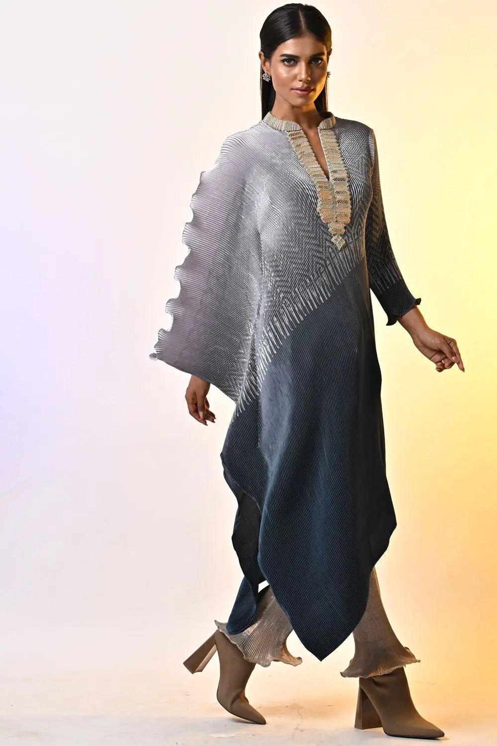Metallic silver hand embellished pleated kaftan