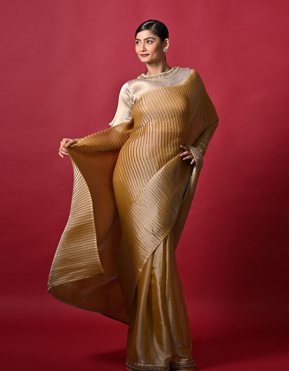 Liquid Silver Metallic Pleated Saree With Tissue Detail And Choli Piece