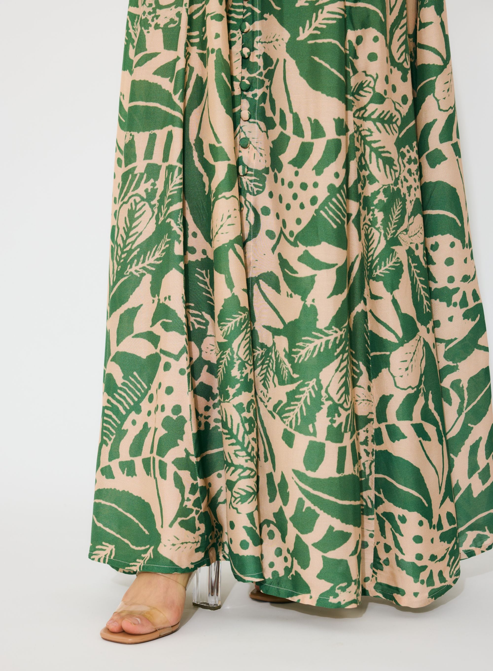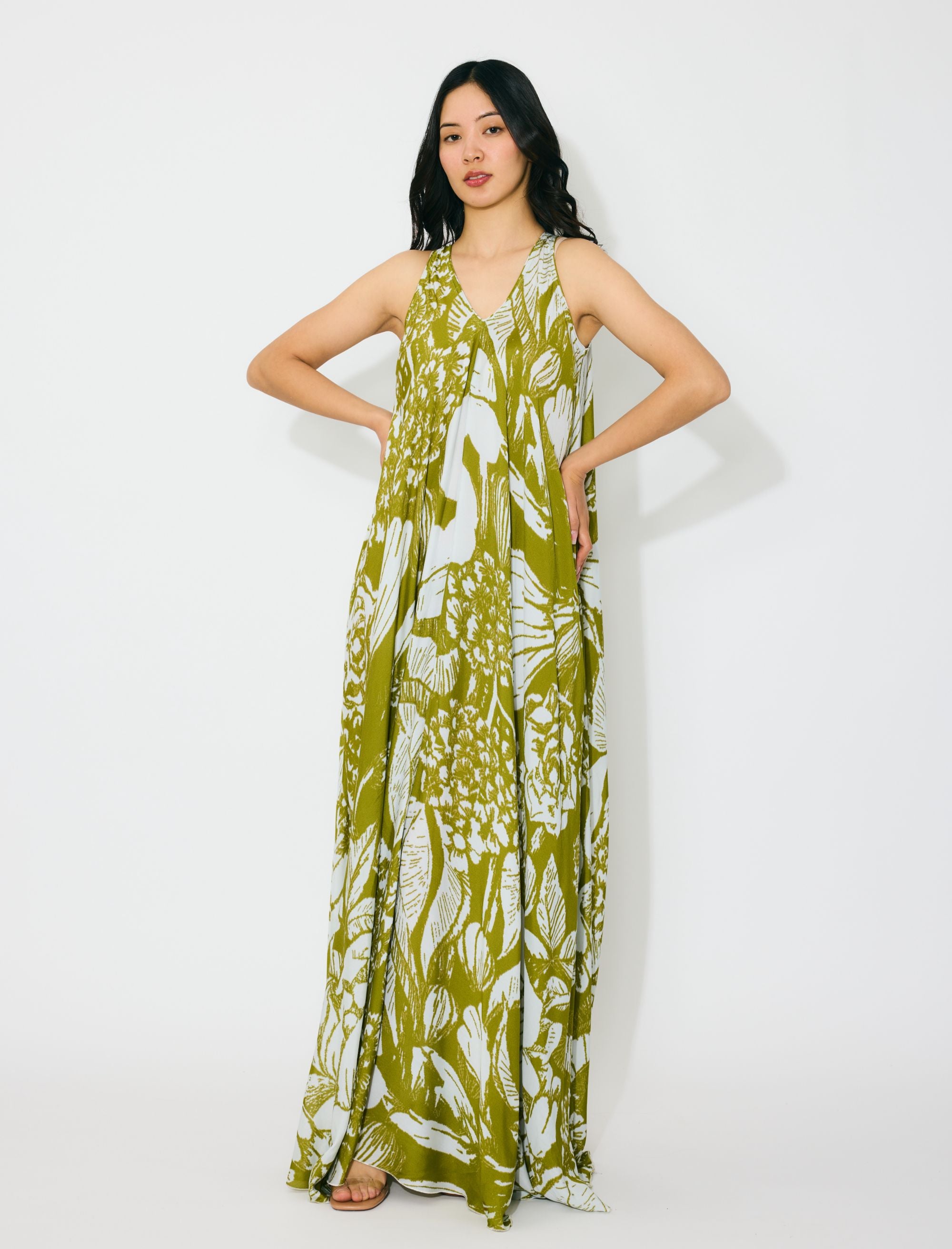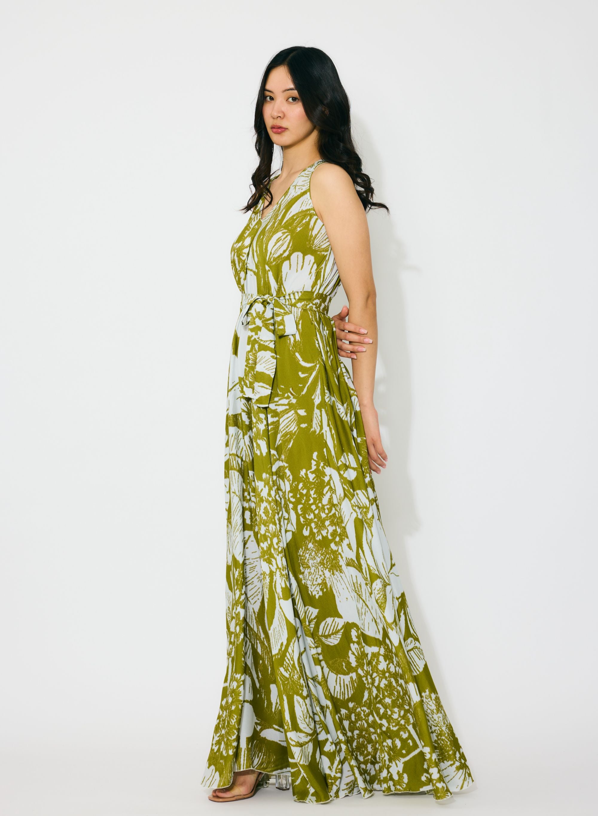 LEAF GREEN AND WHITE FLORAL SLEEVELESS LONG DRESS