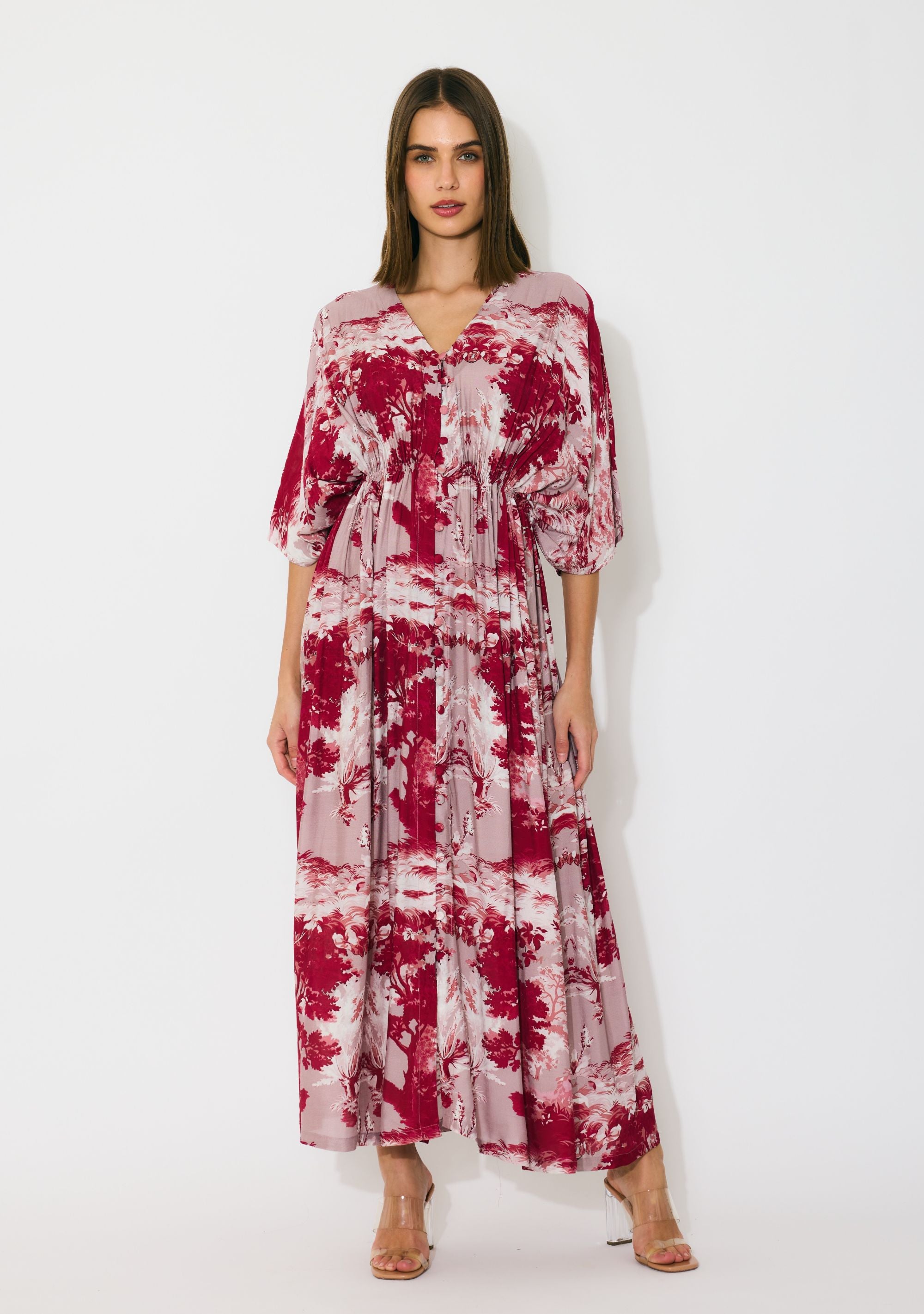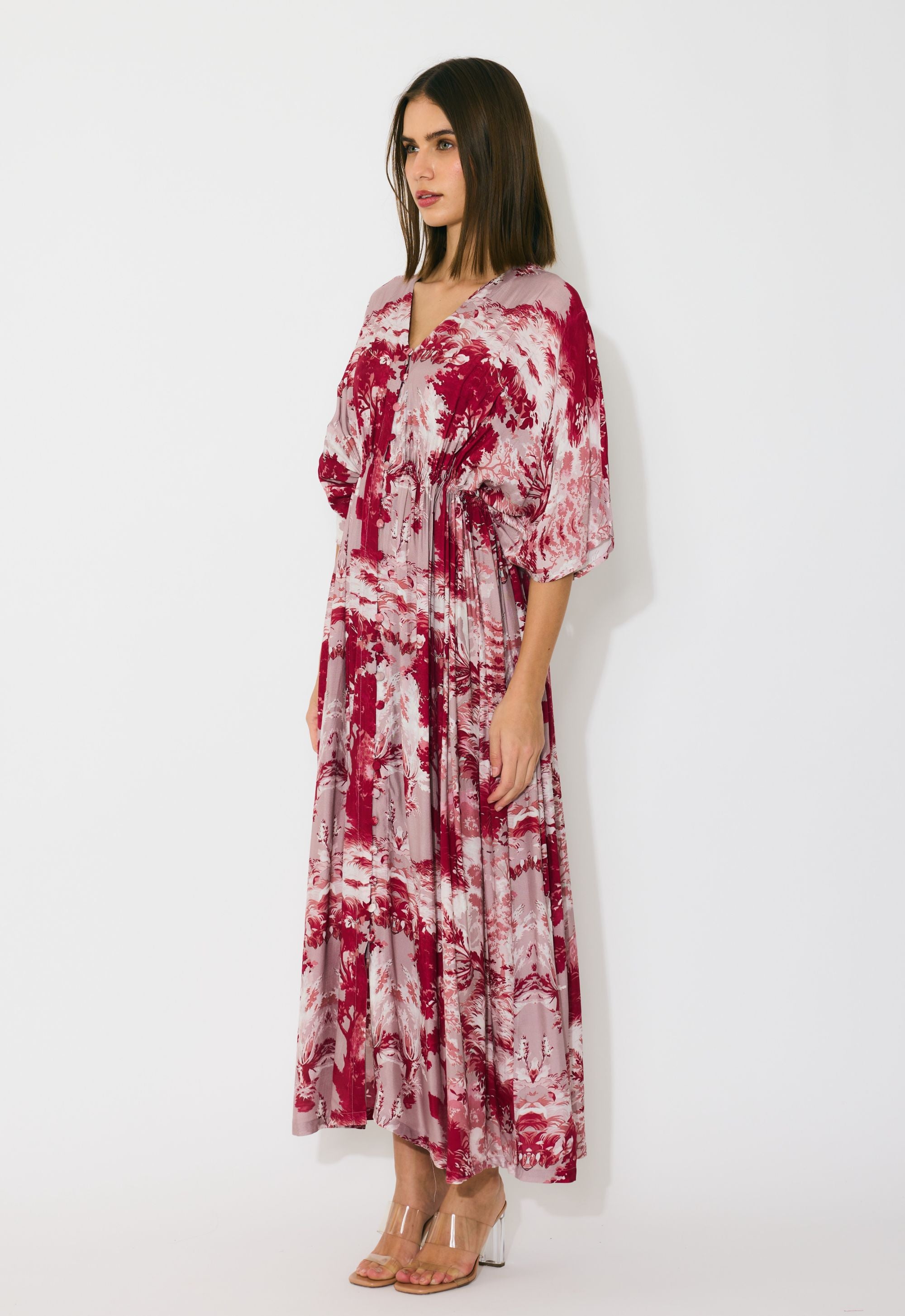 PEACH, RED AND CREAM TOILE PRINT KAFTAN DRESS