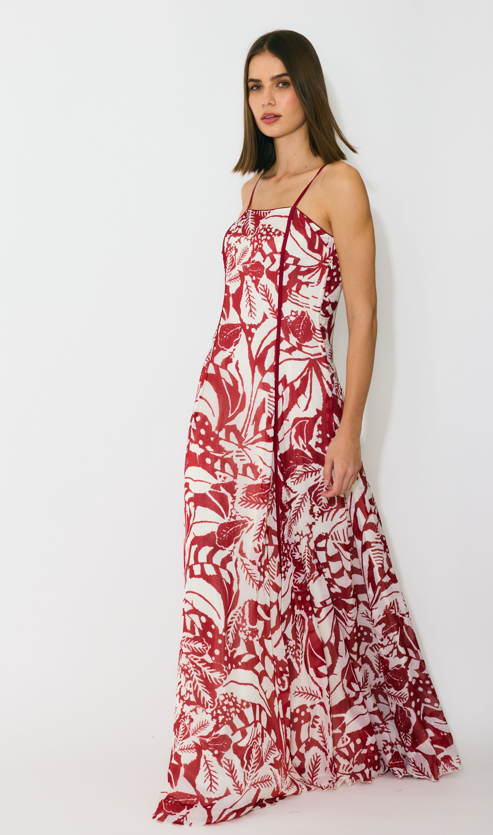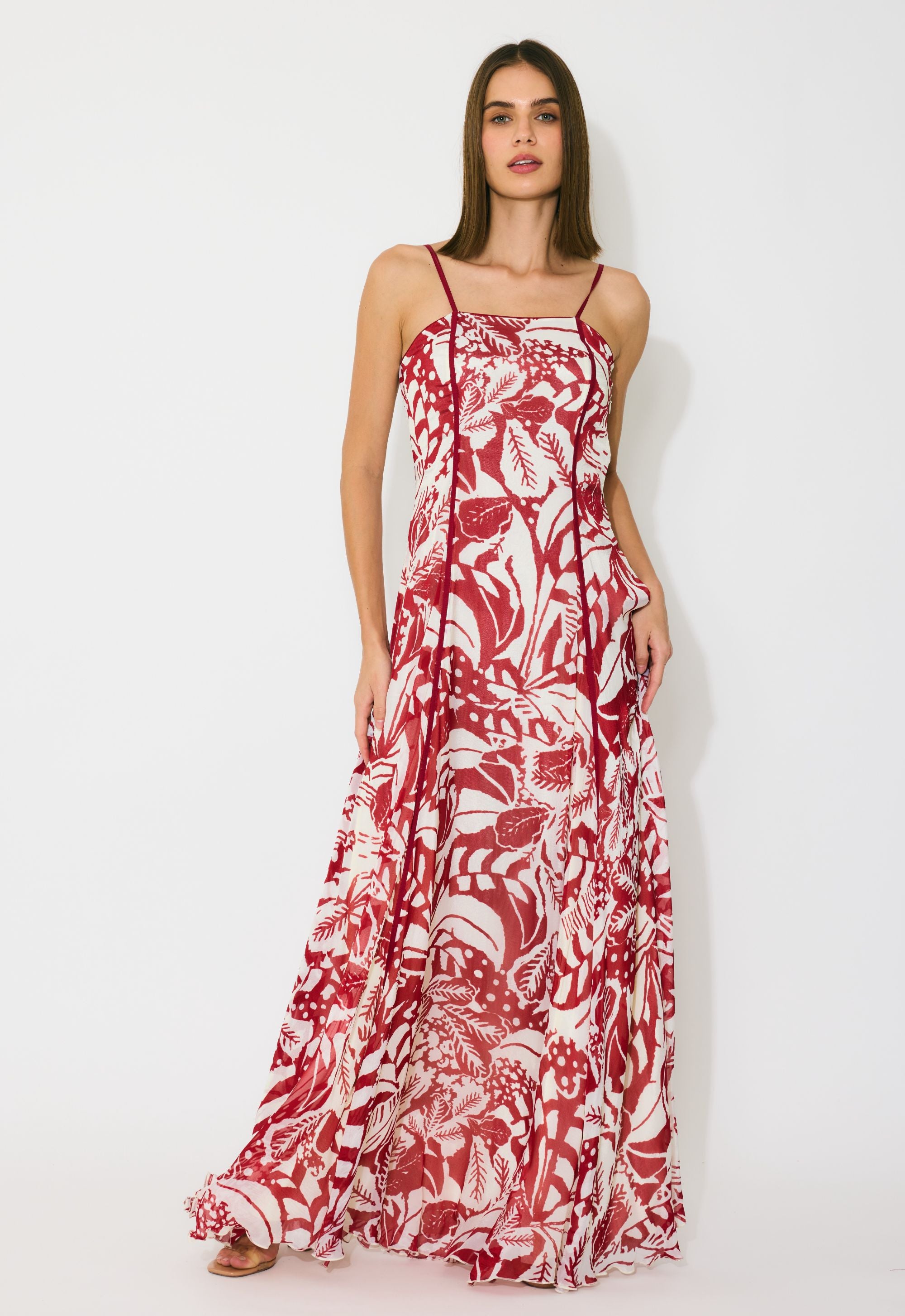 BEIGE AND RED FLORAL SLEEVELESS LONG DRESS