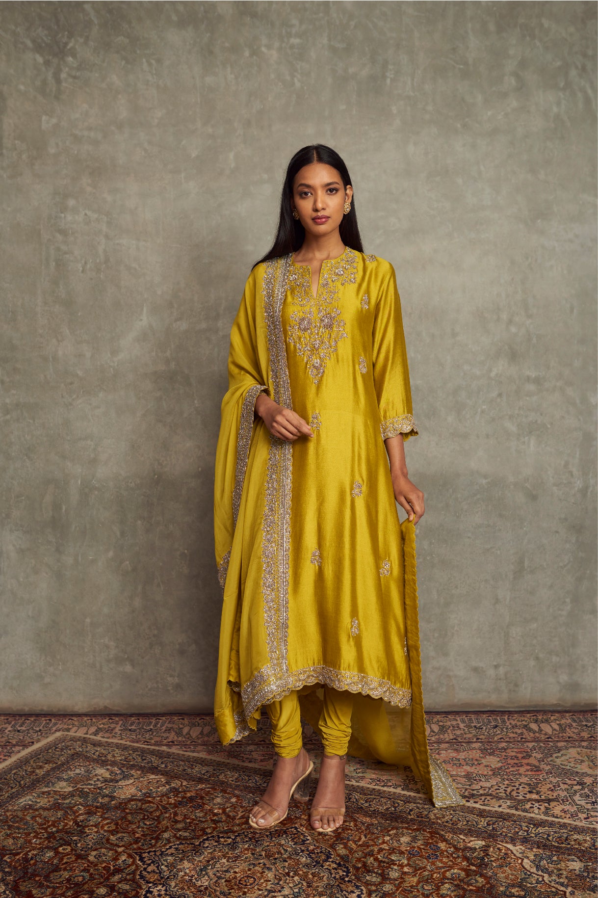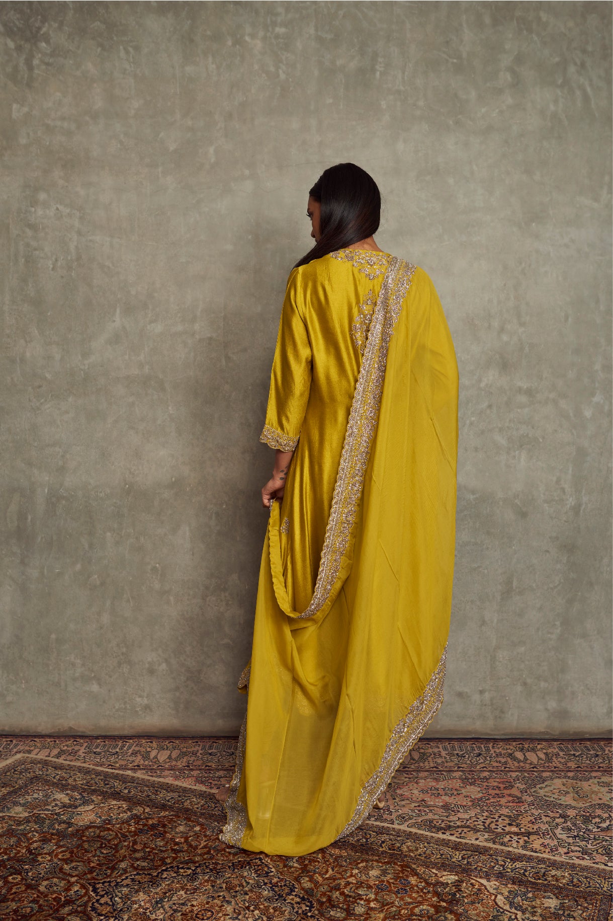 Yellow Cheniya Silk Floral Embroidered Kurta Set