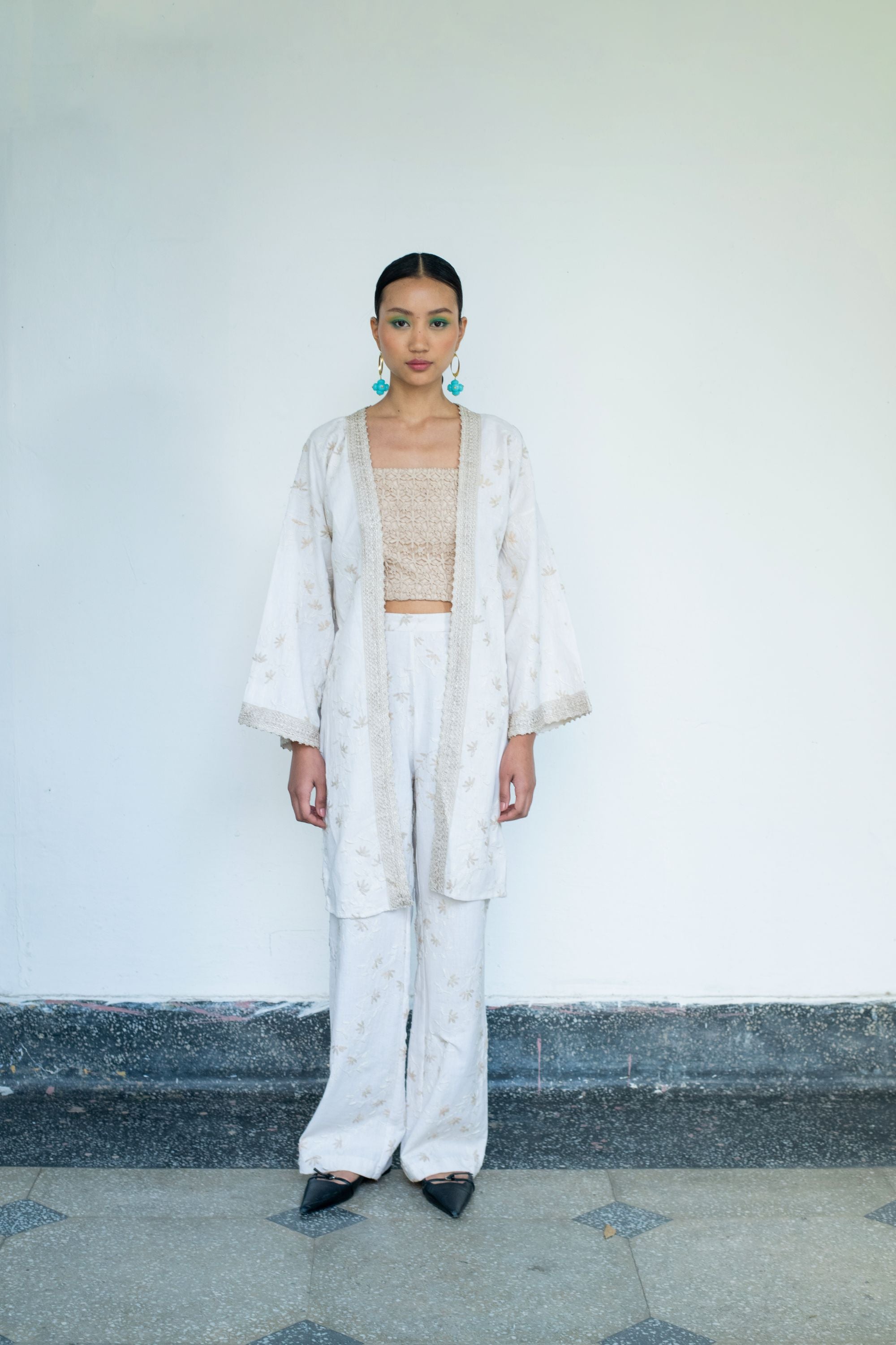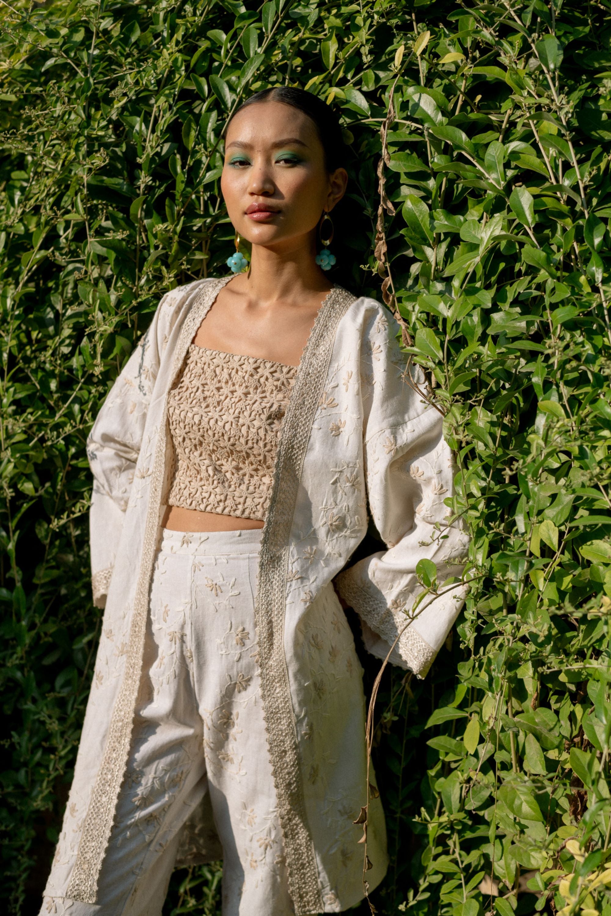 Embroidered Linen Kaftan Shrug with Nude Bralette & Threadwork Pants
