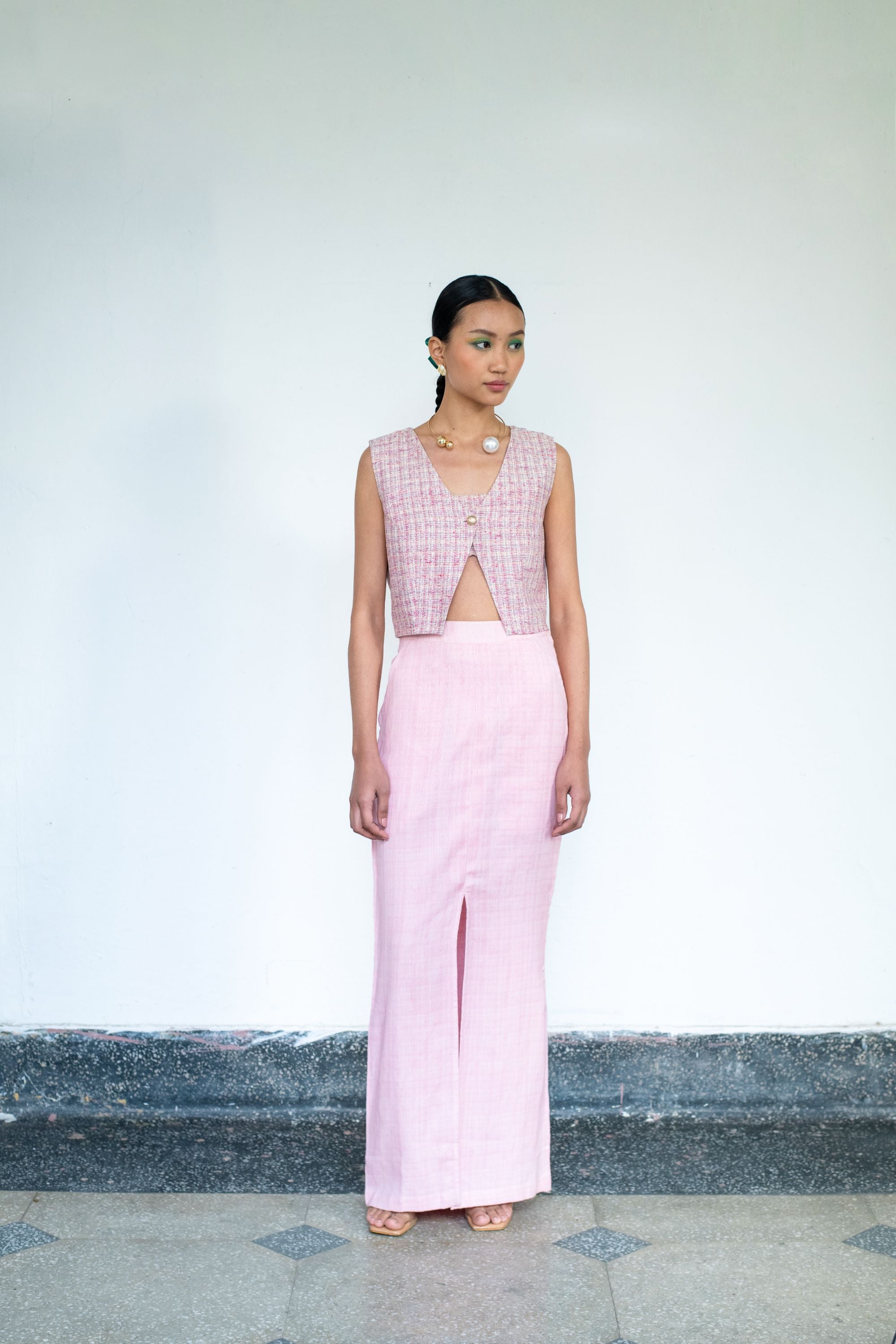 Textured Linen Jacket with Flamingo Pencil Skirt & Chic Slit
