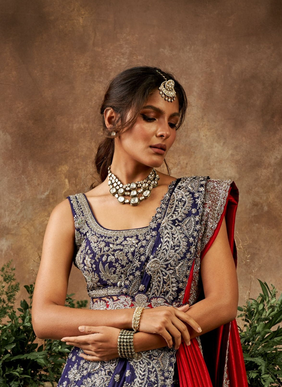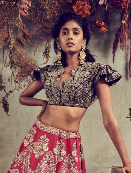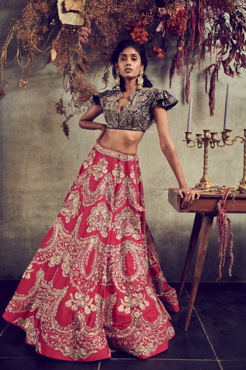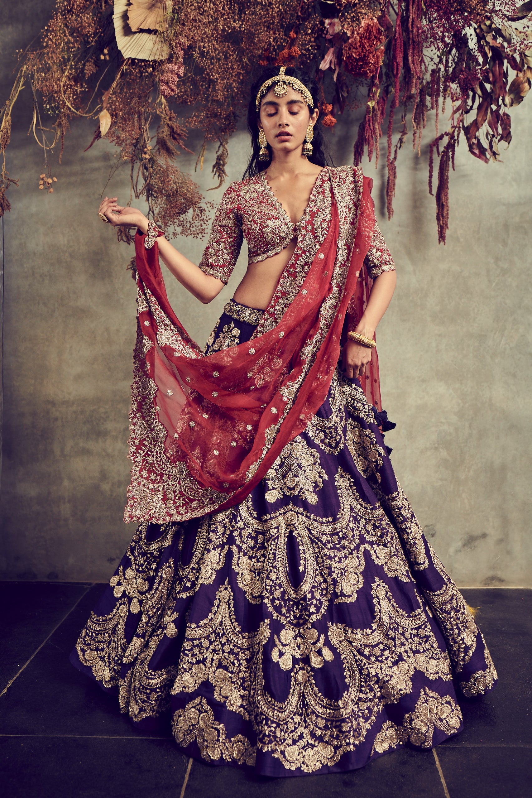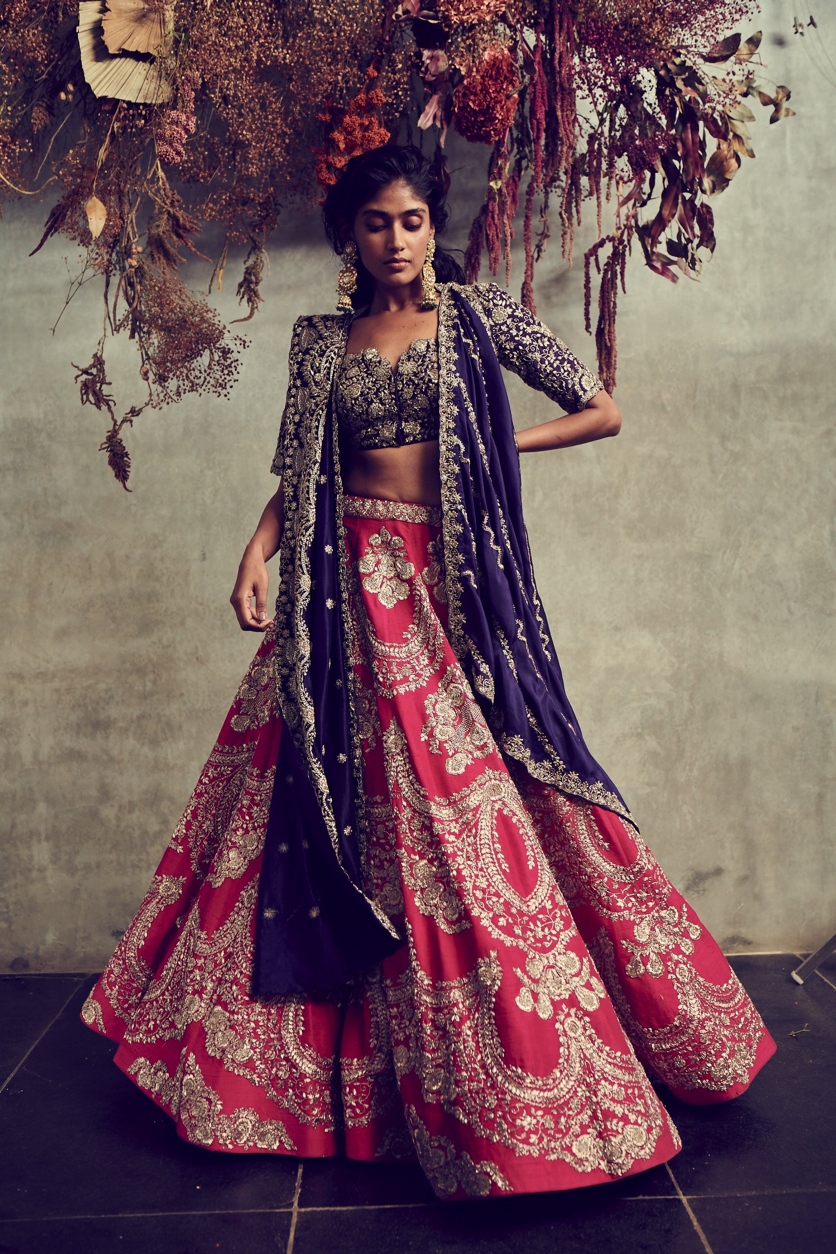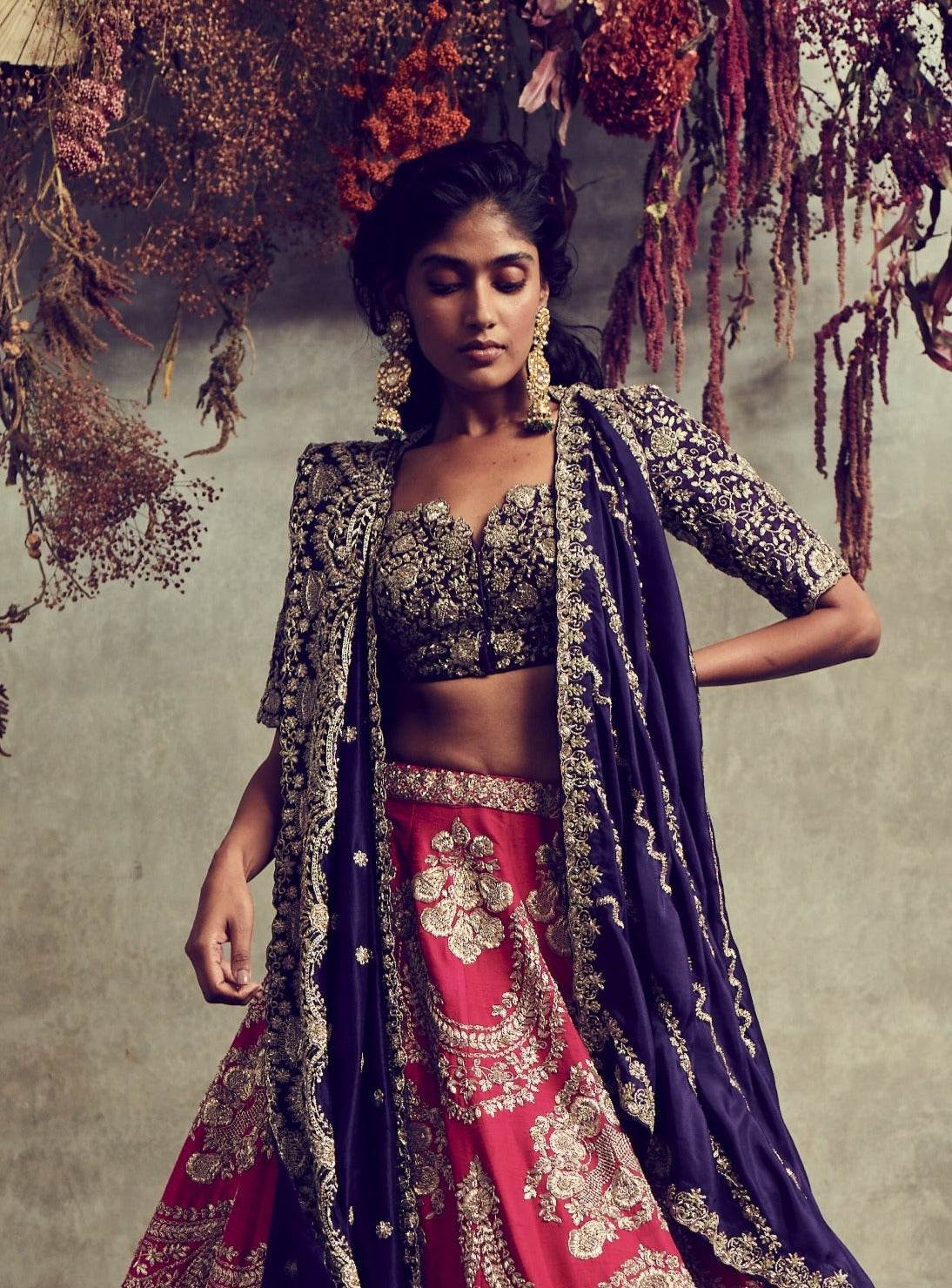 Purple Raw Silk Embroidered Floral Open Cape Lehenga Set