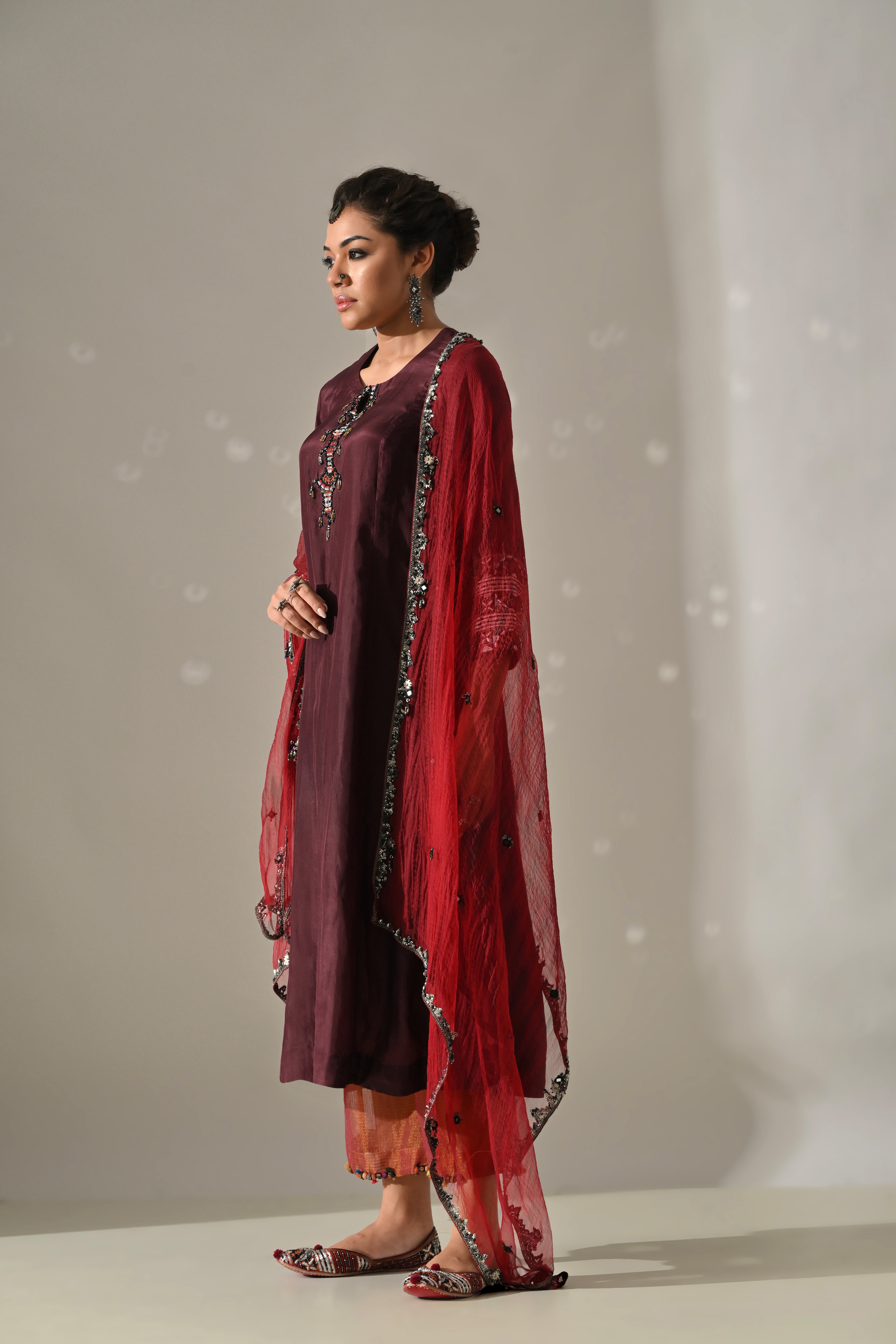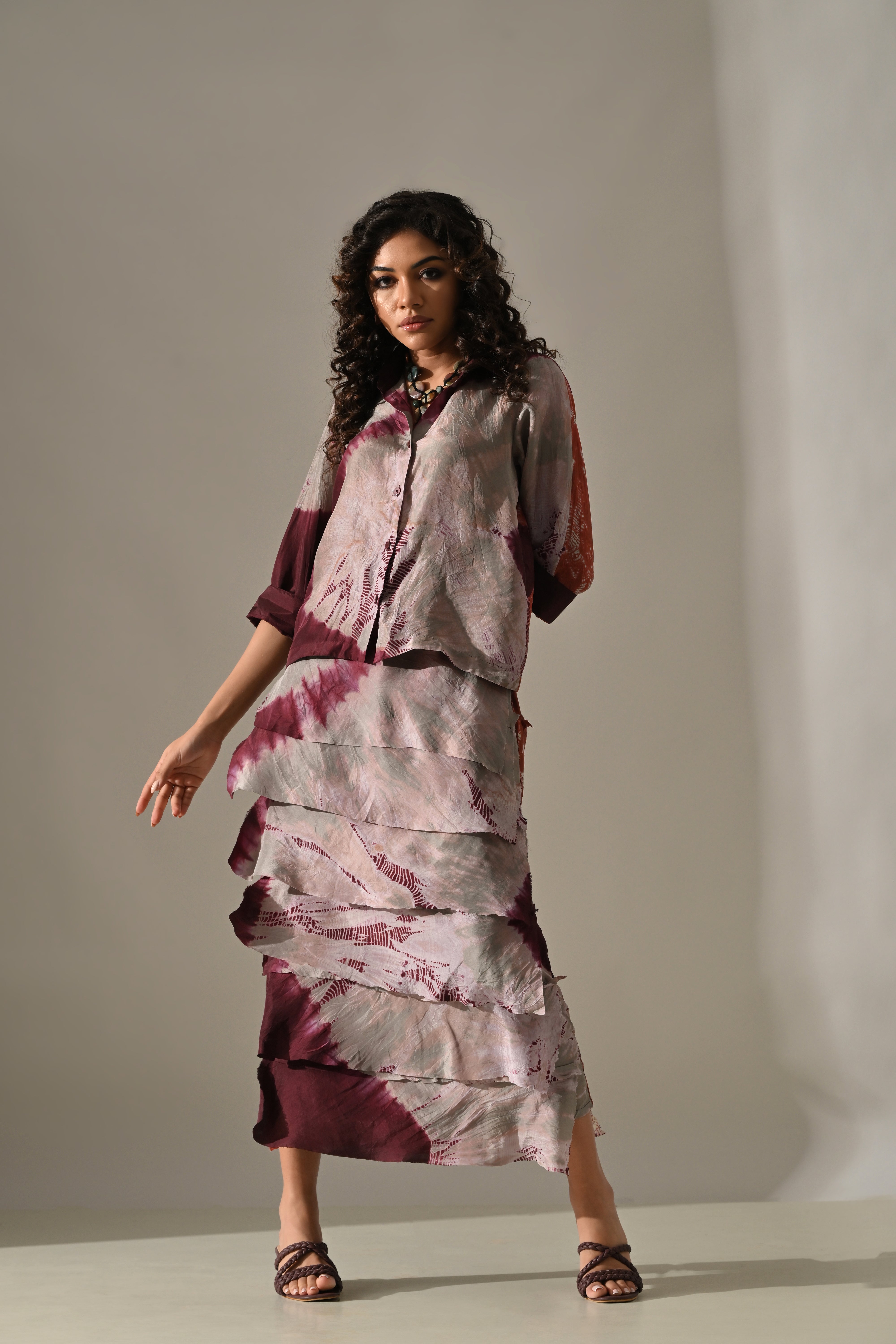 Light Grey Maroon Placement Tie Dye Skirt Set