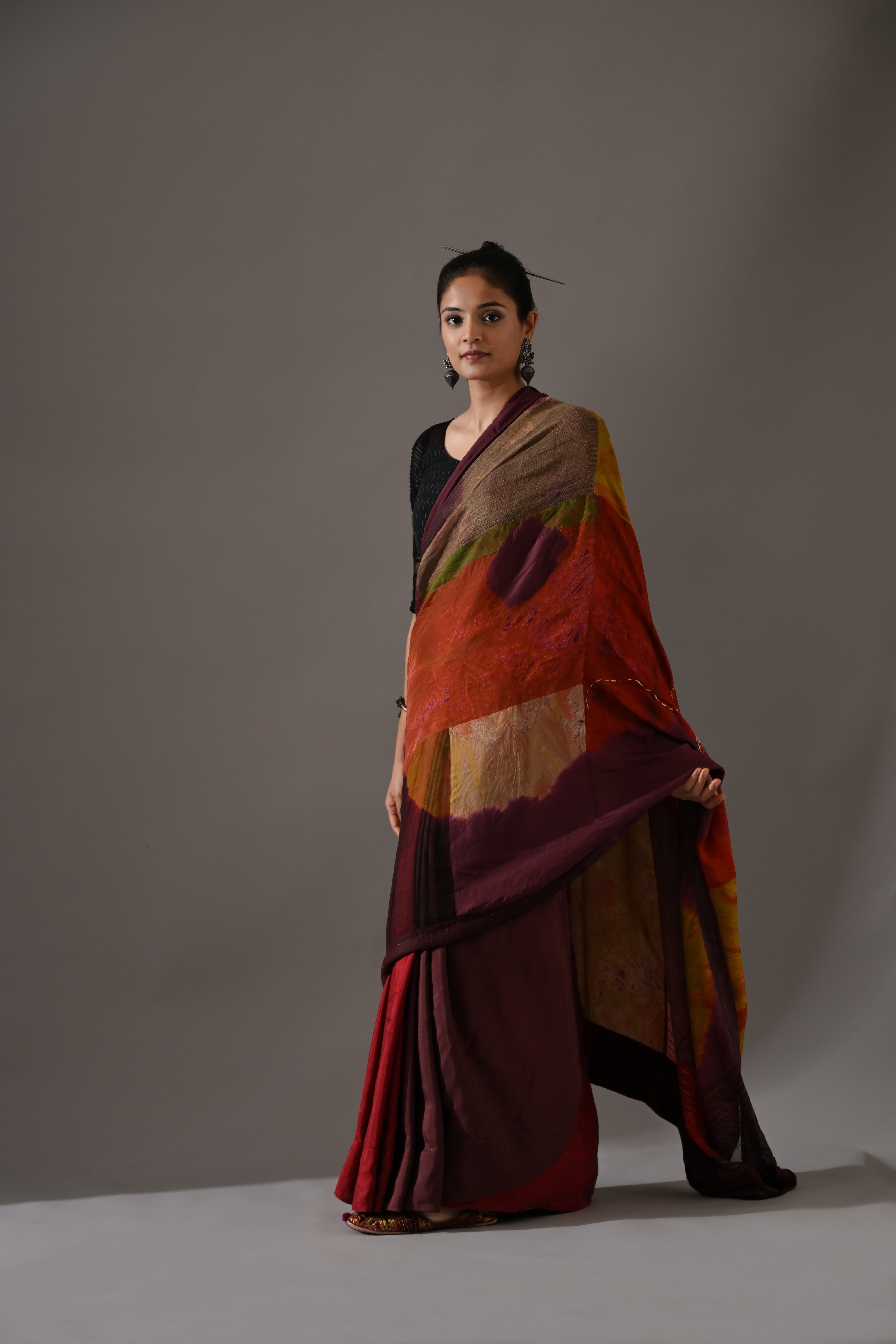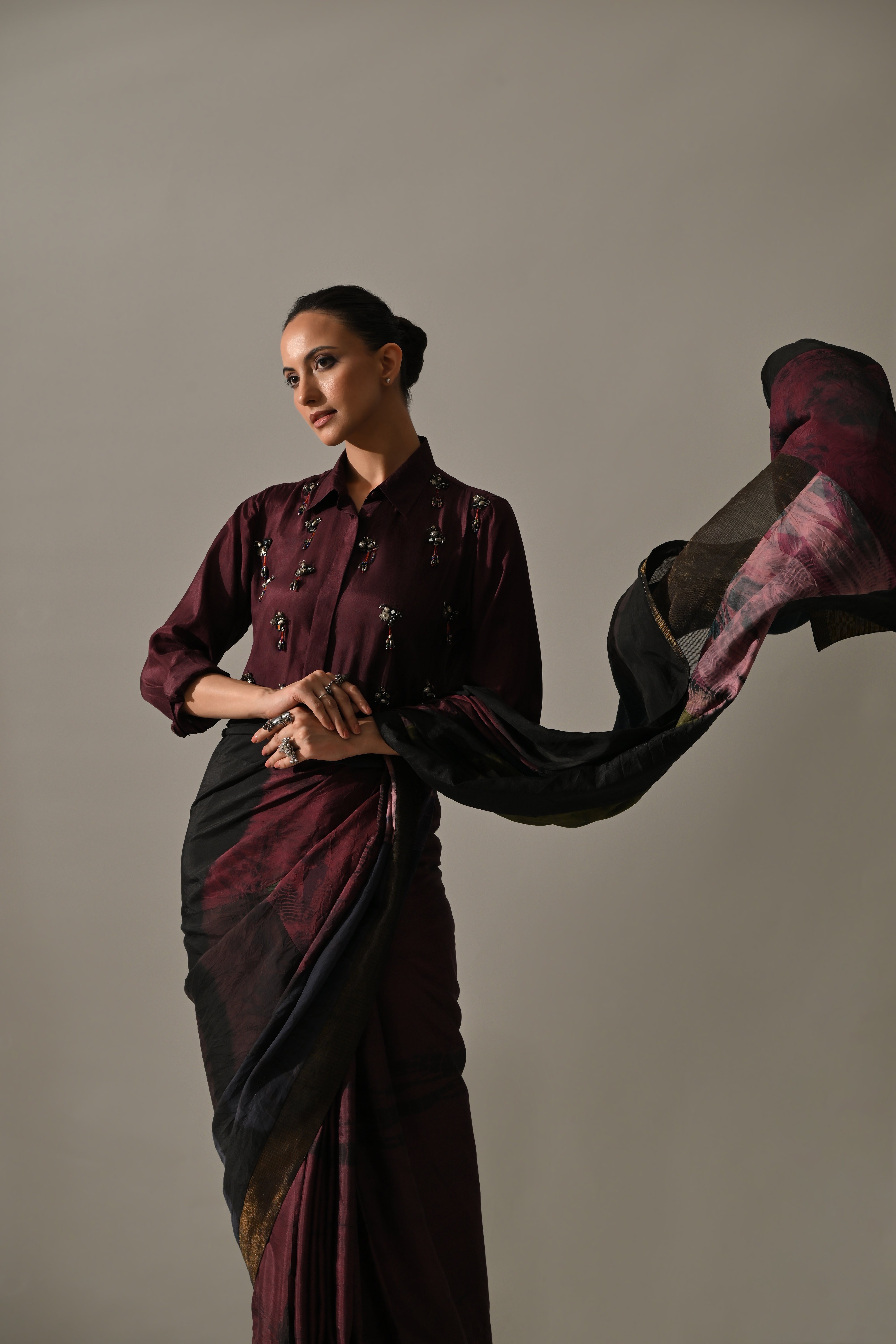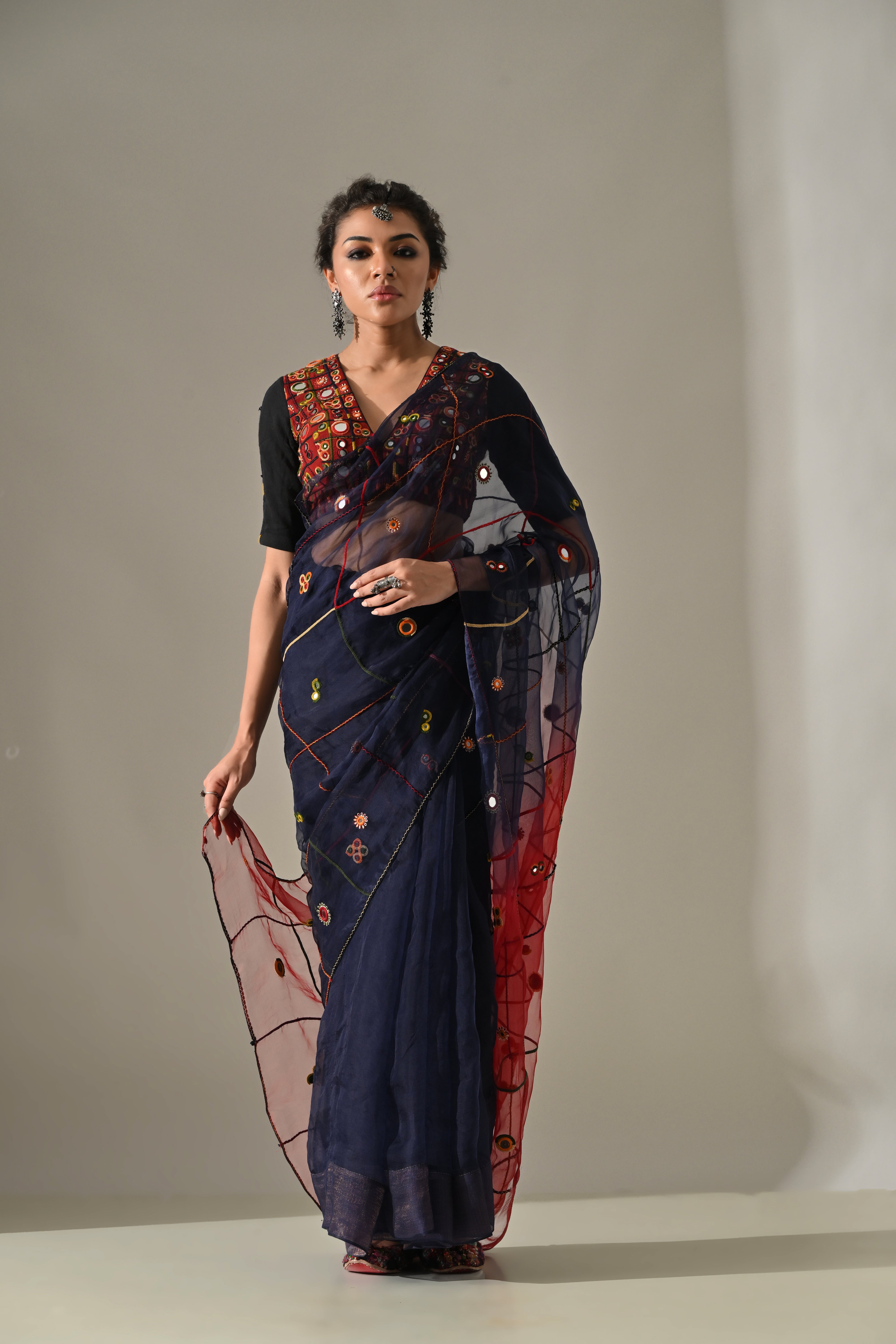 Blue Red Ombre Dyed Hand Embroidered Saree Set