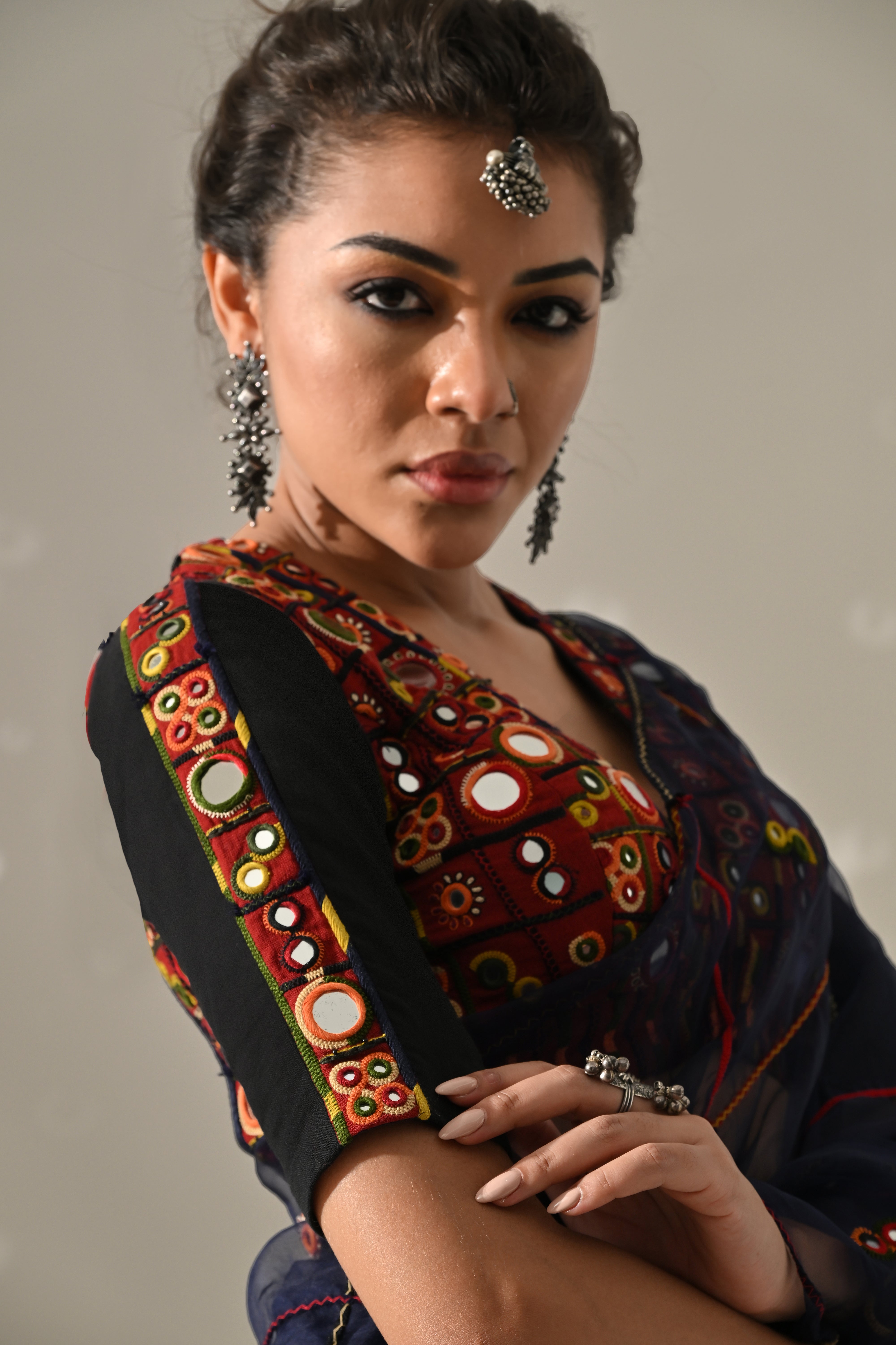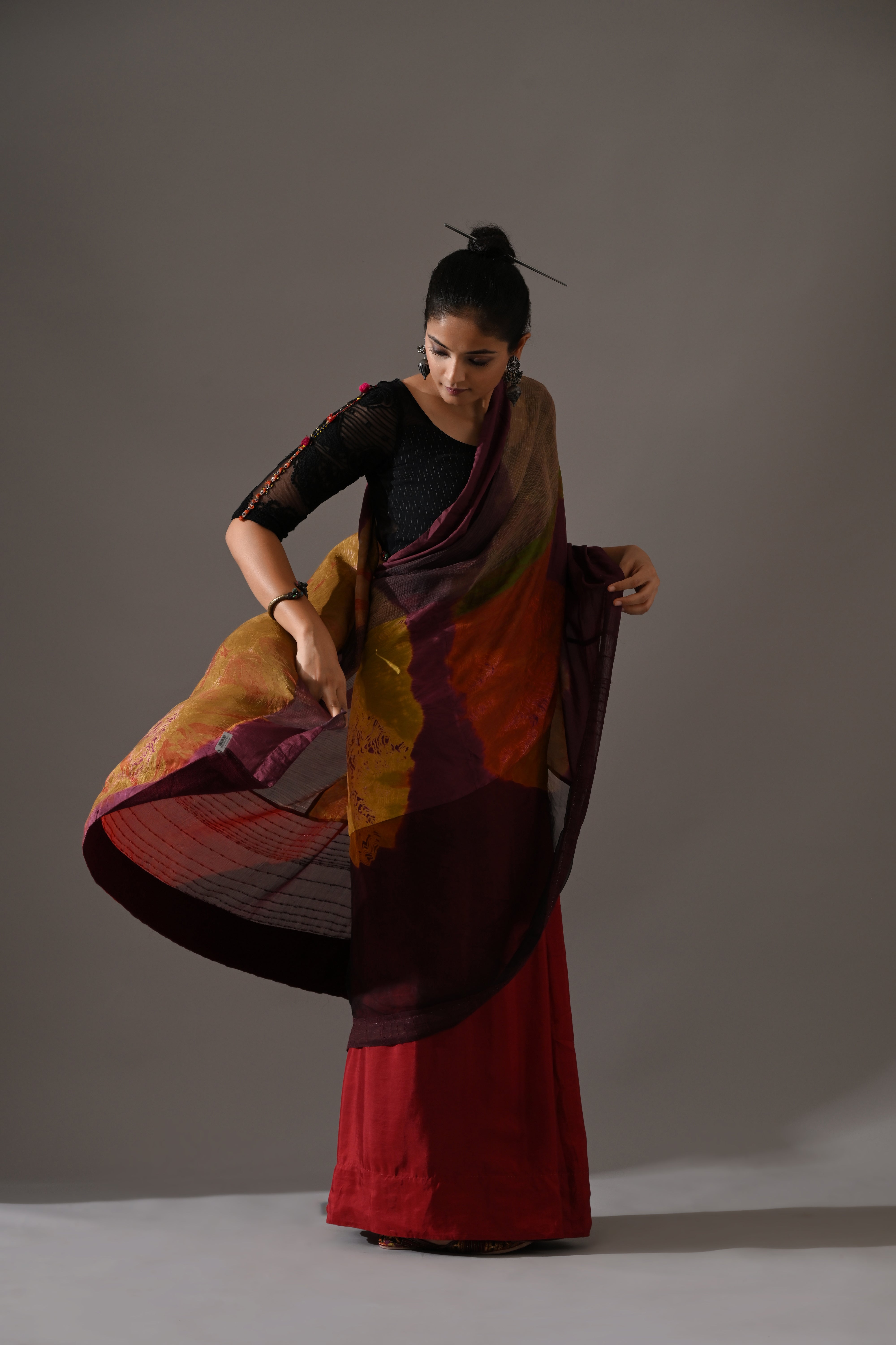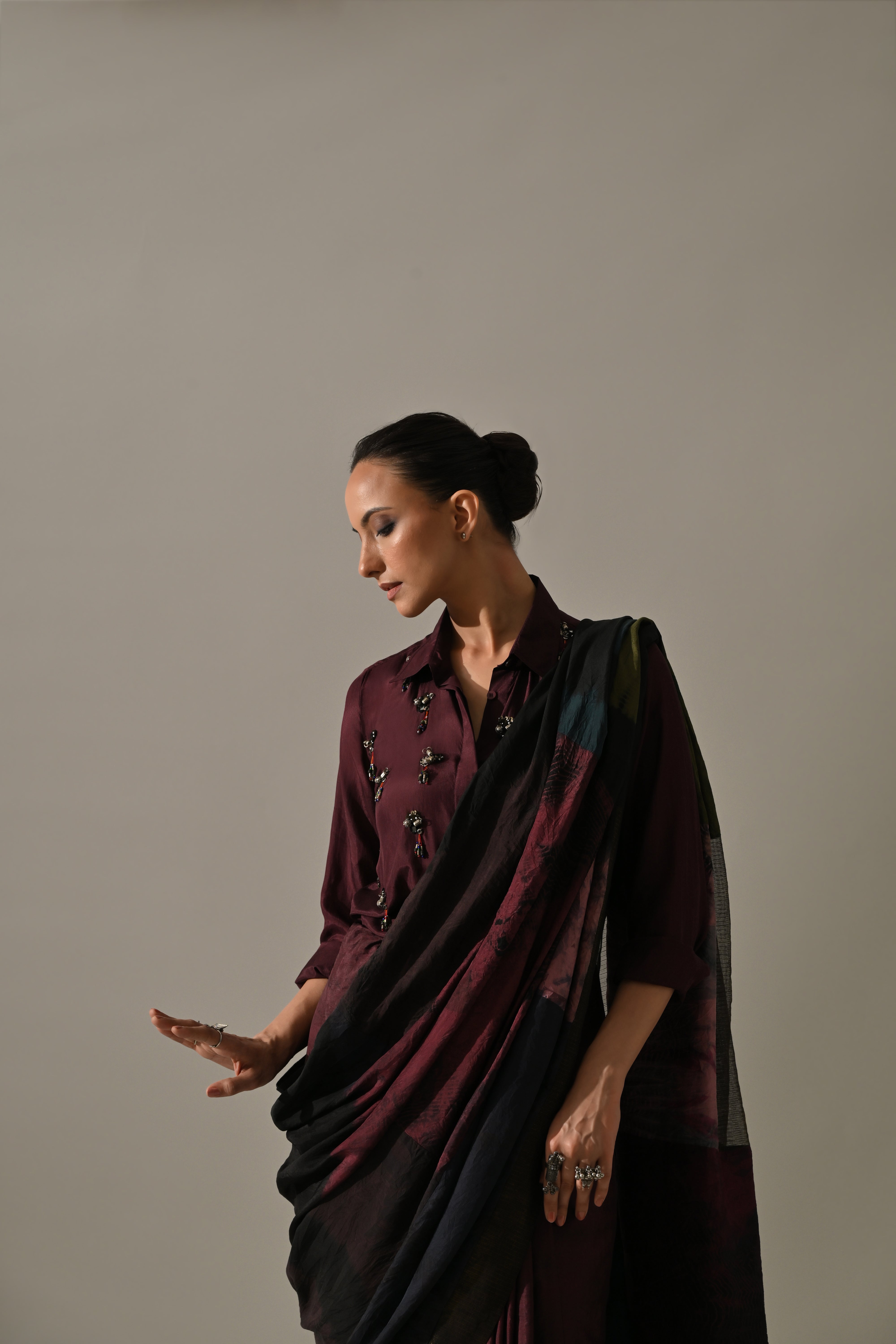 Blue Red Ombre Dyed Hand Embroidered Saree Set