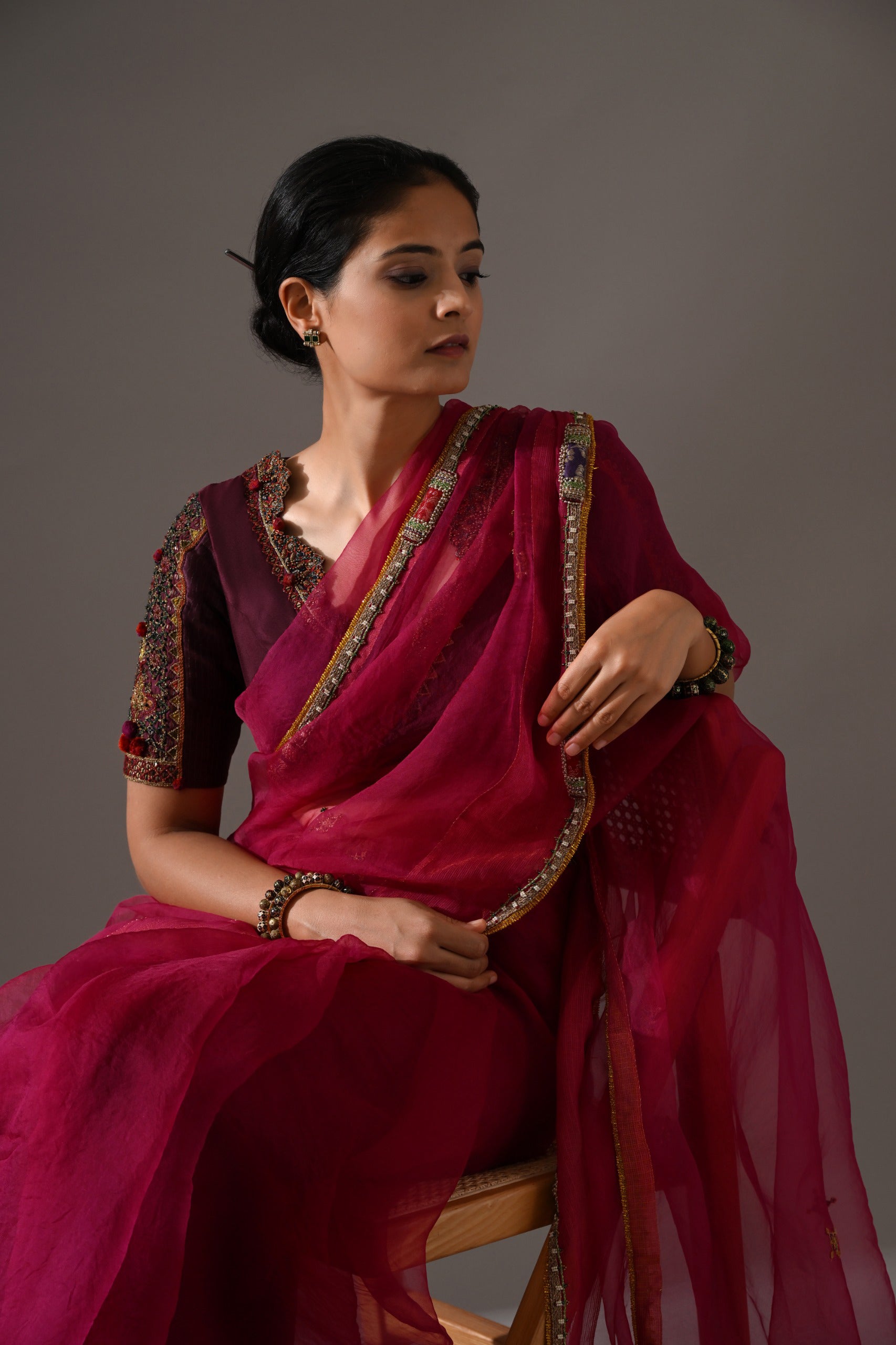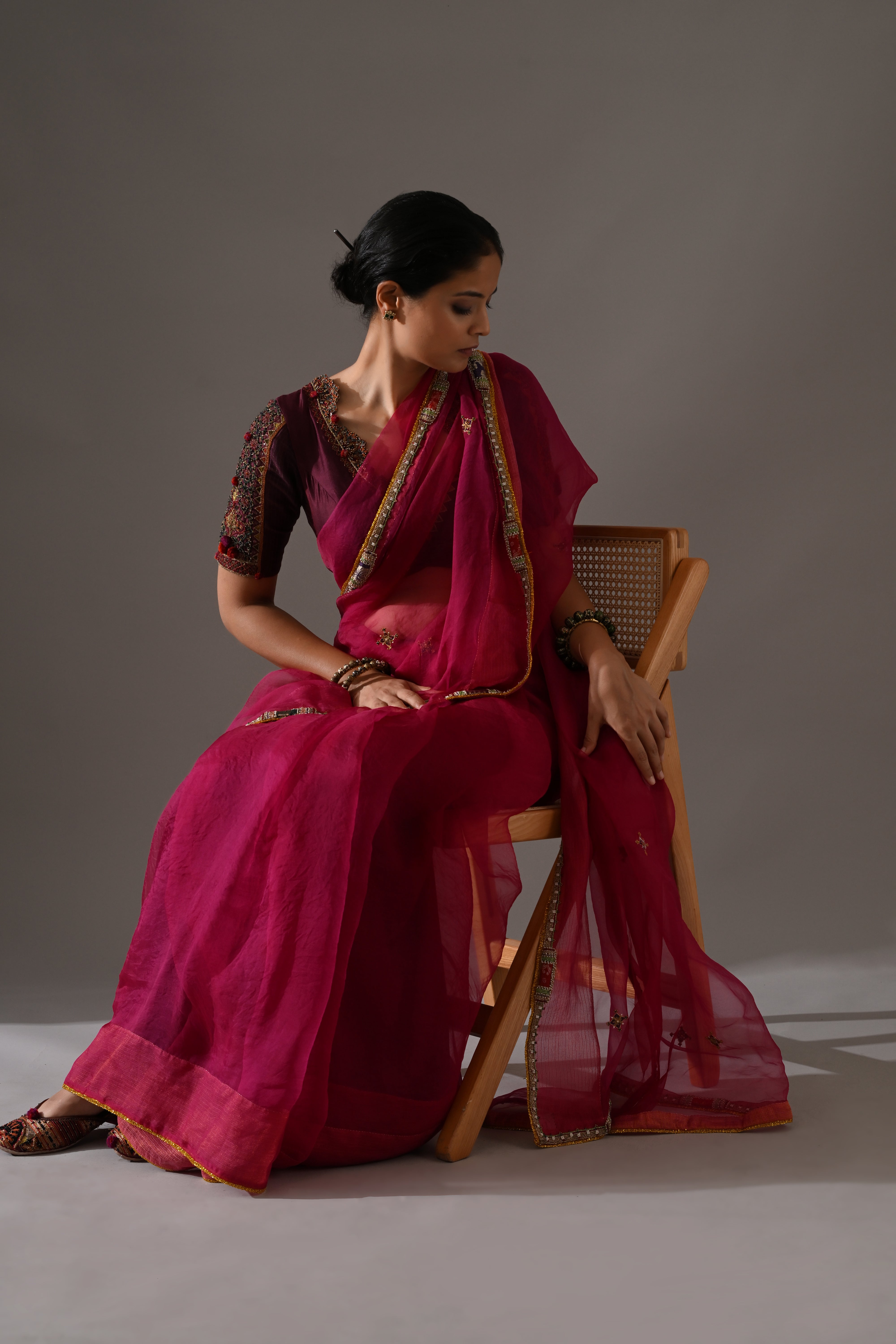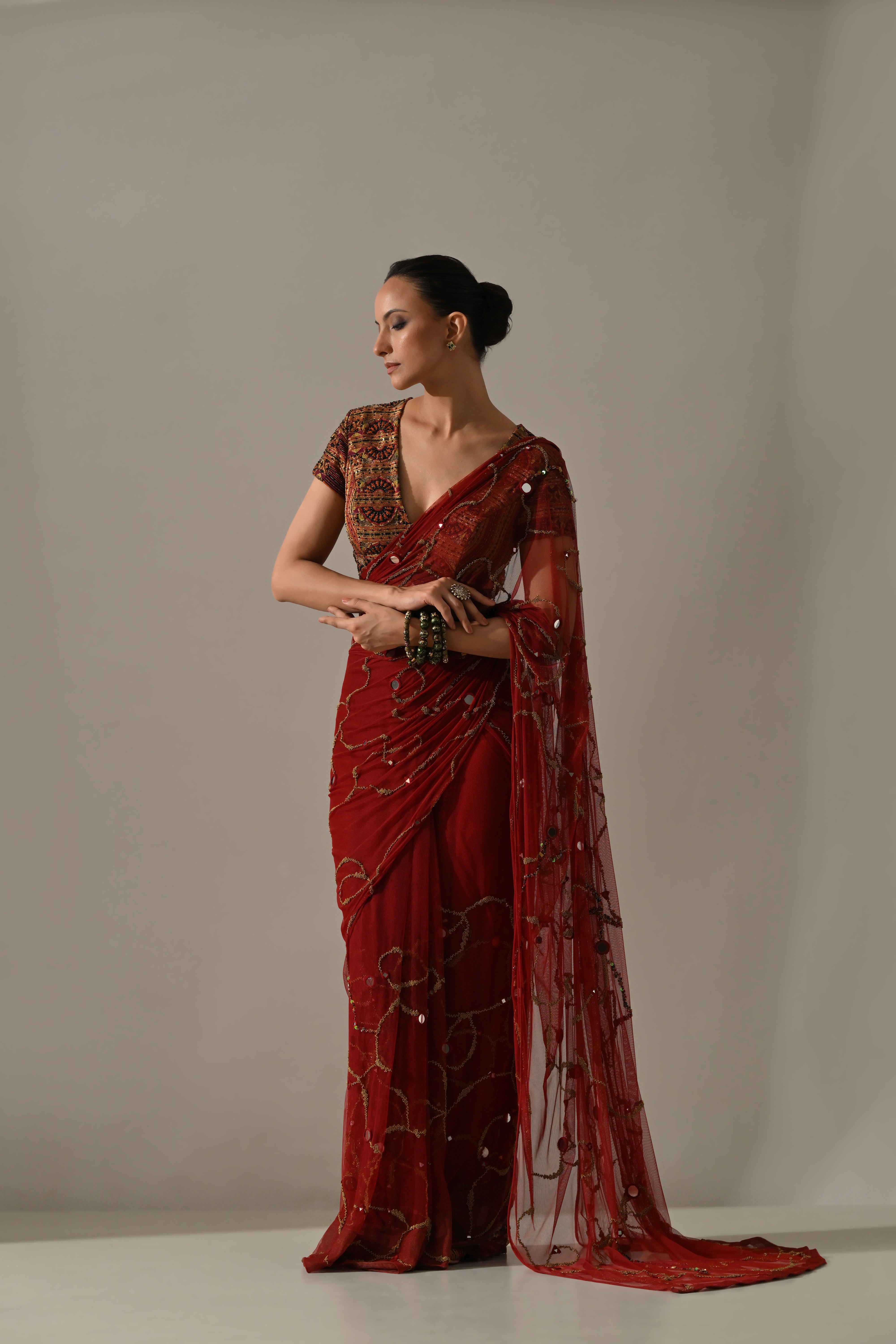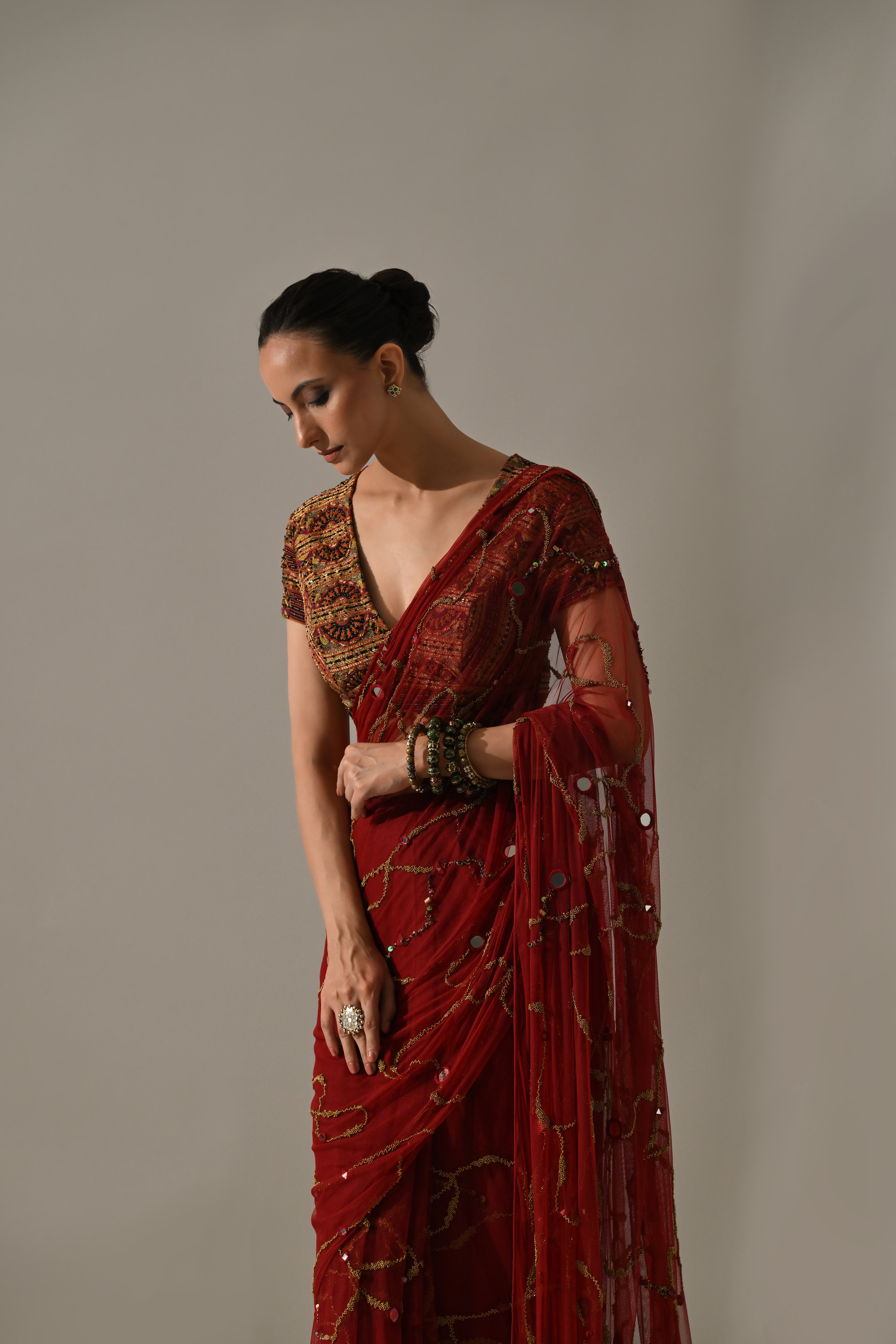 Deep Red Gold Mirror Work Hand Embroidered Saree Set