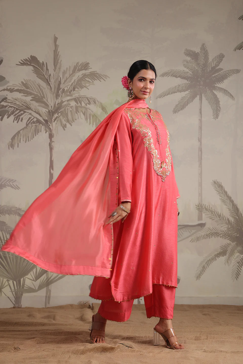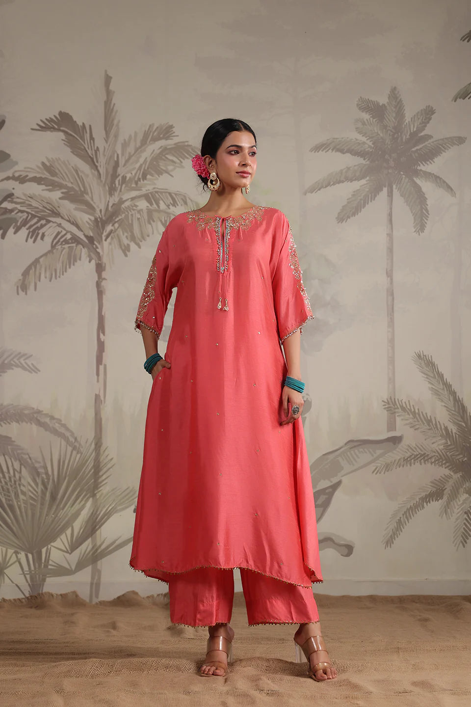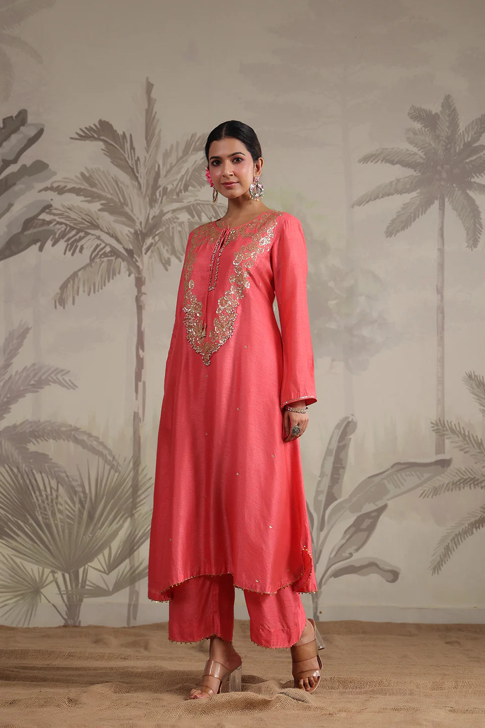 Carrot Pink Roselyn Neck Embroidered Kurta Set