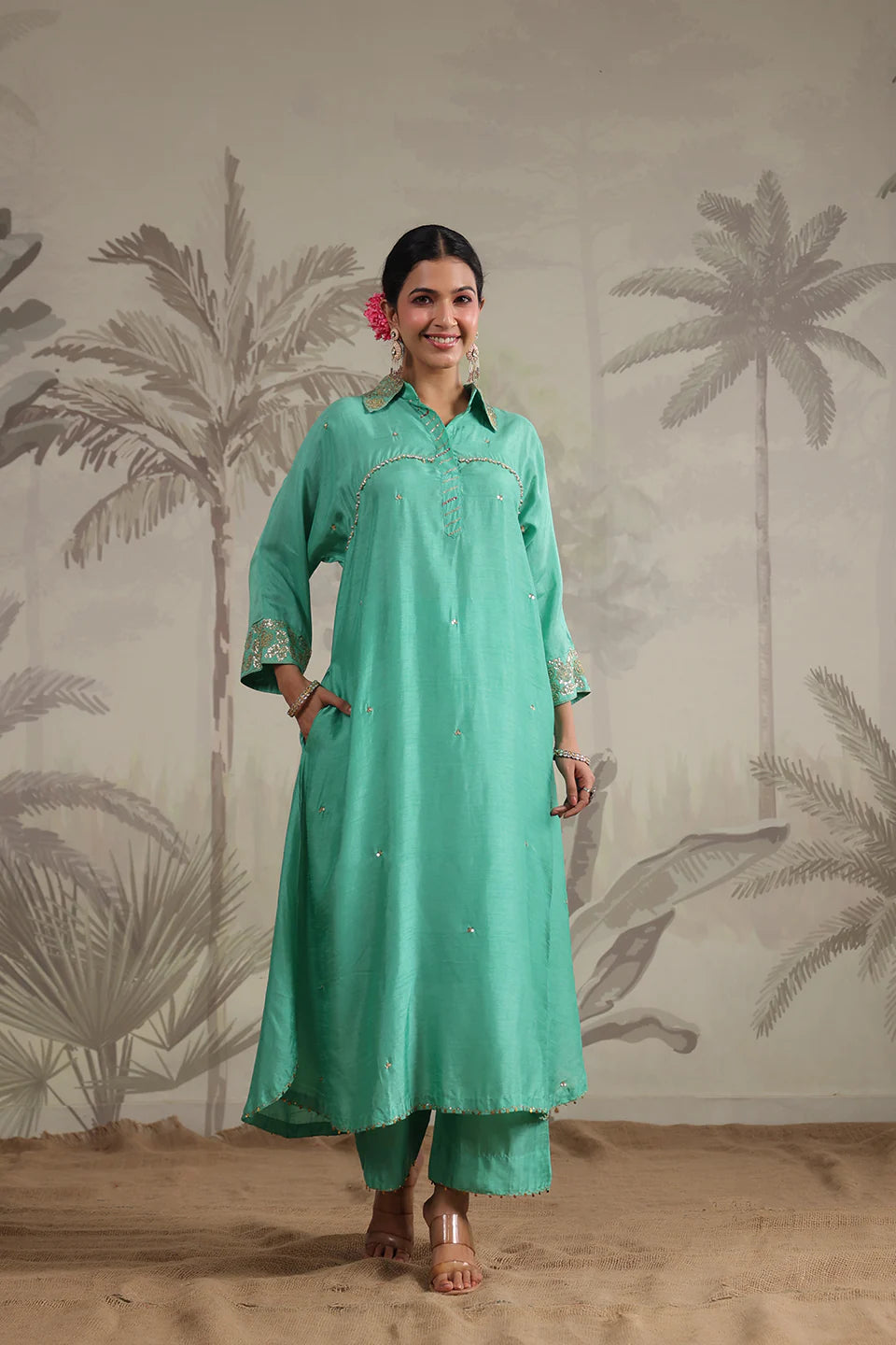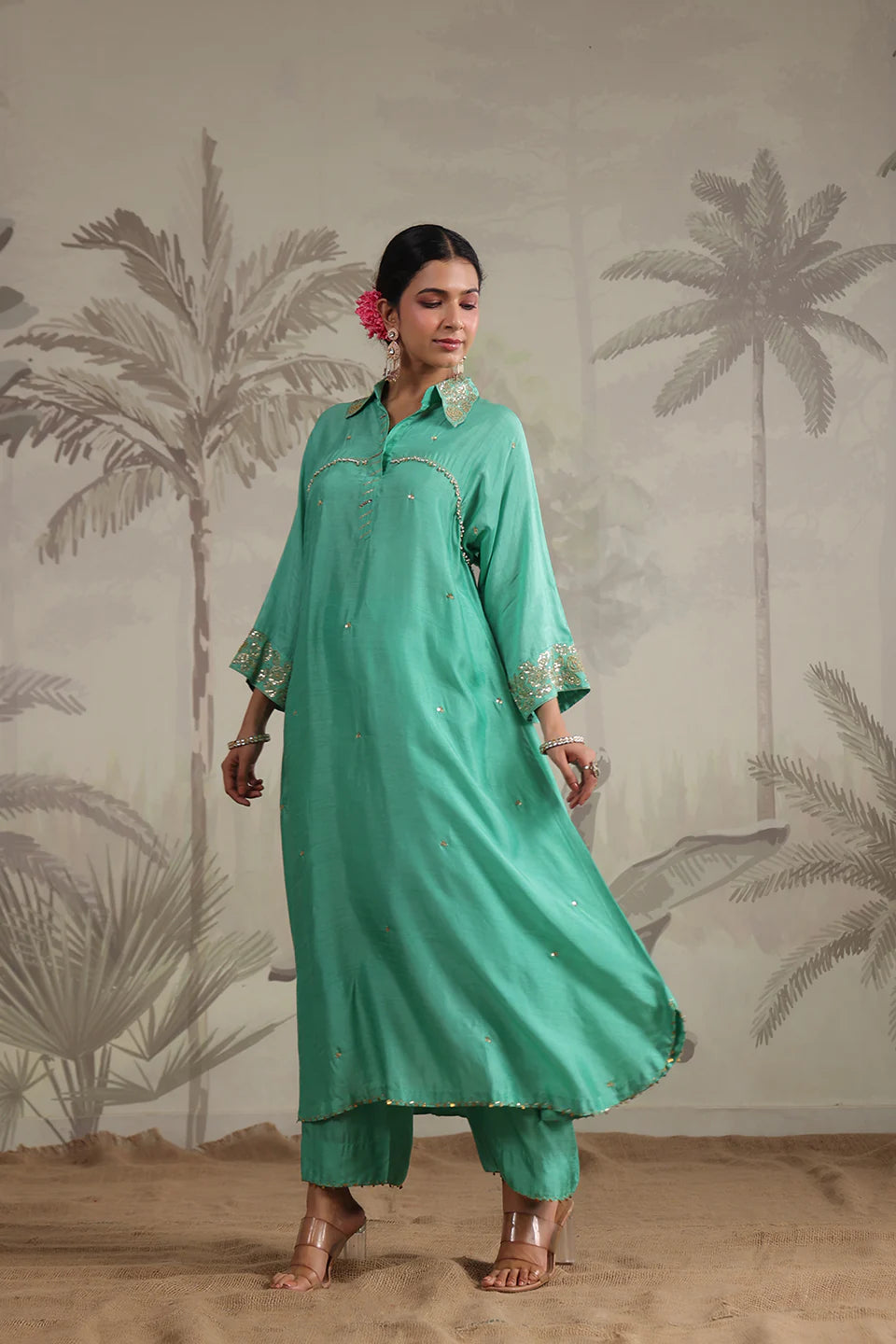 Sea Green Roselyn Collar Embroidered Kurta Set