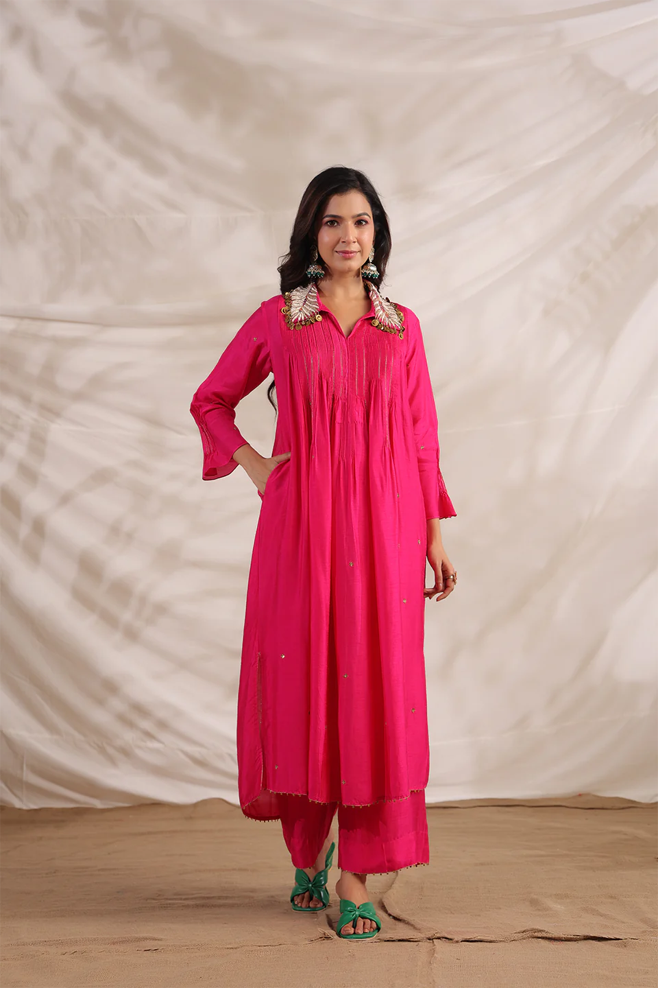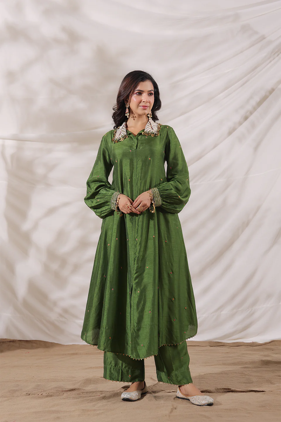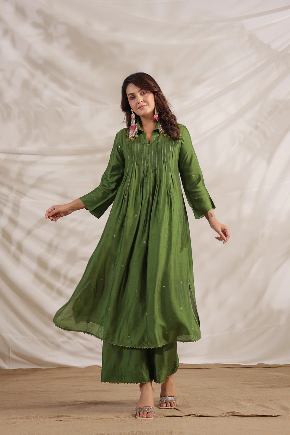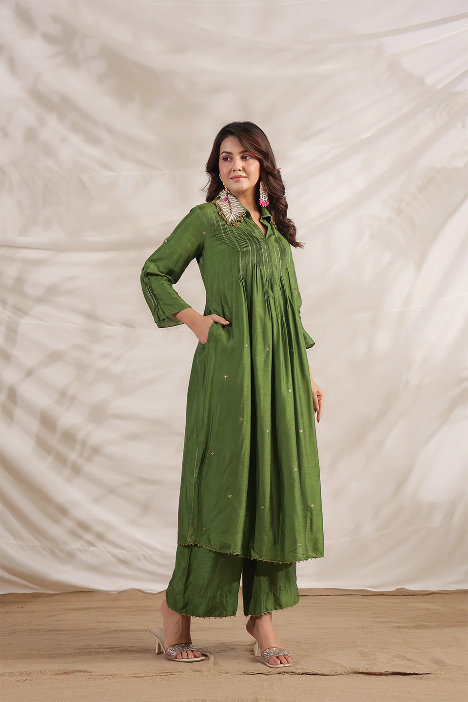 Olive Green Pankh Pintuck Embroidered Kurta Set