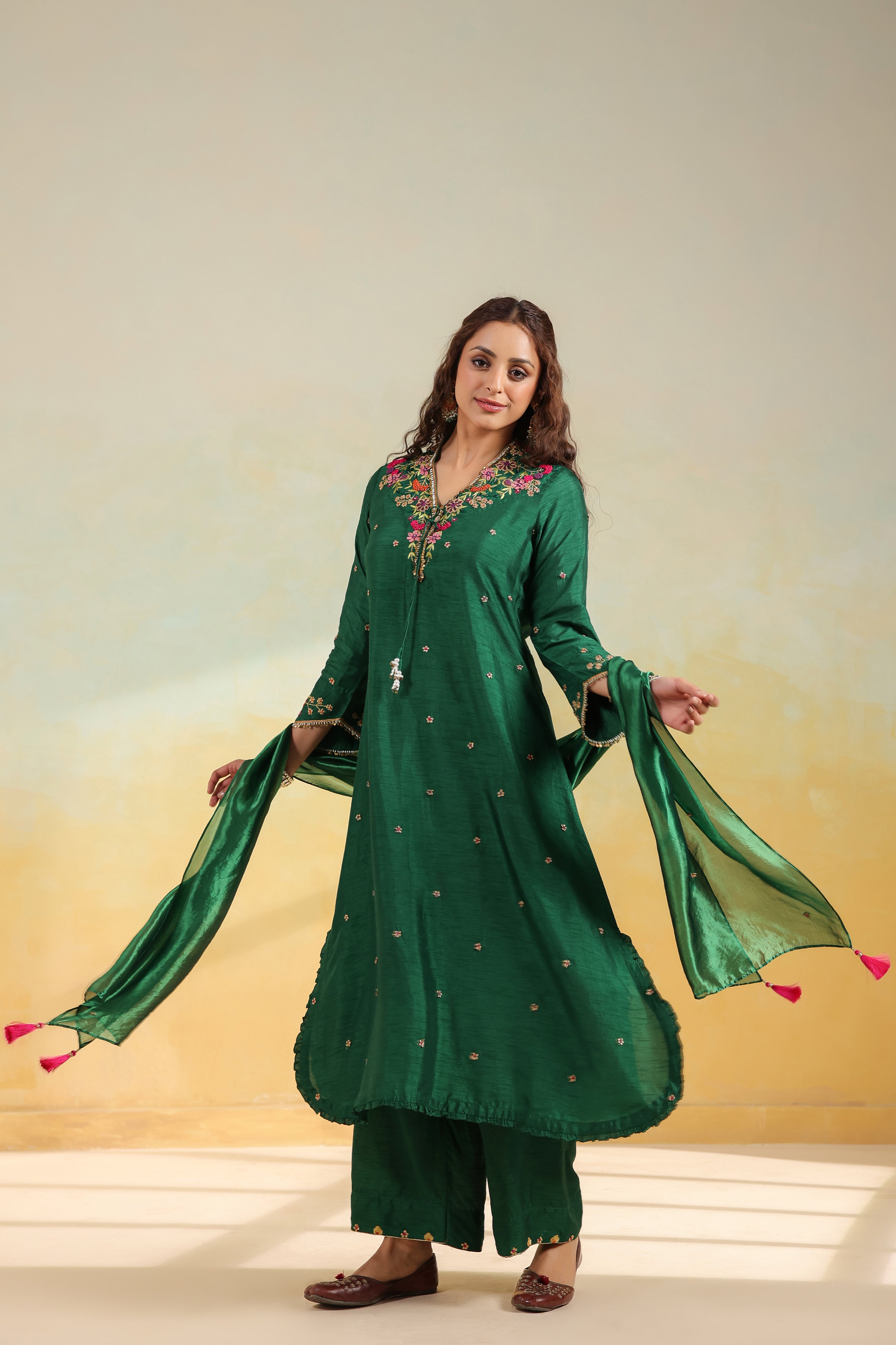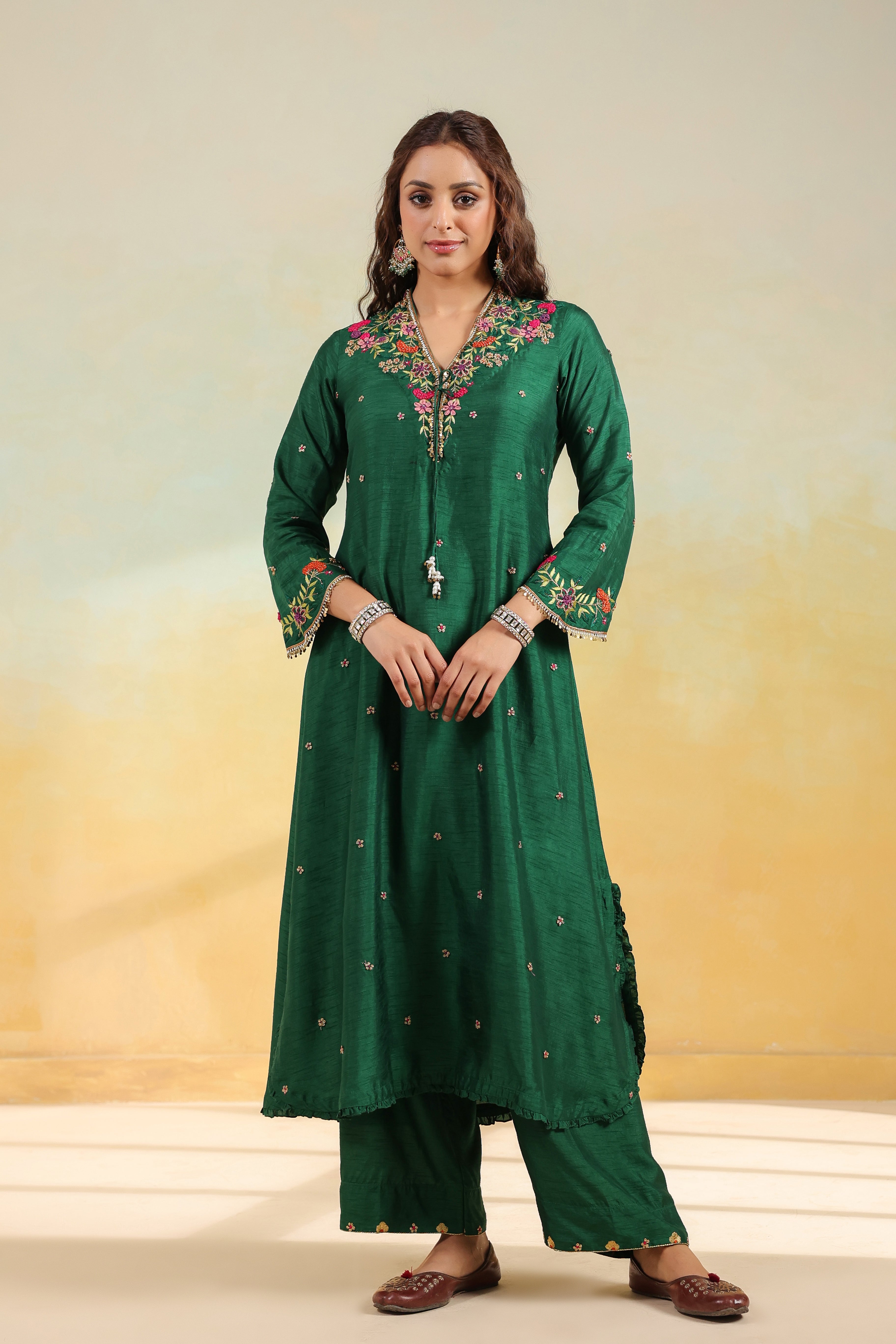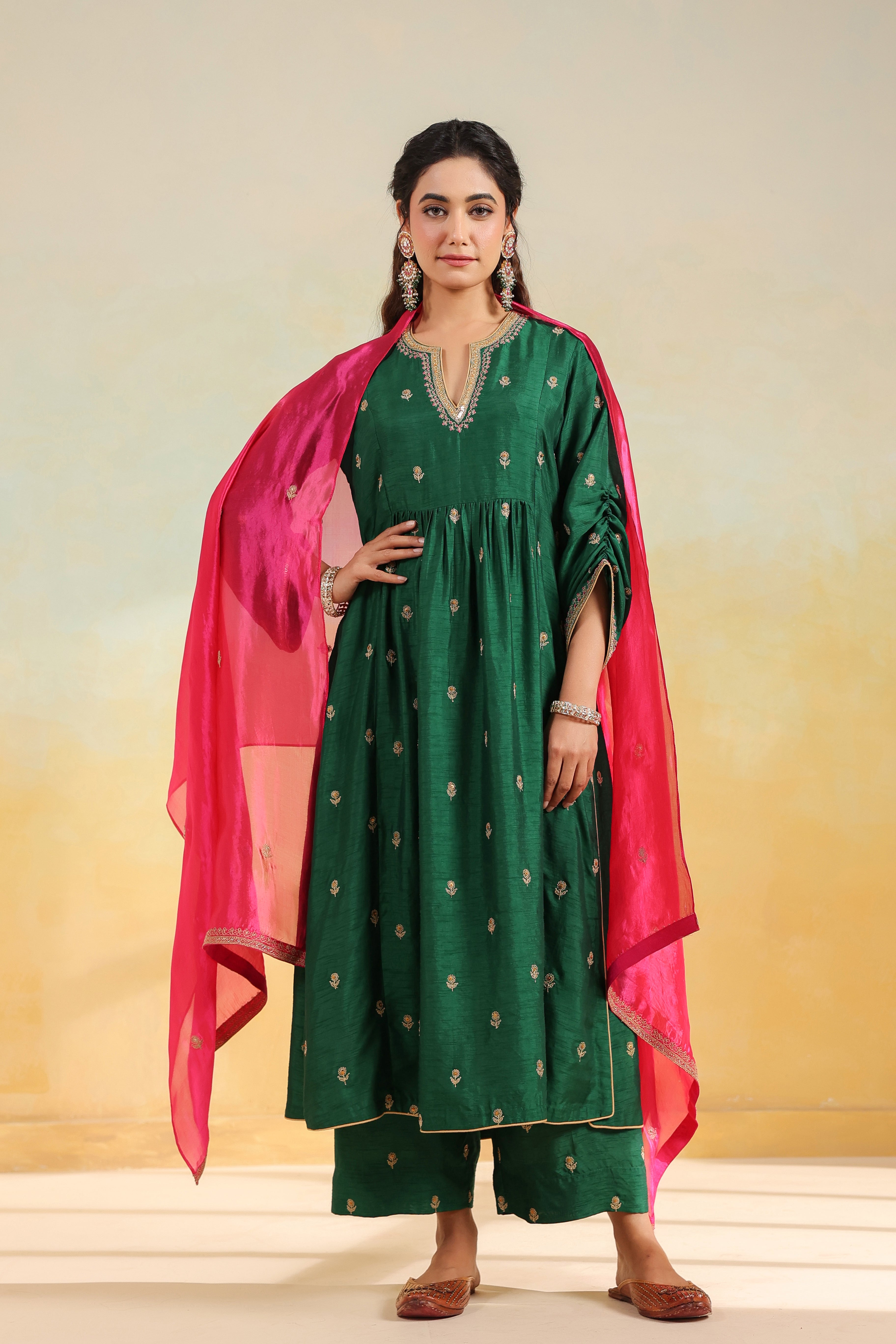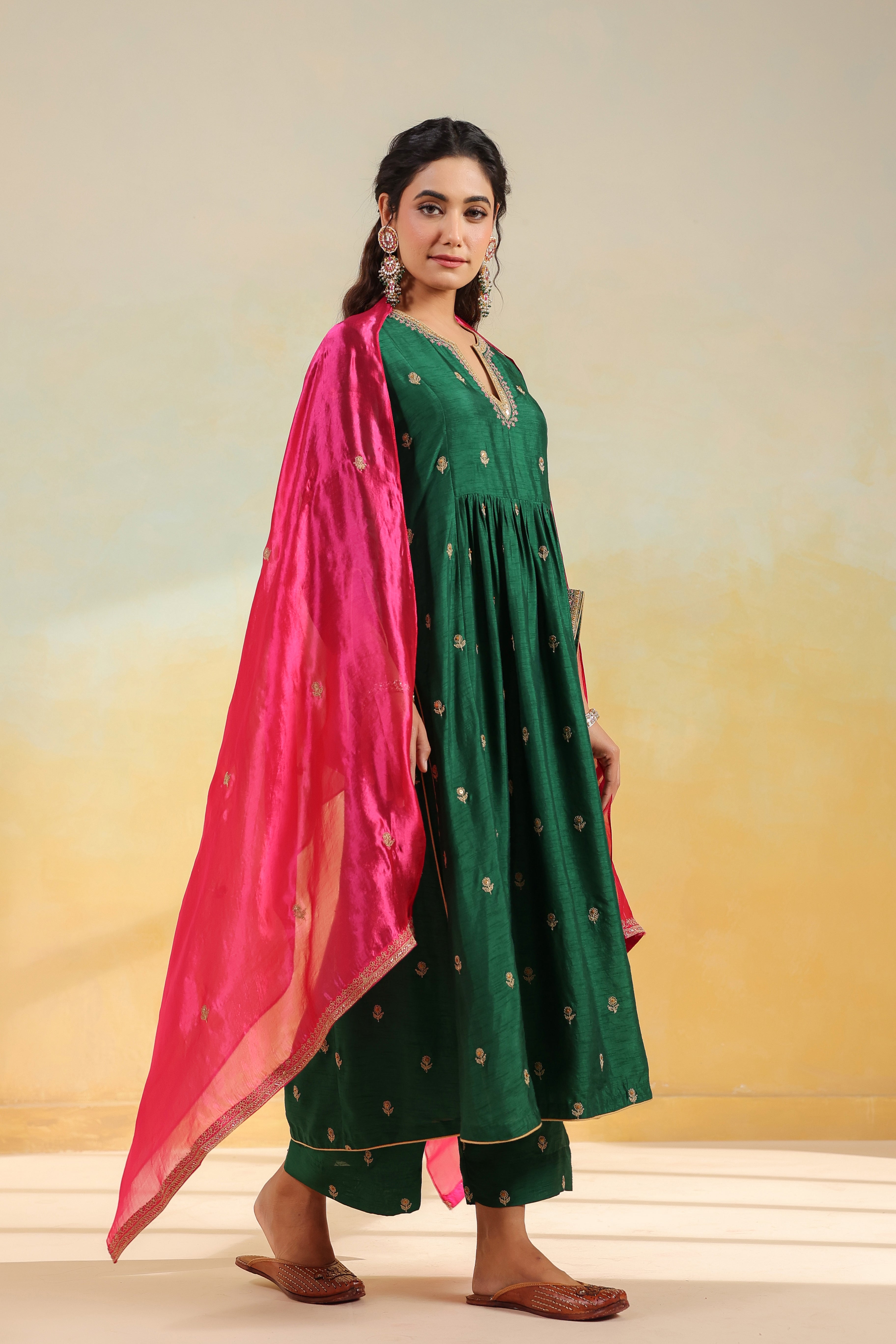 Green Multi Zardozi Buti Frockstyle Kurta set