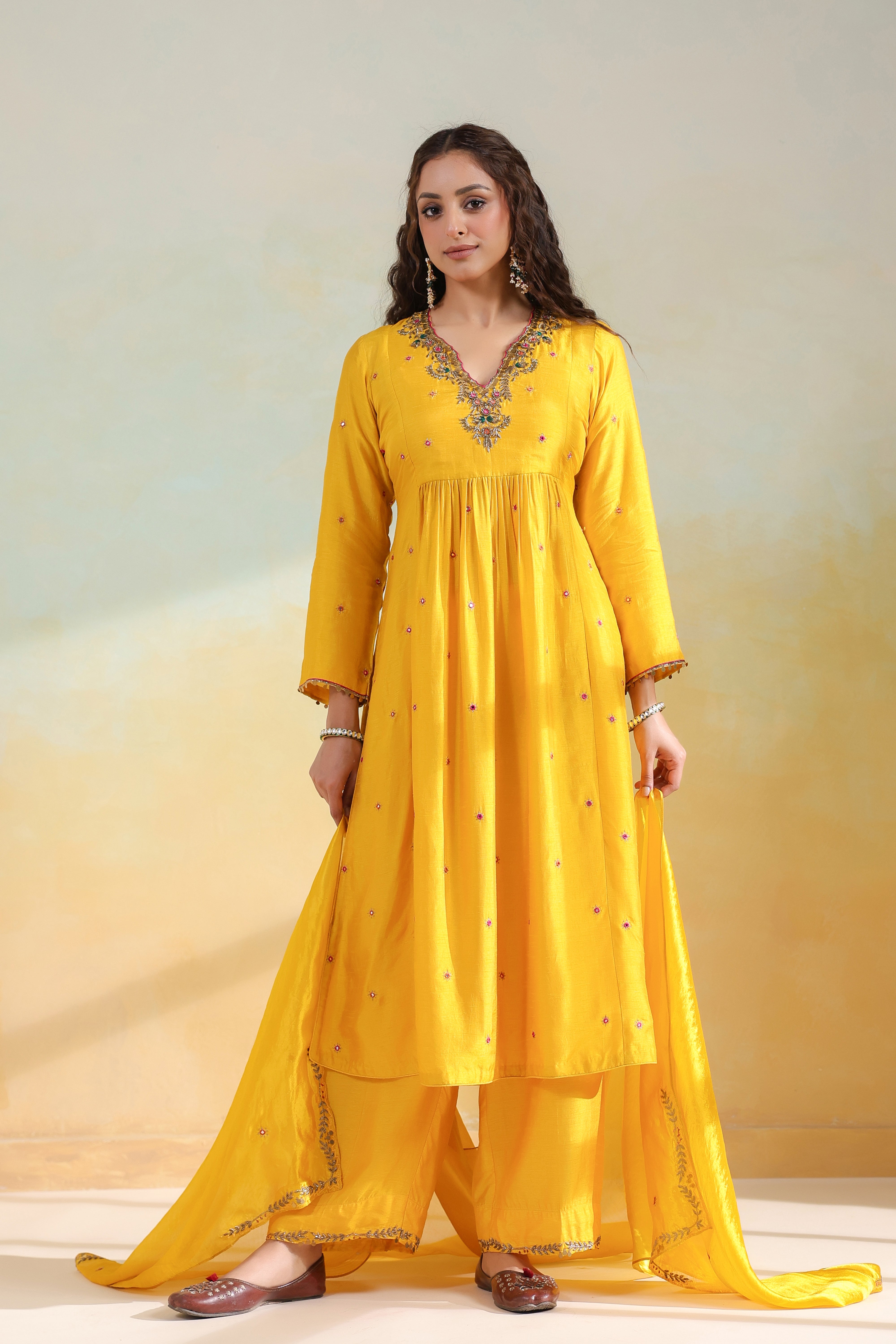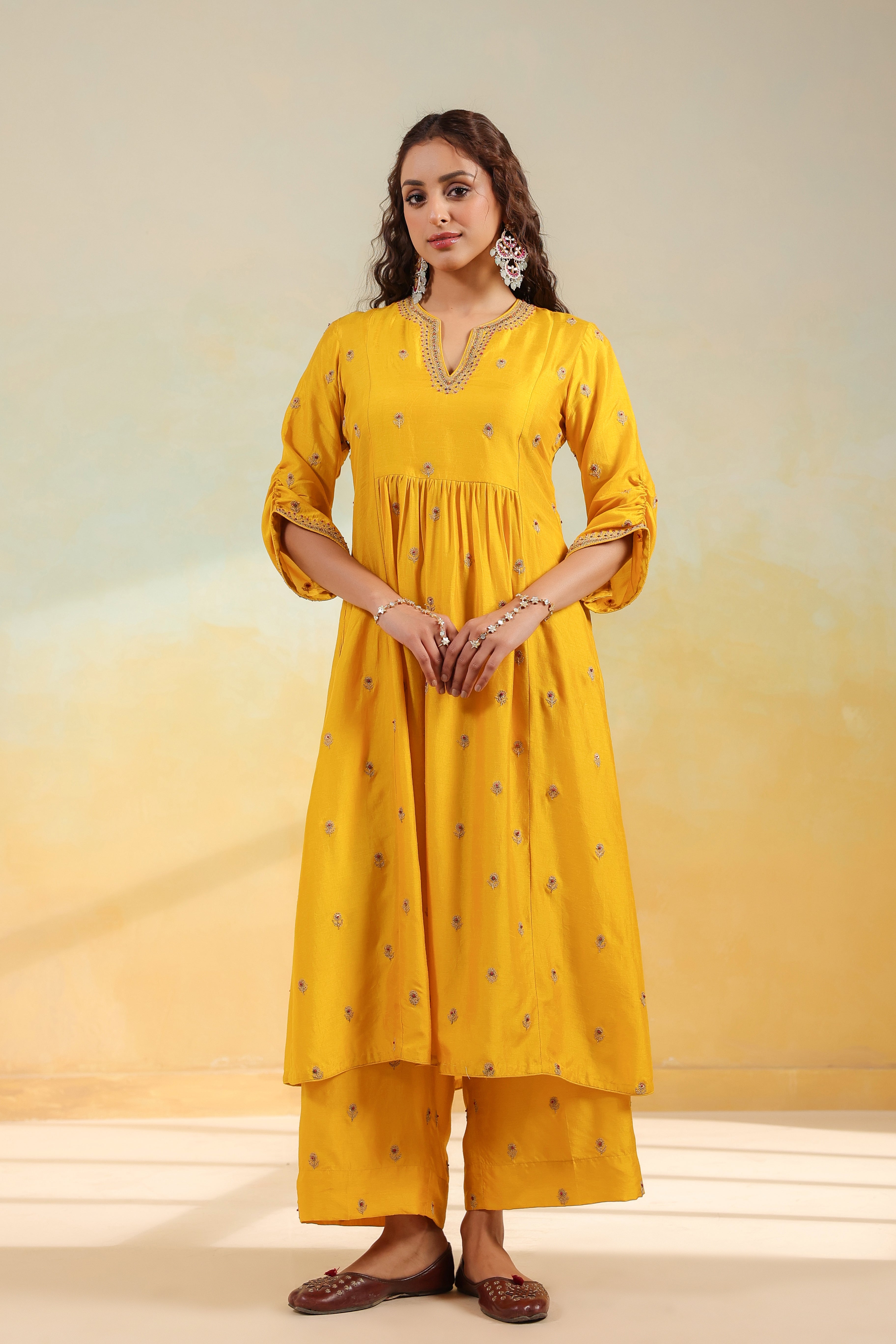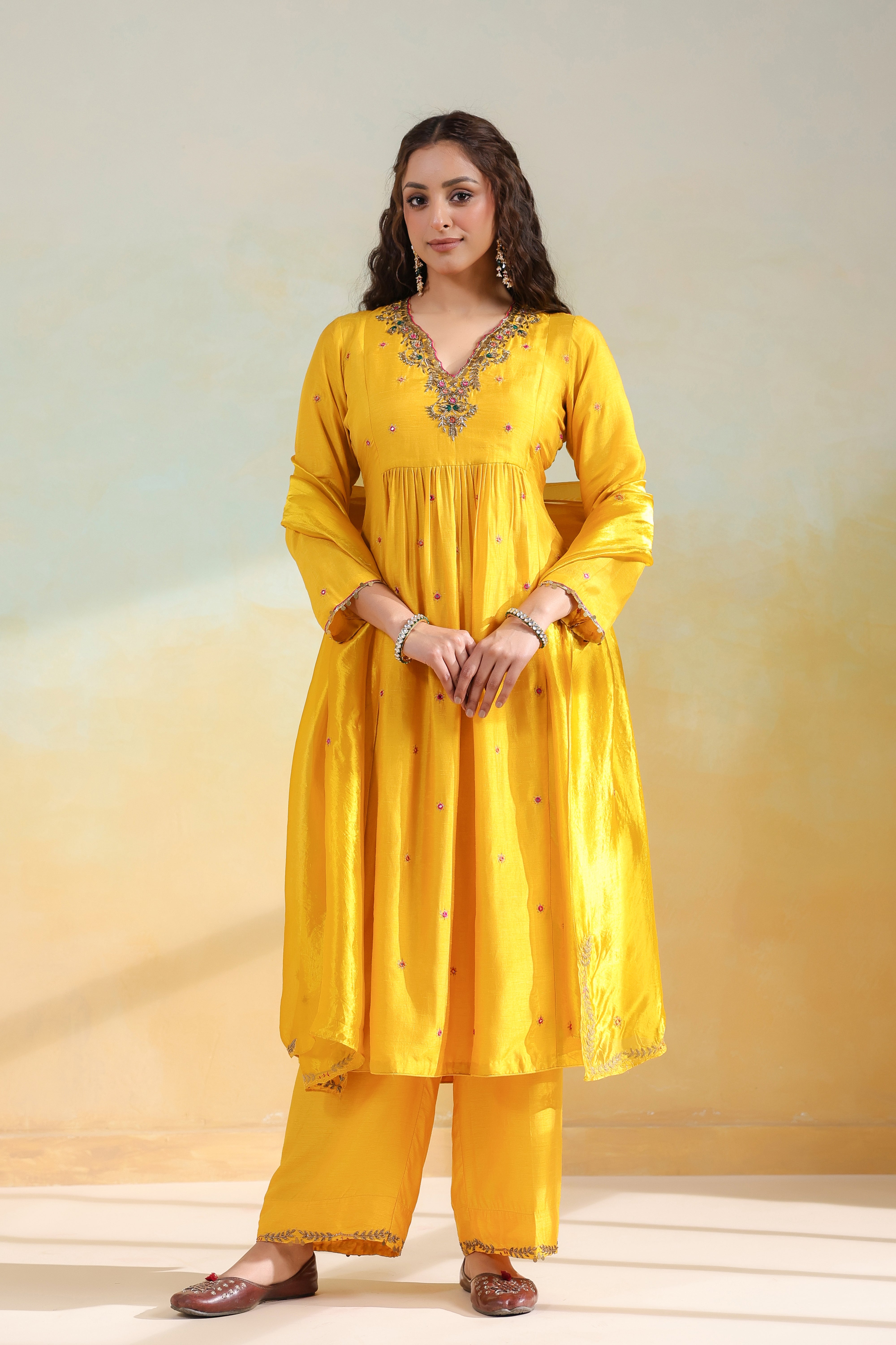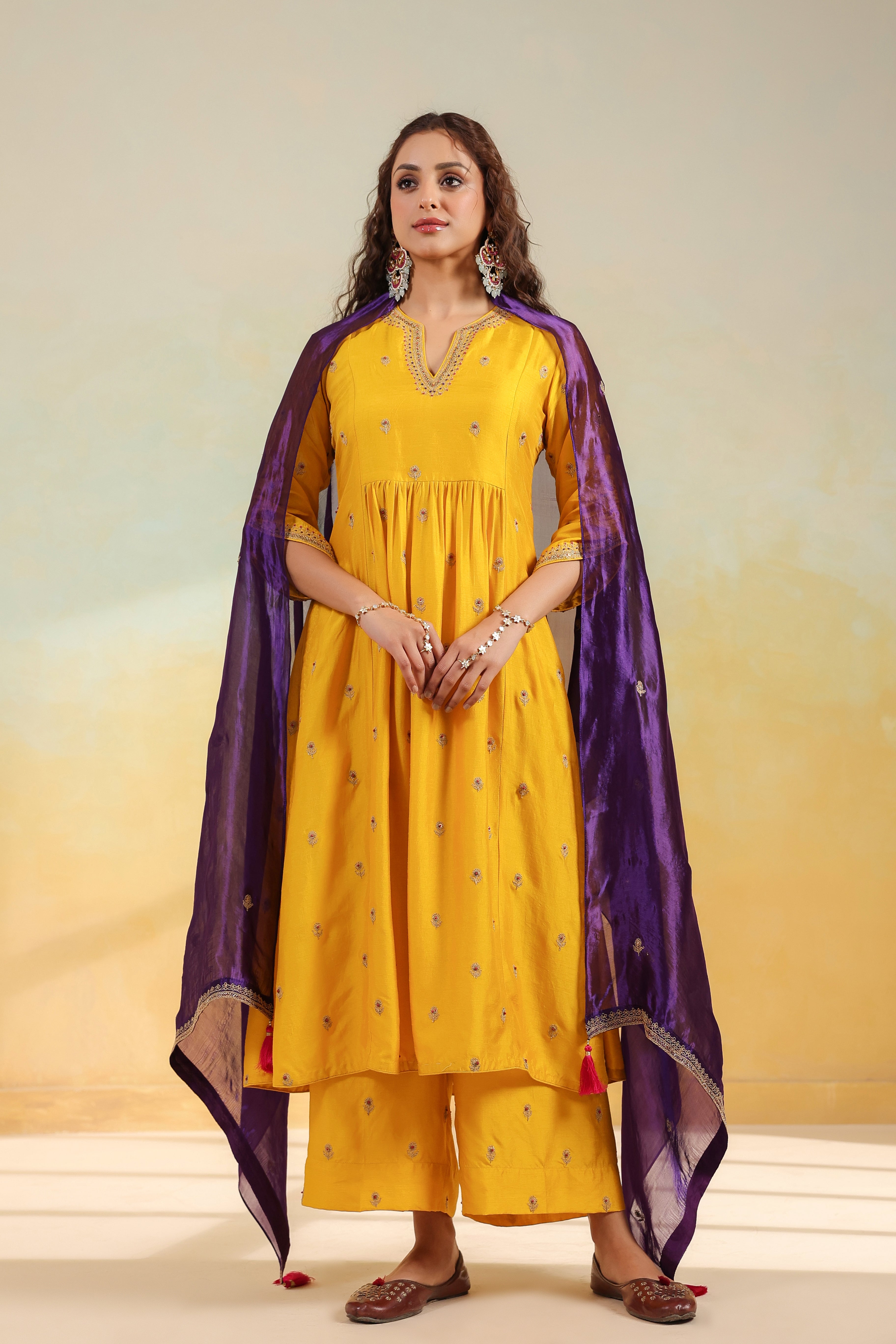 Yellow Multi Zardozi Buti Frockstyle Kurta set