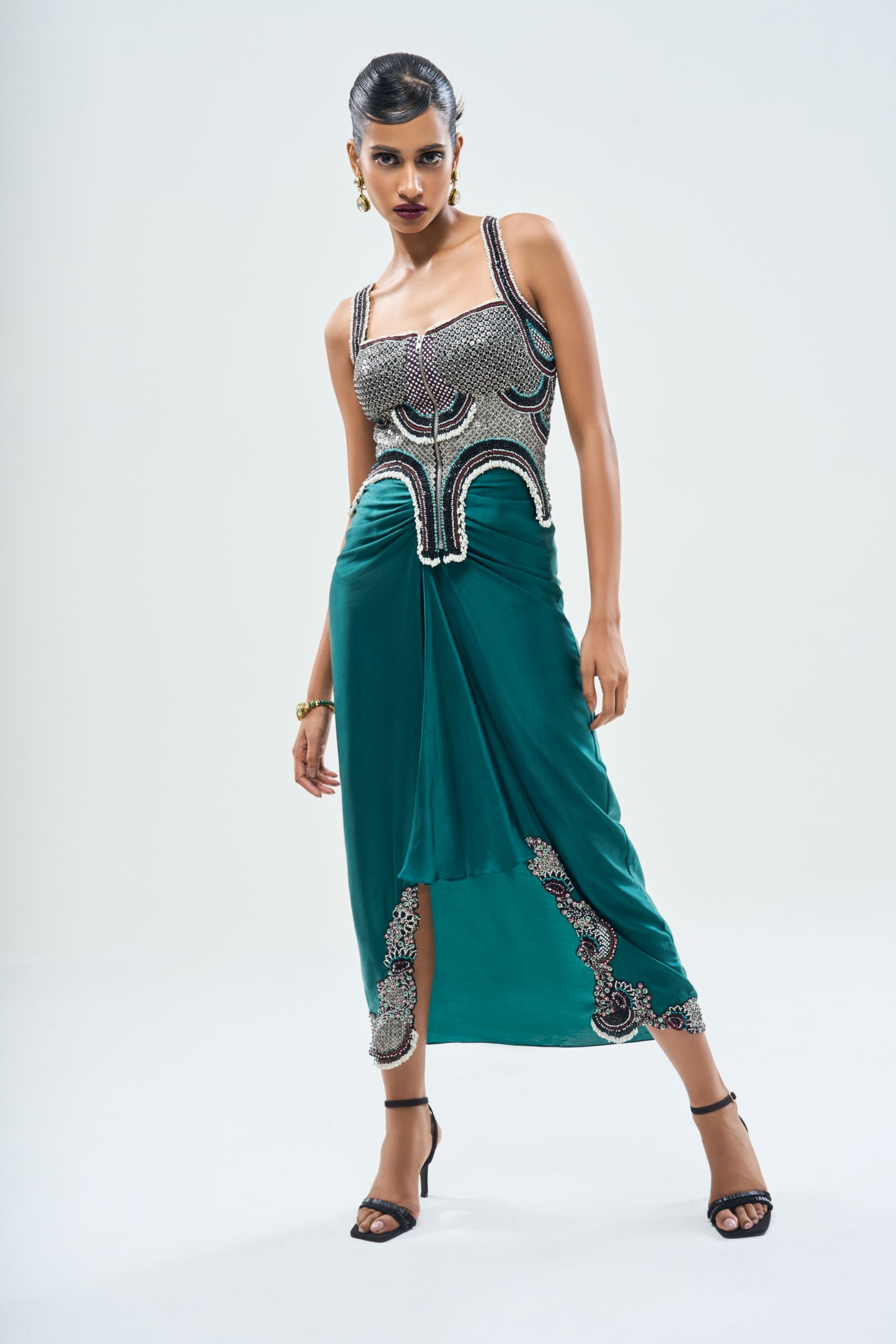 Teal Hand-Embroidered Corset With Pick Up Skirt
