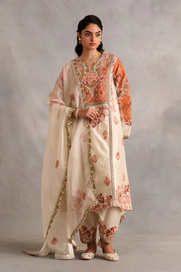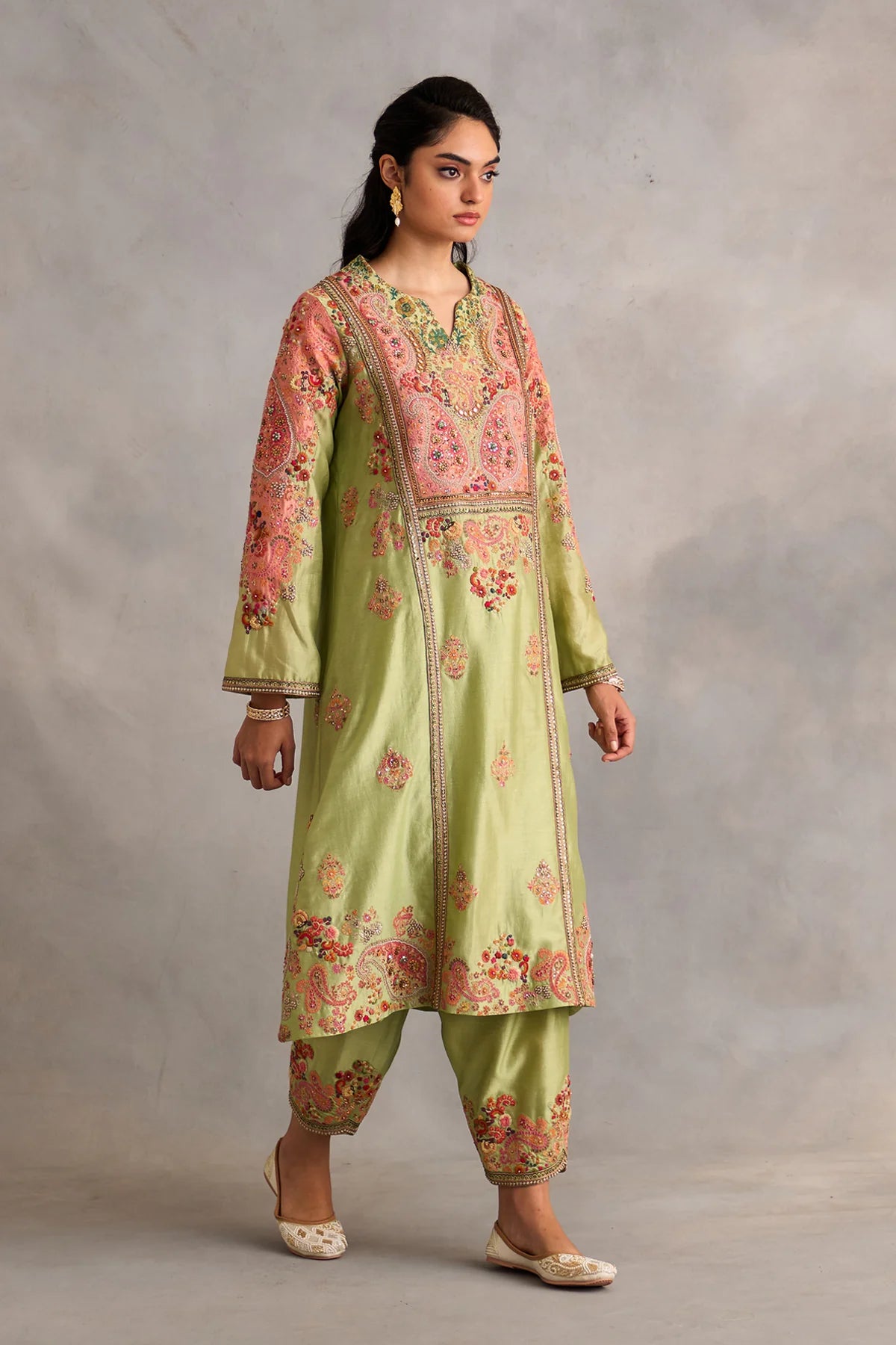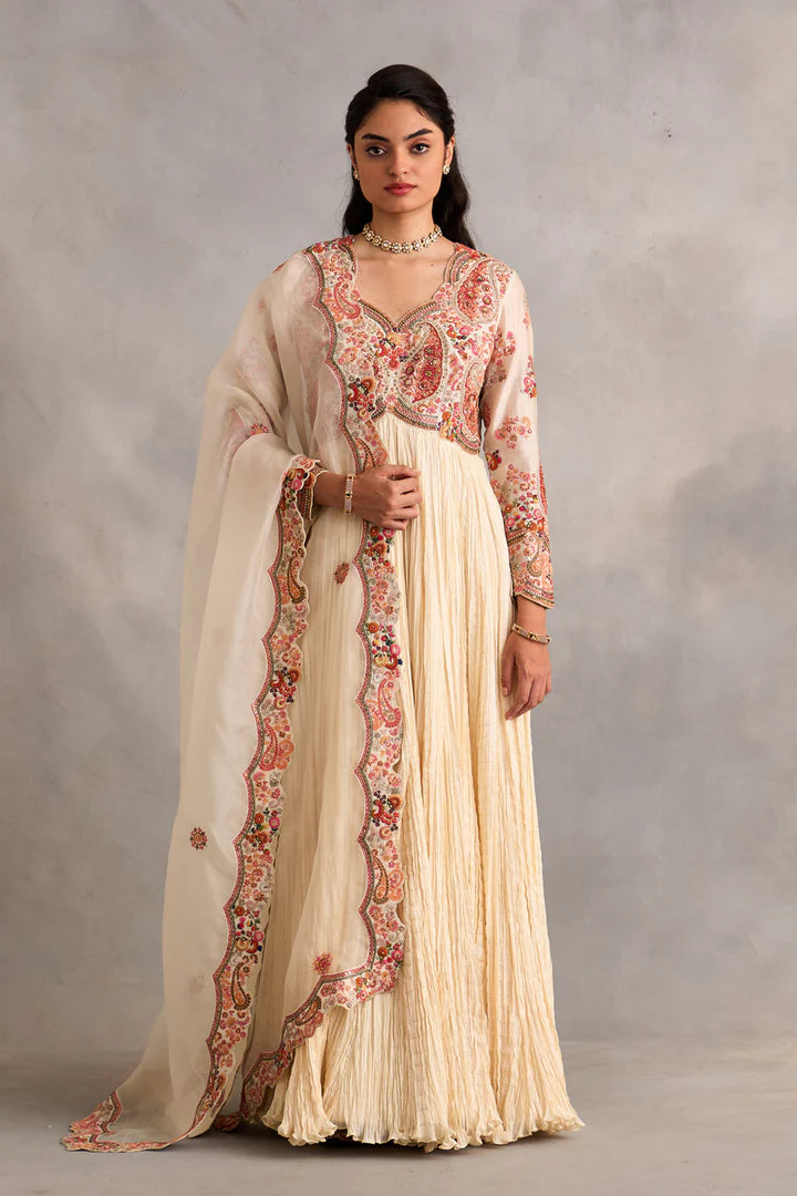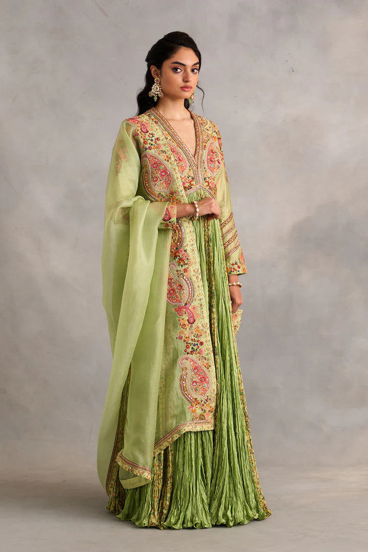 Pista Green Crushed Kalidar With Printed Panels And Dupatta