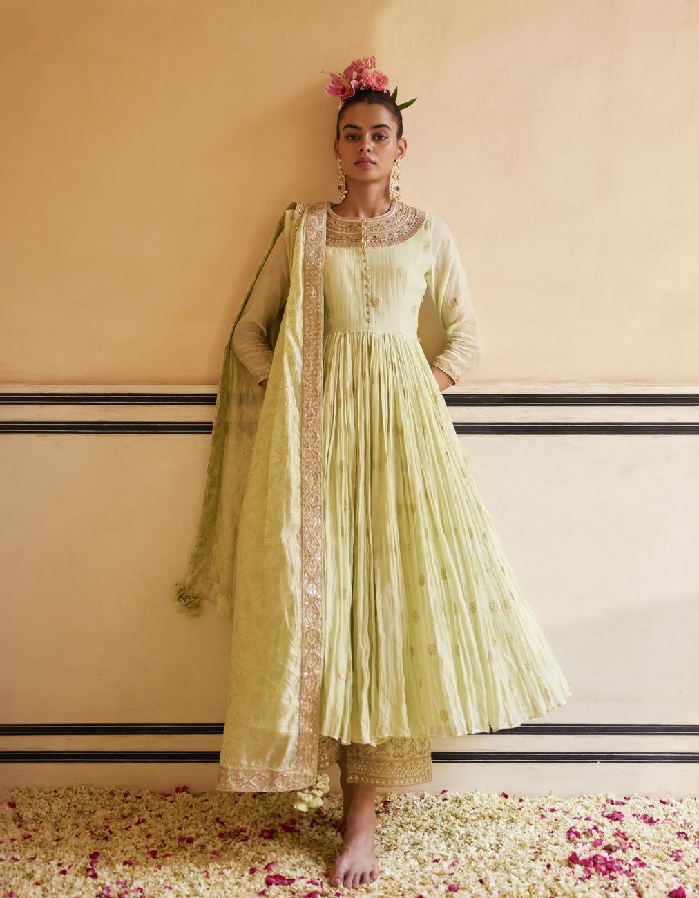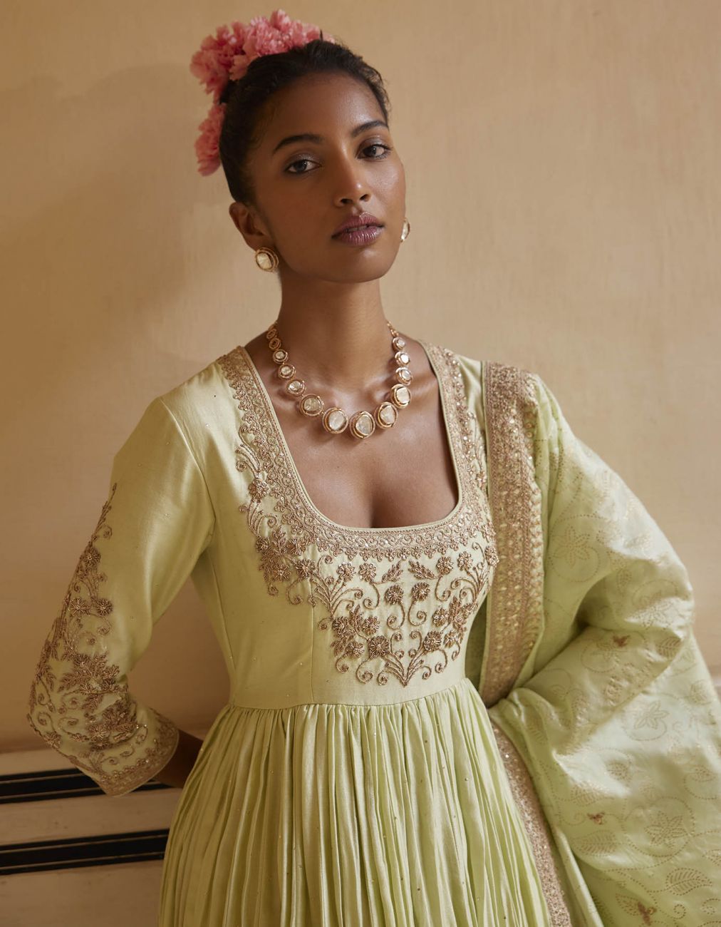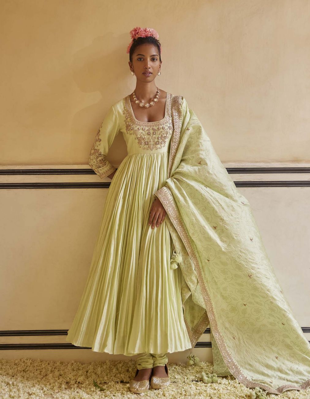 Mint Silk Anarkali Paired With Pants & Dupatta