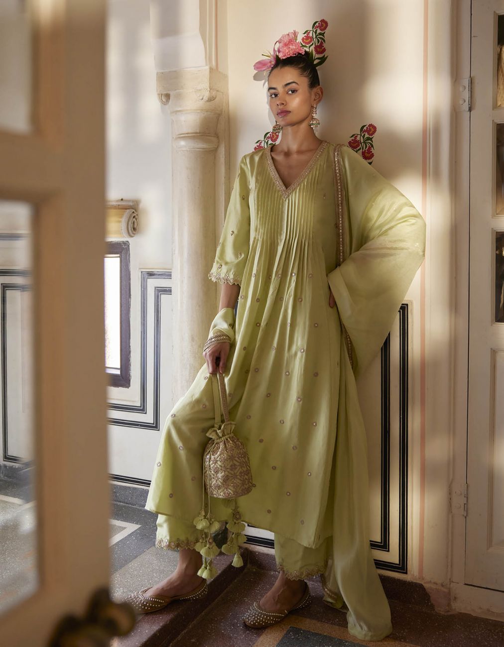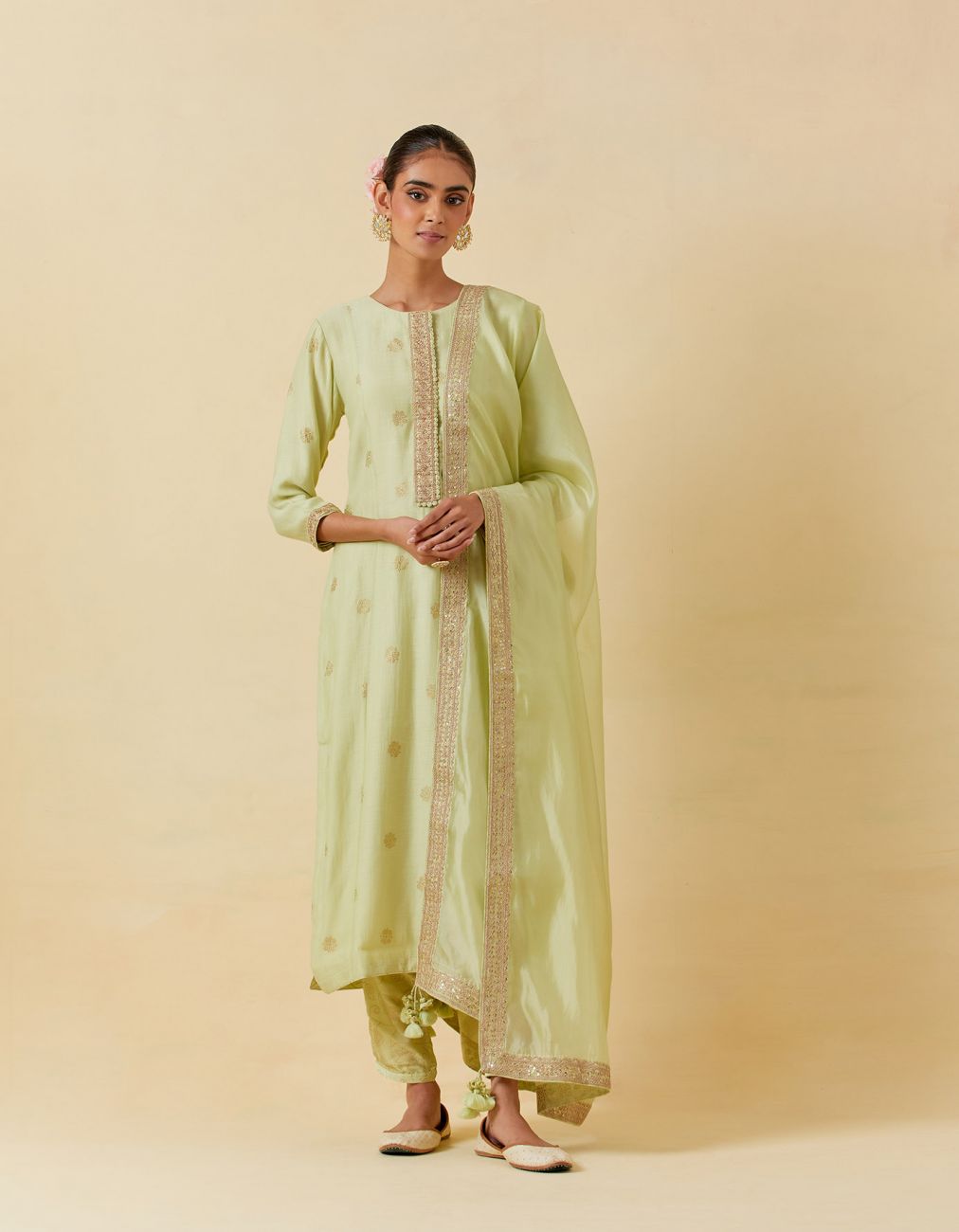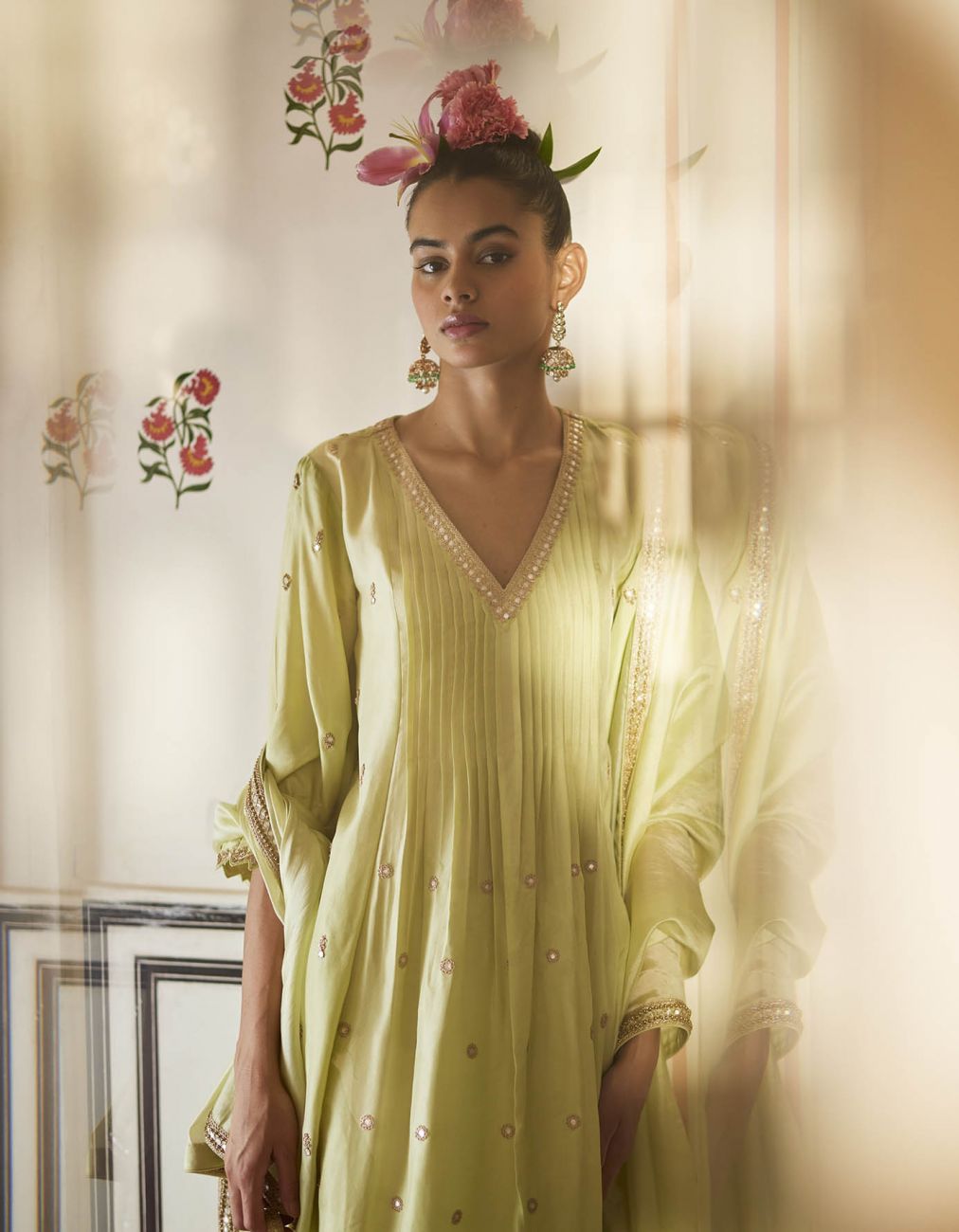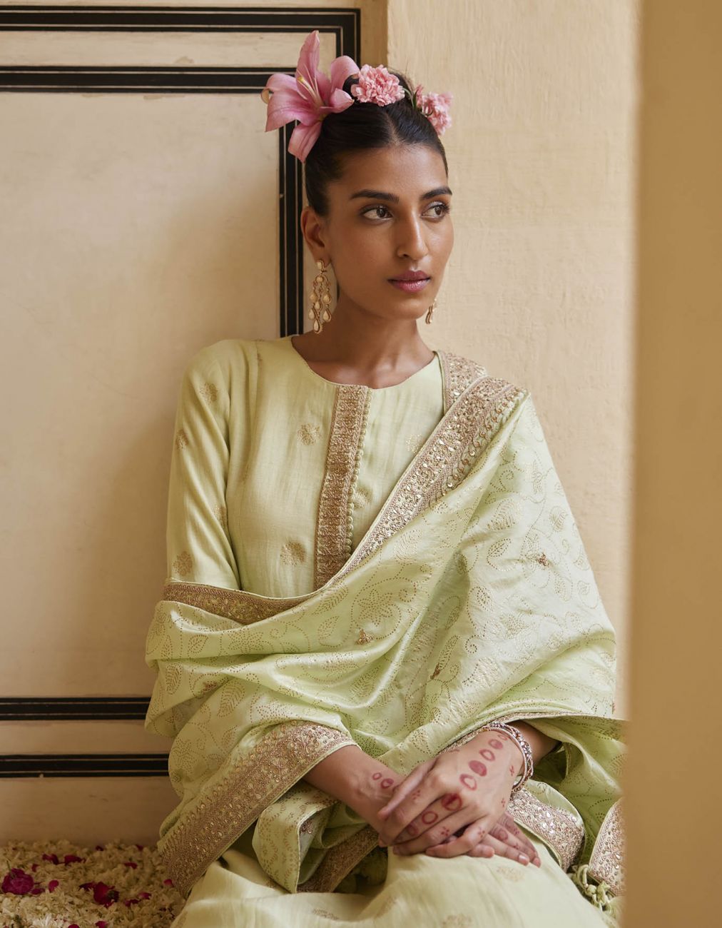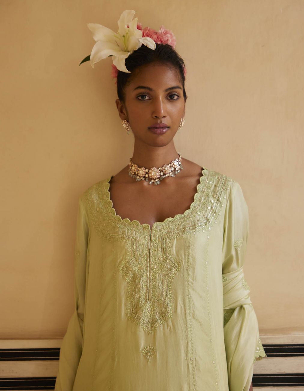 Mint Resham Work Kurta Paired With Pants & Dupatta