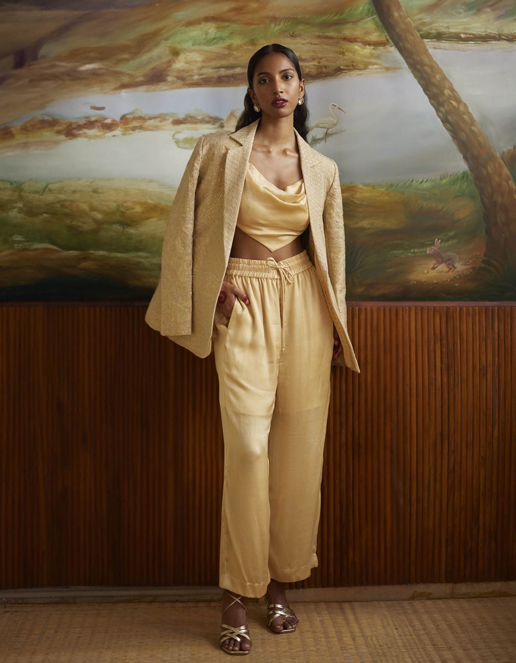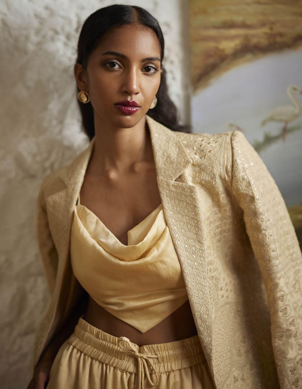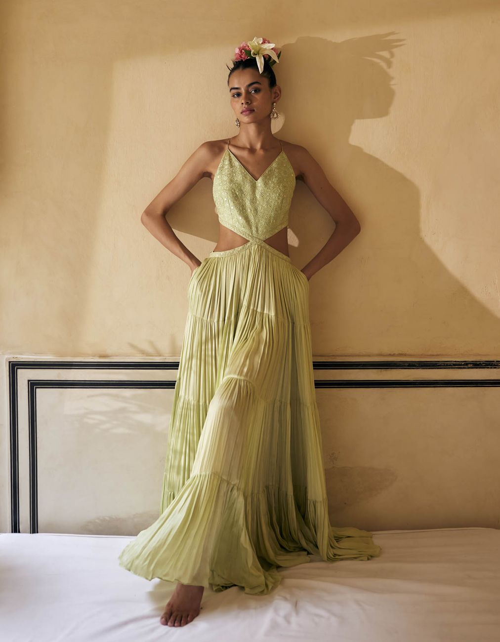 Mint Drape Skirt Paired With Cowl Top & Cape
