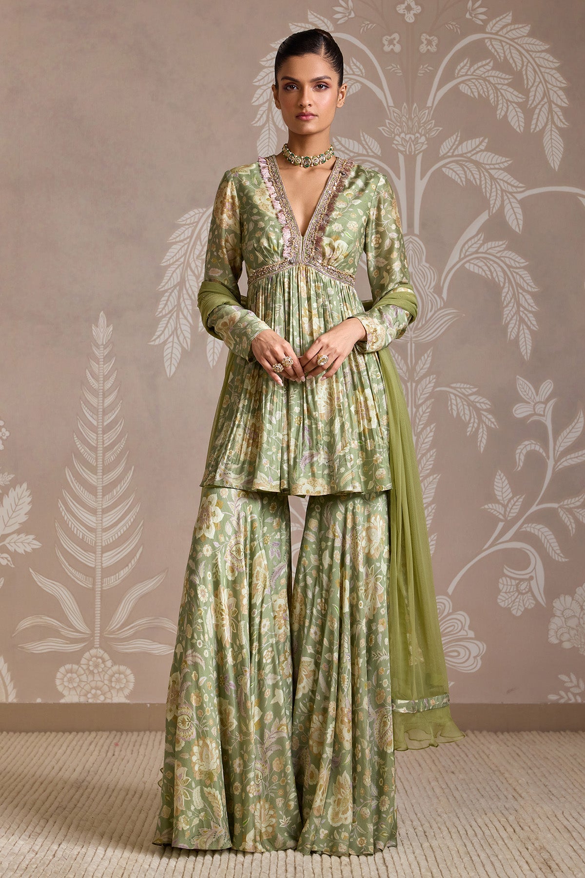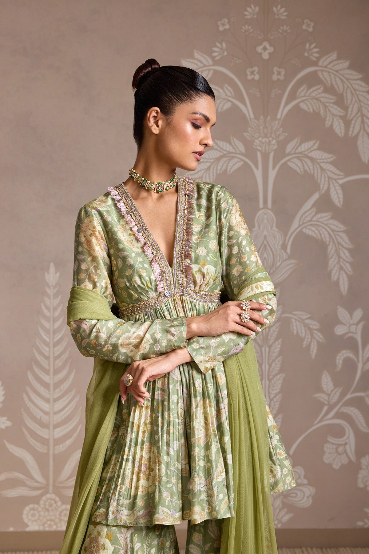 Elegant Moss Green Silk Chanderi Tunic Set with Exquisite Sleeve Embroidery