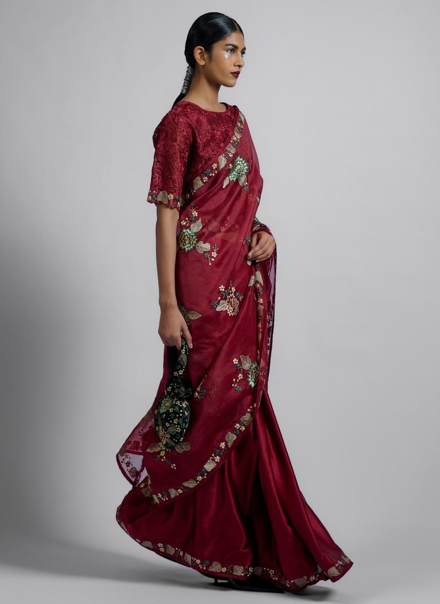 Elegant Indigo Rose Print Linen Dress with Hand Embroidery and Slip