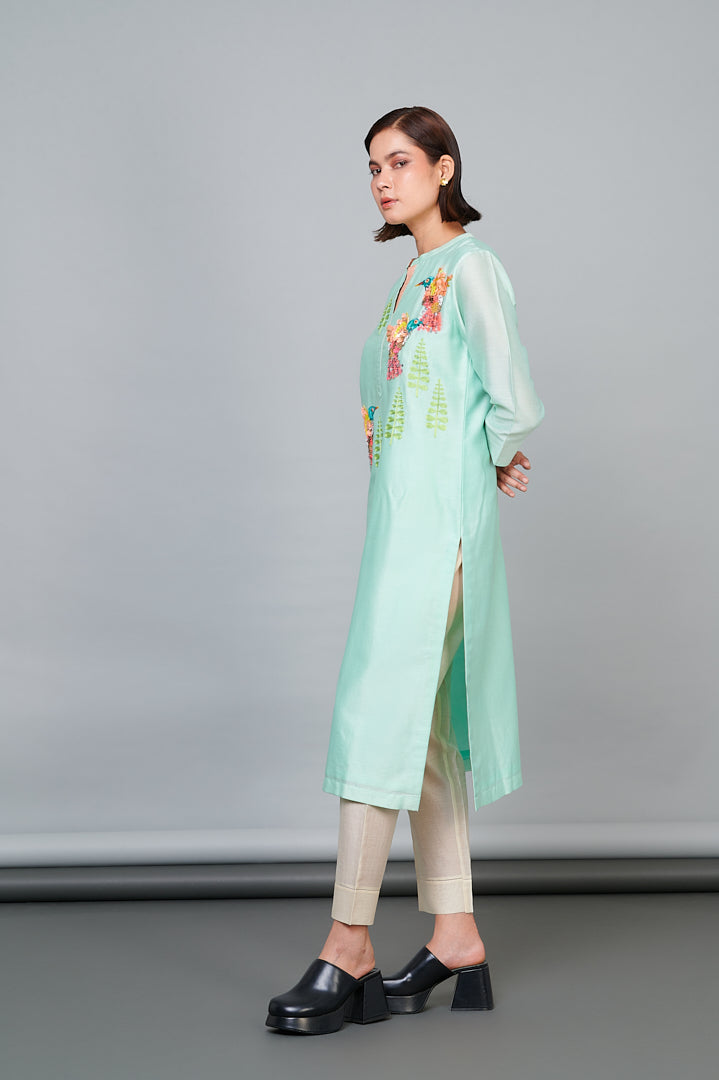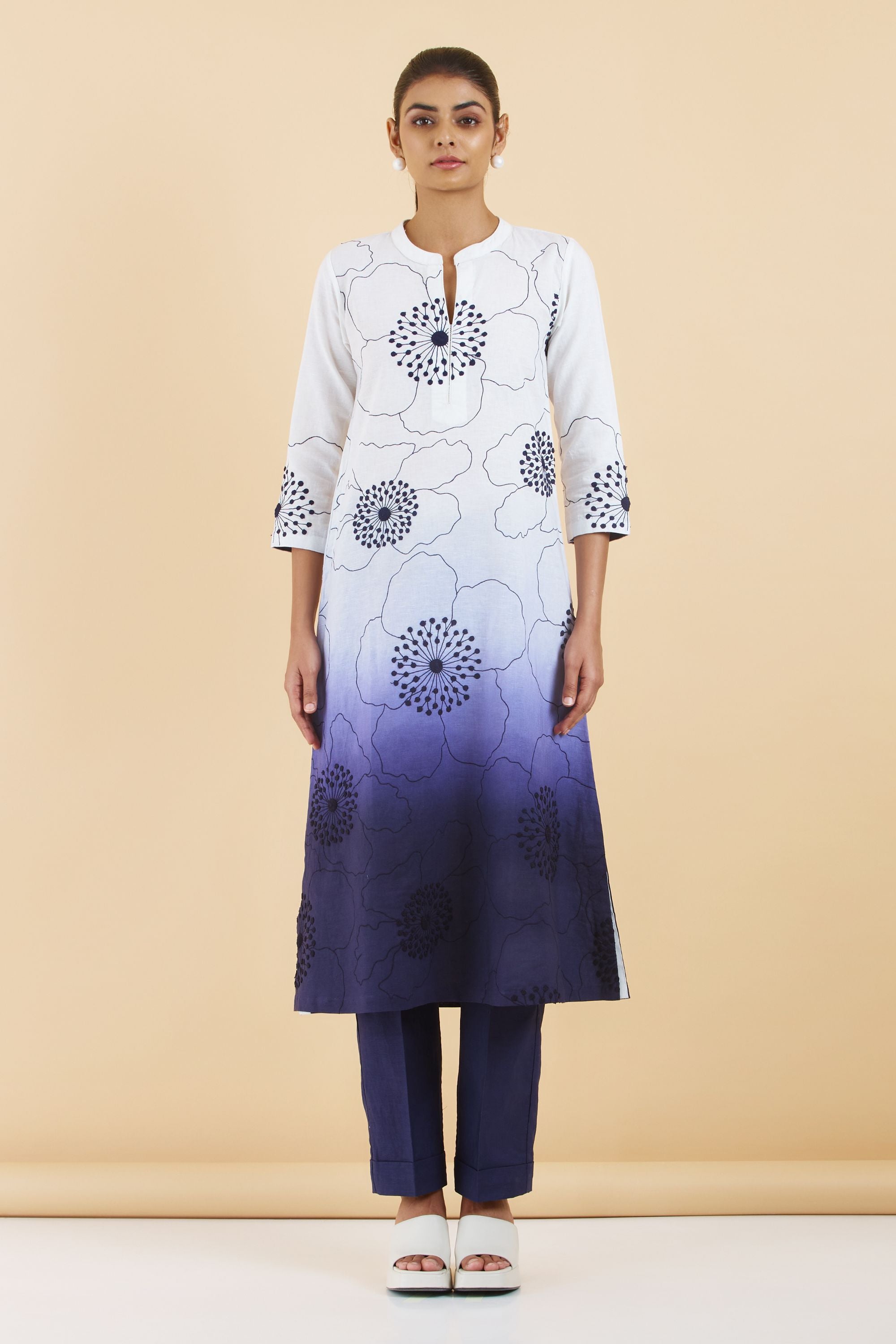 Ivory Indigo Shaded Floral Threadwork Cotton Linen Kurta Set