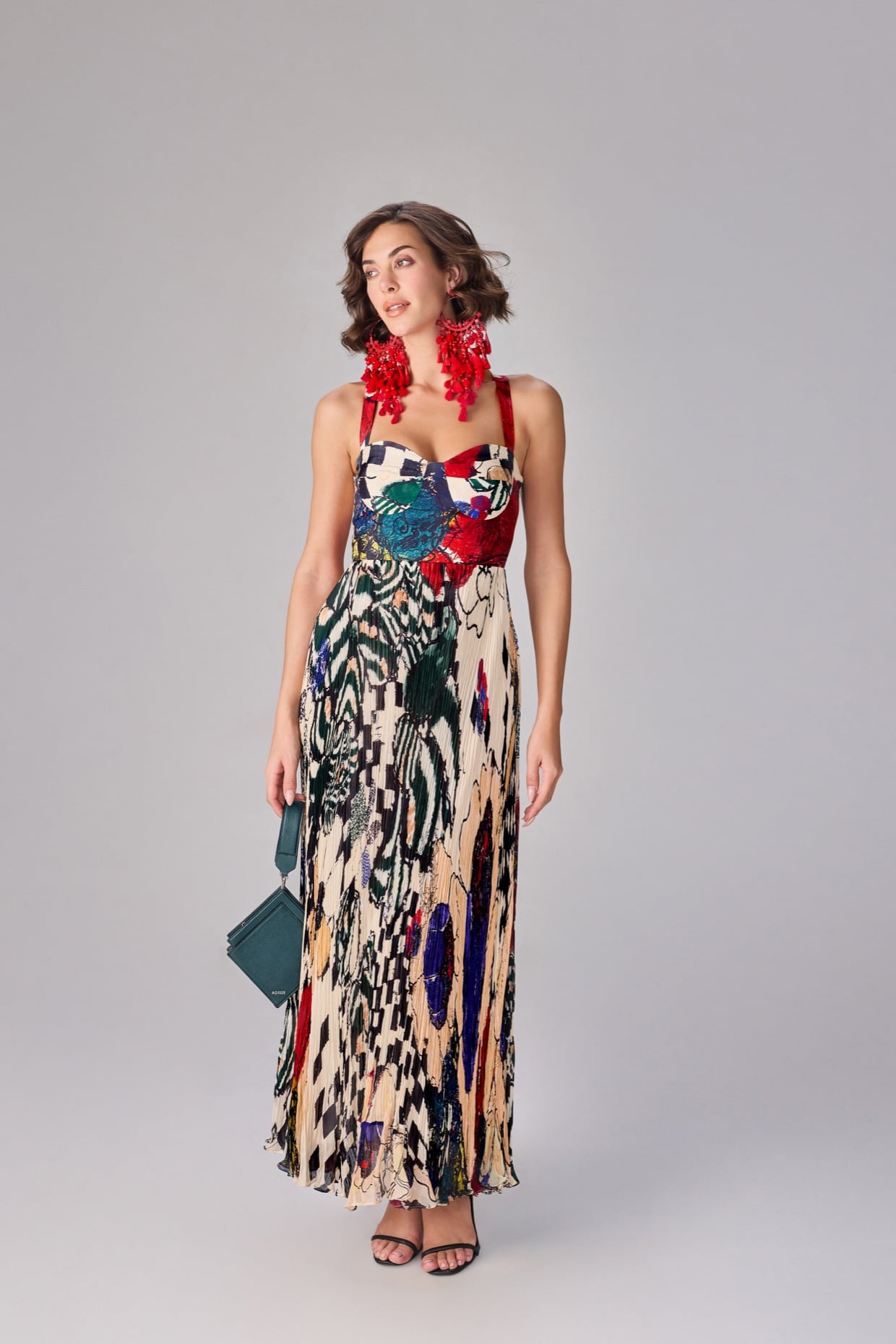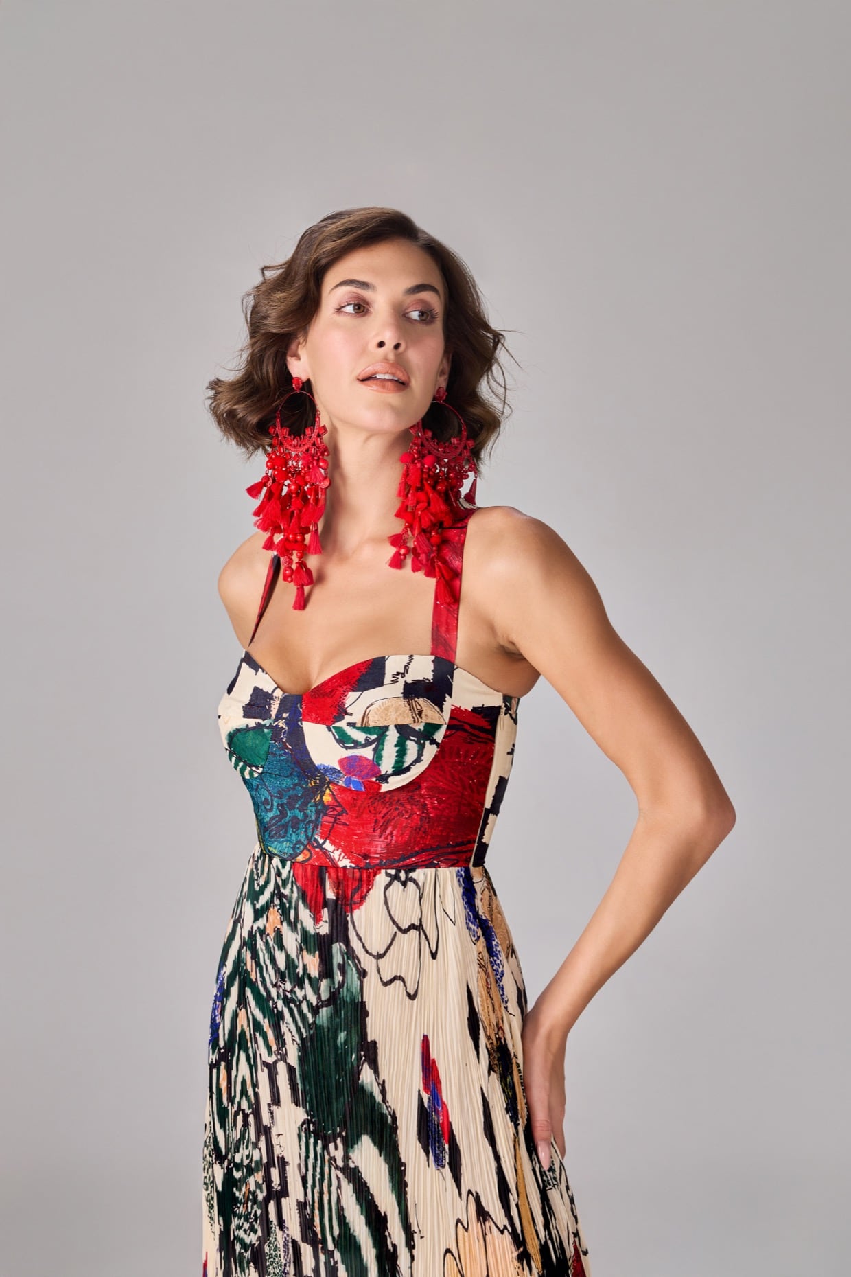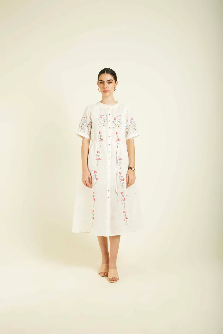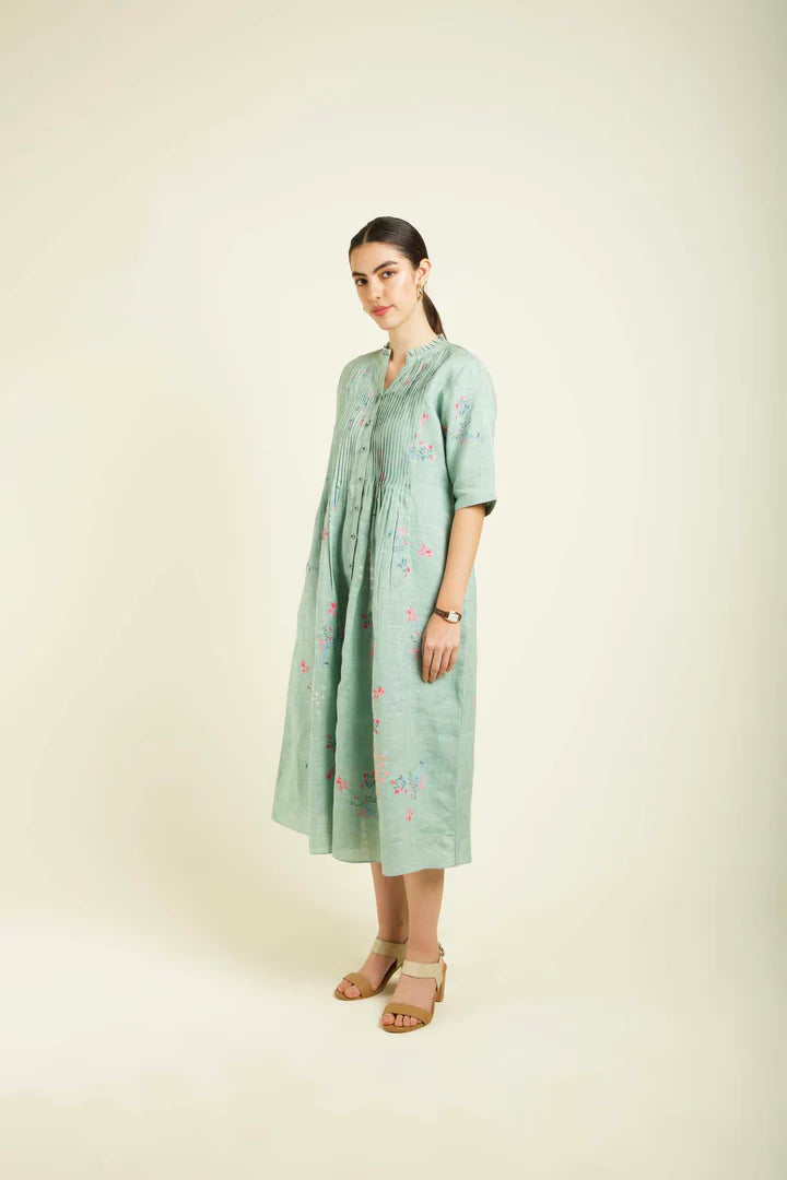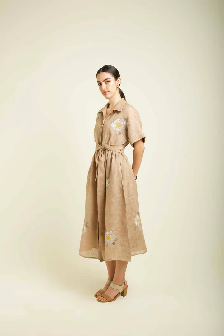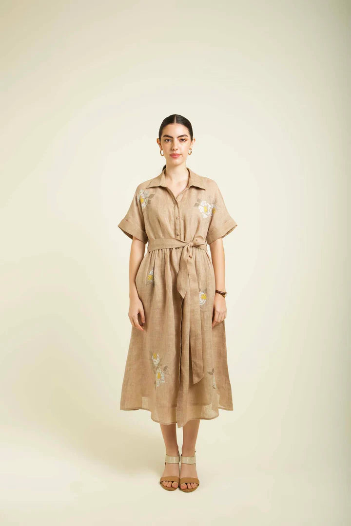 Almond Printed Gathered Dress In Linen With Embroidery Details