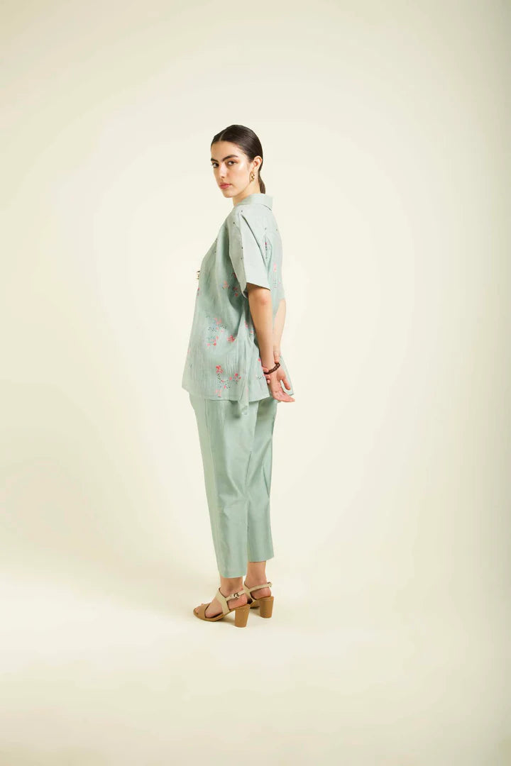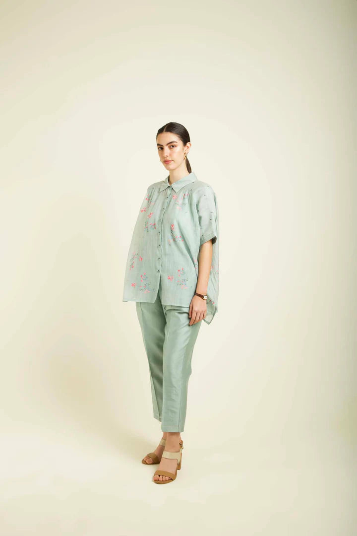 Mint Kaftan Shirt In Mul Chanderi With Embroidery Details And Straight Pants In Silk Chanderi