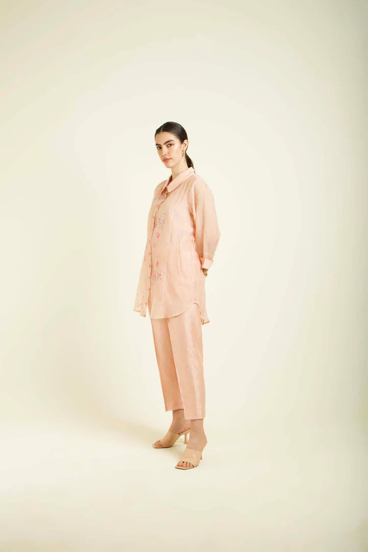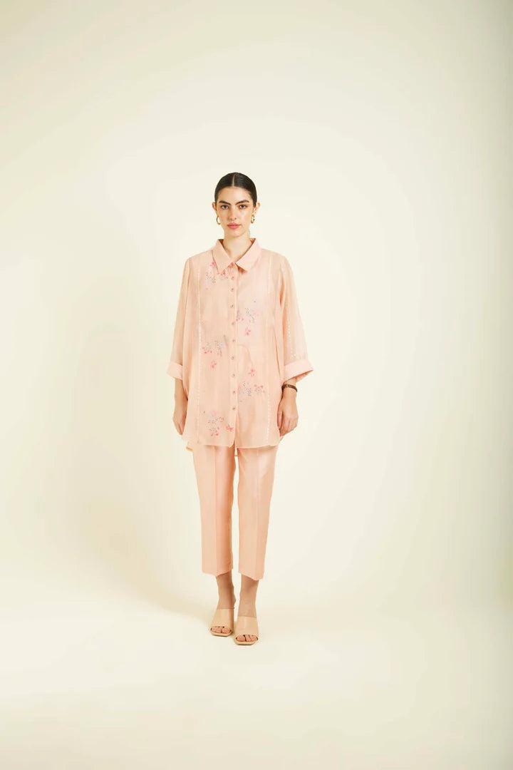 Old Rose Shirt In Mul Chanderi With Embroidey And Straight Pants In Silk Chanderi