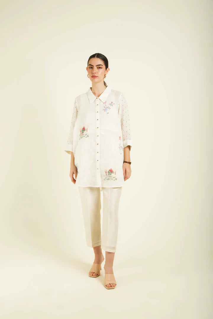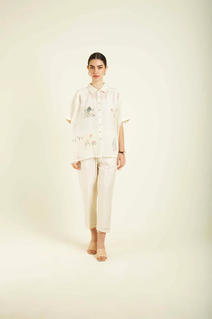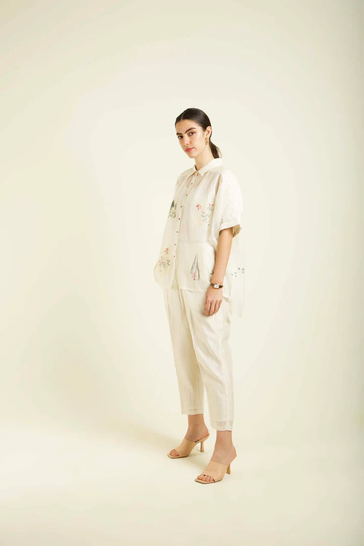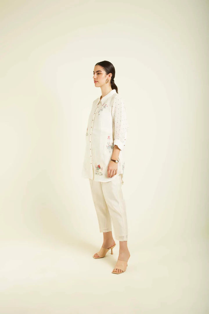 Ivory Shirt In Gauze Linen With Straight Pants In Silk Chanderi