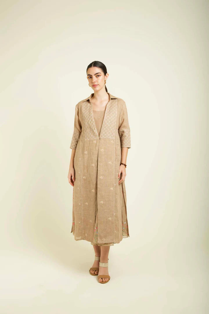 Beige Gauze Linen Jacket With Embroidery And Tier Dress In Mul Chanderi
