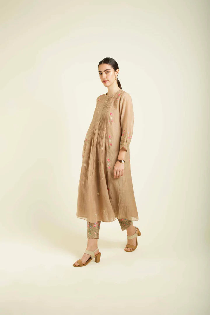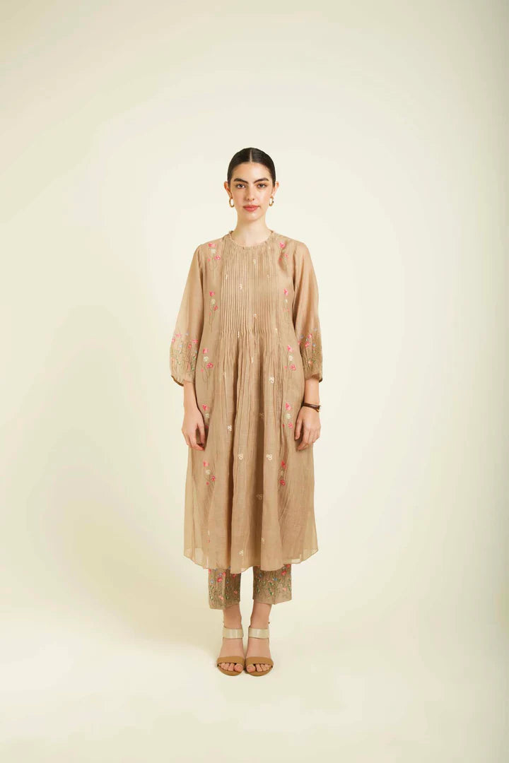 Beige Mul Chanderi Pleated Tunic With Straight Printed Pants In Silk Chanderi