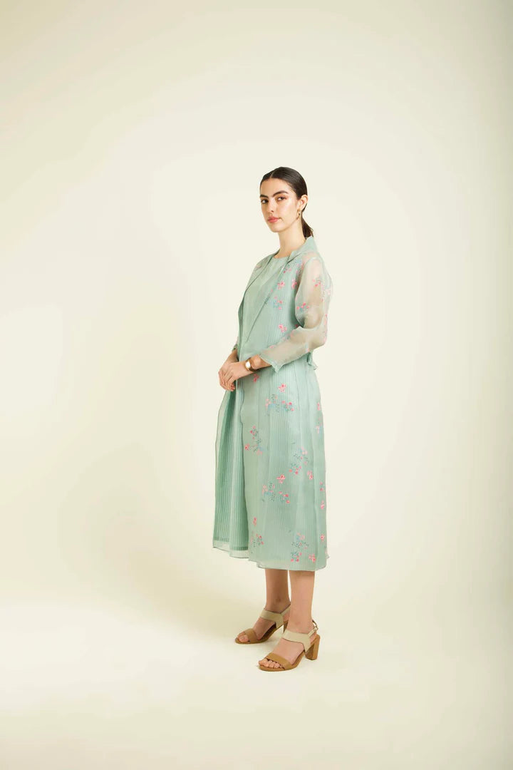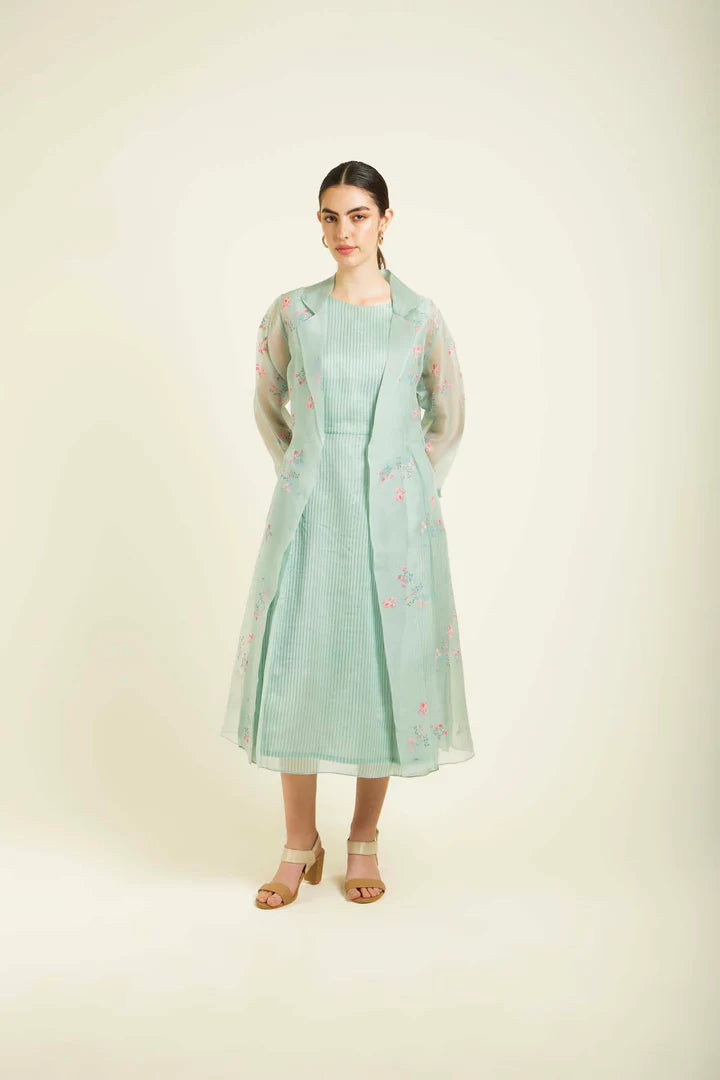 Mint Printed Organza Jacket With Plain Dress In Stripe Organza